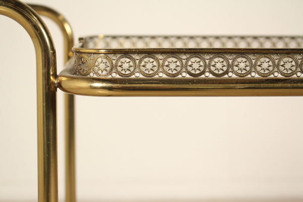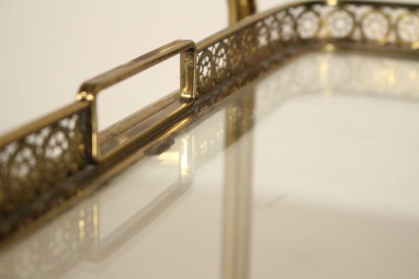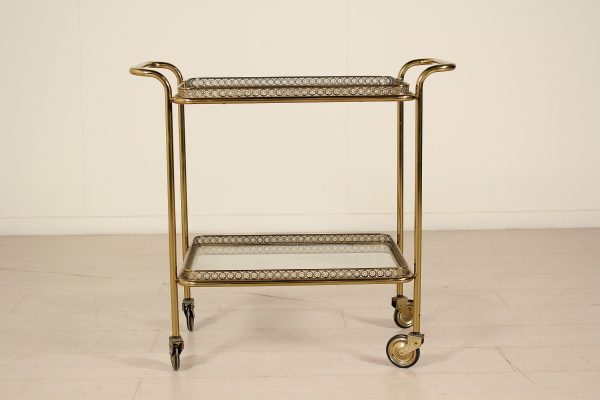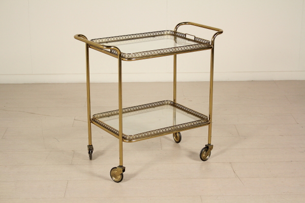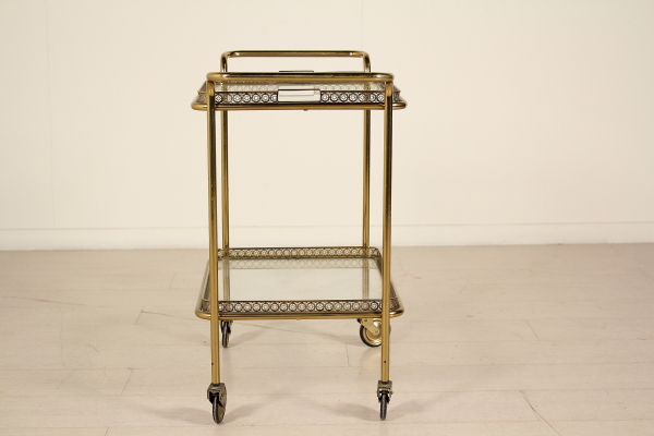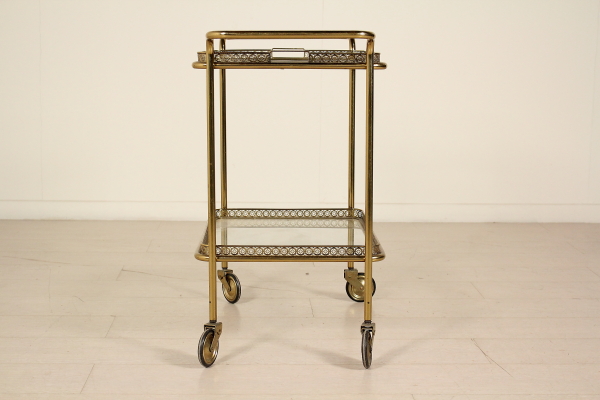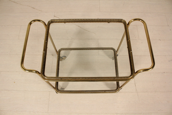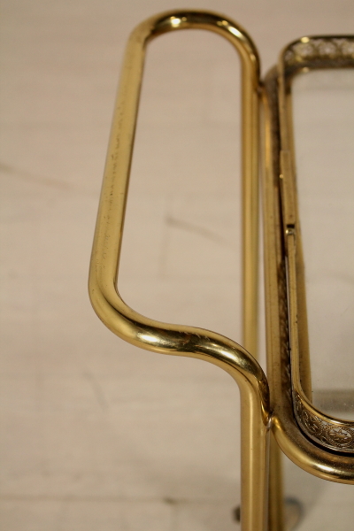 Carrito de servir; latón, vidrio. Buen estado, muestra pequeñas señales de desgaste.