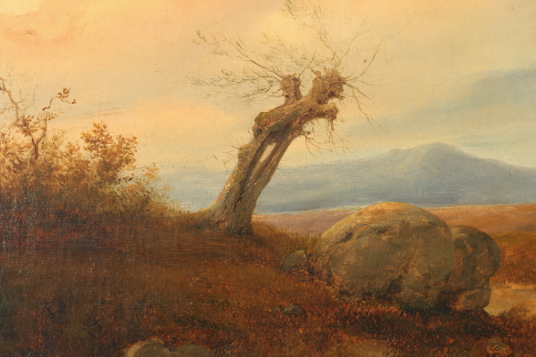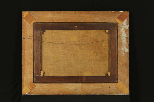 Massimo D'azeglio, que se atribuye. Paisaje con figuras en la calle. Óleo sobre lienzo. El trabajo se encuadra en la producción de paisajes melancólicos de inspiración romántica, juega con los contrastes de luz; el sujeto es más popular, en comparación con la producción en un tema histórico más característico de la artista. Ritelata y restaurado, y se presentan en su totalidad estilo de marco.