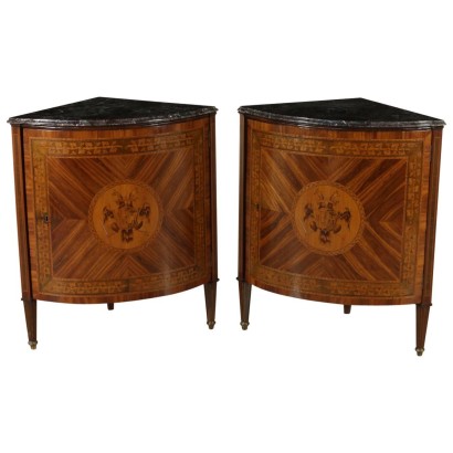 Paire de porte d’entrée qui se compose d’une courbe d’encoignures en haut en violation, tronqué pieds coniques. Les meubles sont plaqué en bois de rose avec une grande centrale de réserve où est incrusté un blason avec l’aigle bicéphale couronnée, contenant à son tour deux écussons (famille impériale et l’aigle couronné en bande jaune) et Invrea (Château de tourelle avec plan central). Les emblèmes, les index du mariage entre les deux familles, sont insérés dans une bordure de feuille de chêne incrusté de cadre, une grande couronne est incrustée de pampres avec des feuilles de vigne. Bagues en laiton habillent vos pieds, les intérieurs de pin.