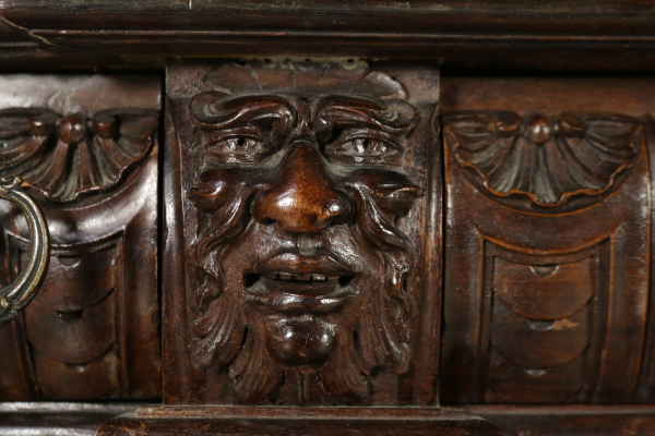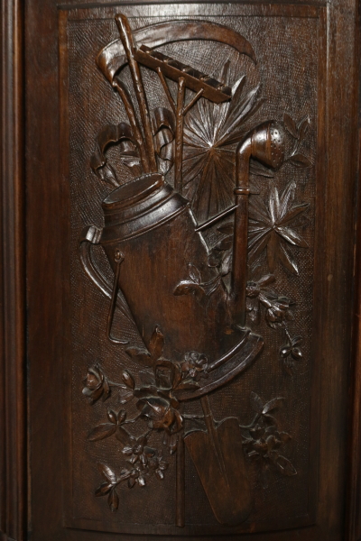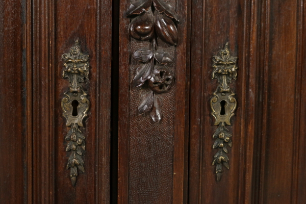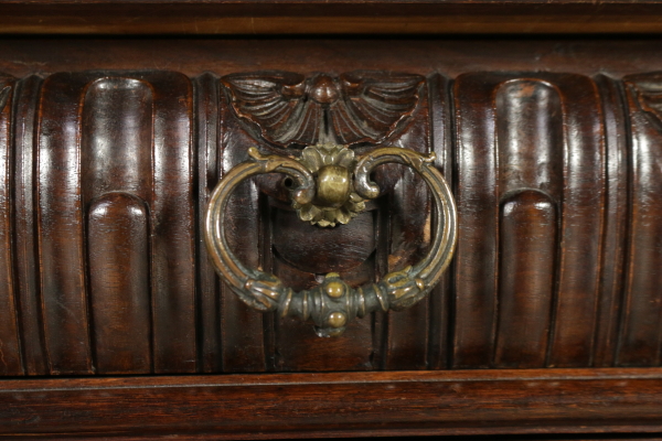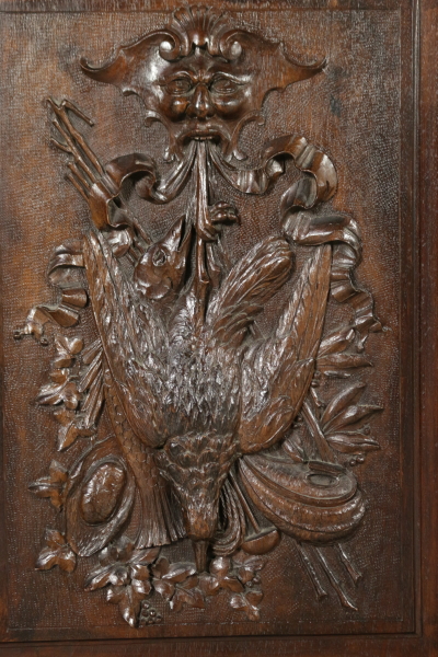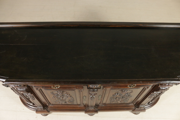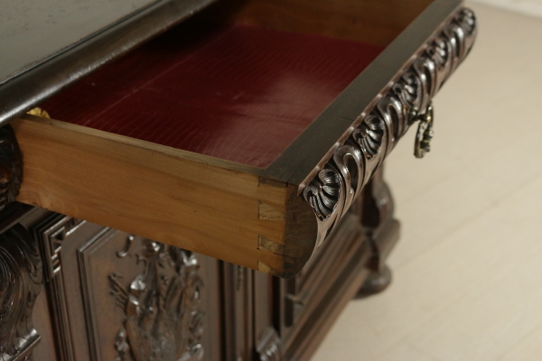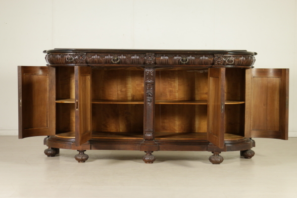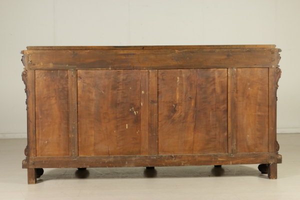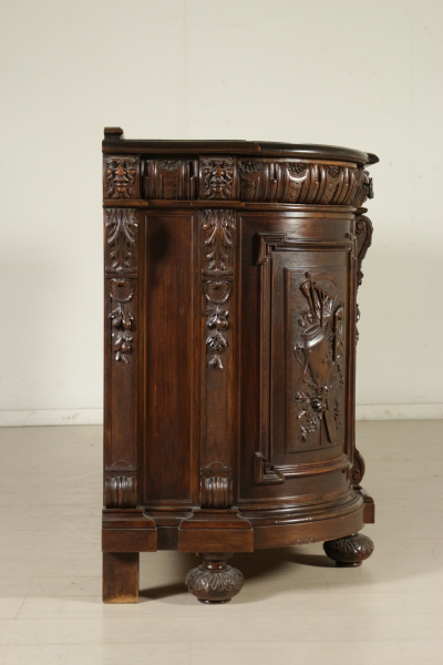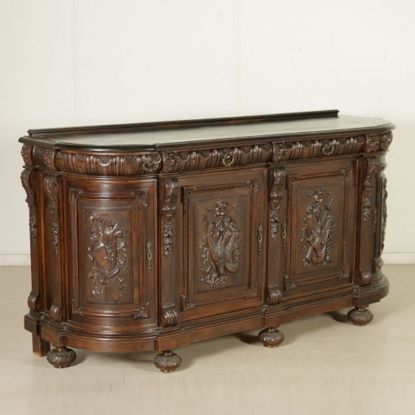 Il a quatre portes avec panneaux sculptés de scènes de chasse et panopie, quatre tiroirs avec baccellatura. Piliers avec pilastres et masques sculptés, cerise intérieur. Présentes dans le magasin.