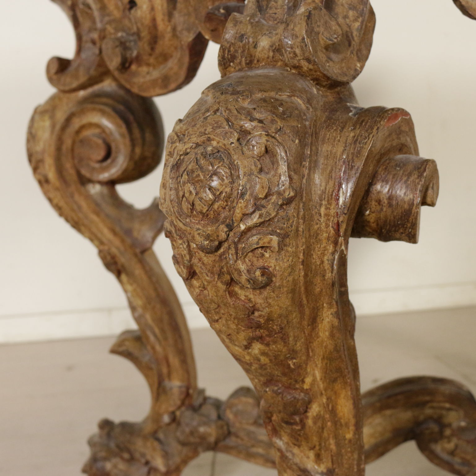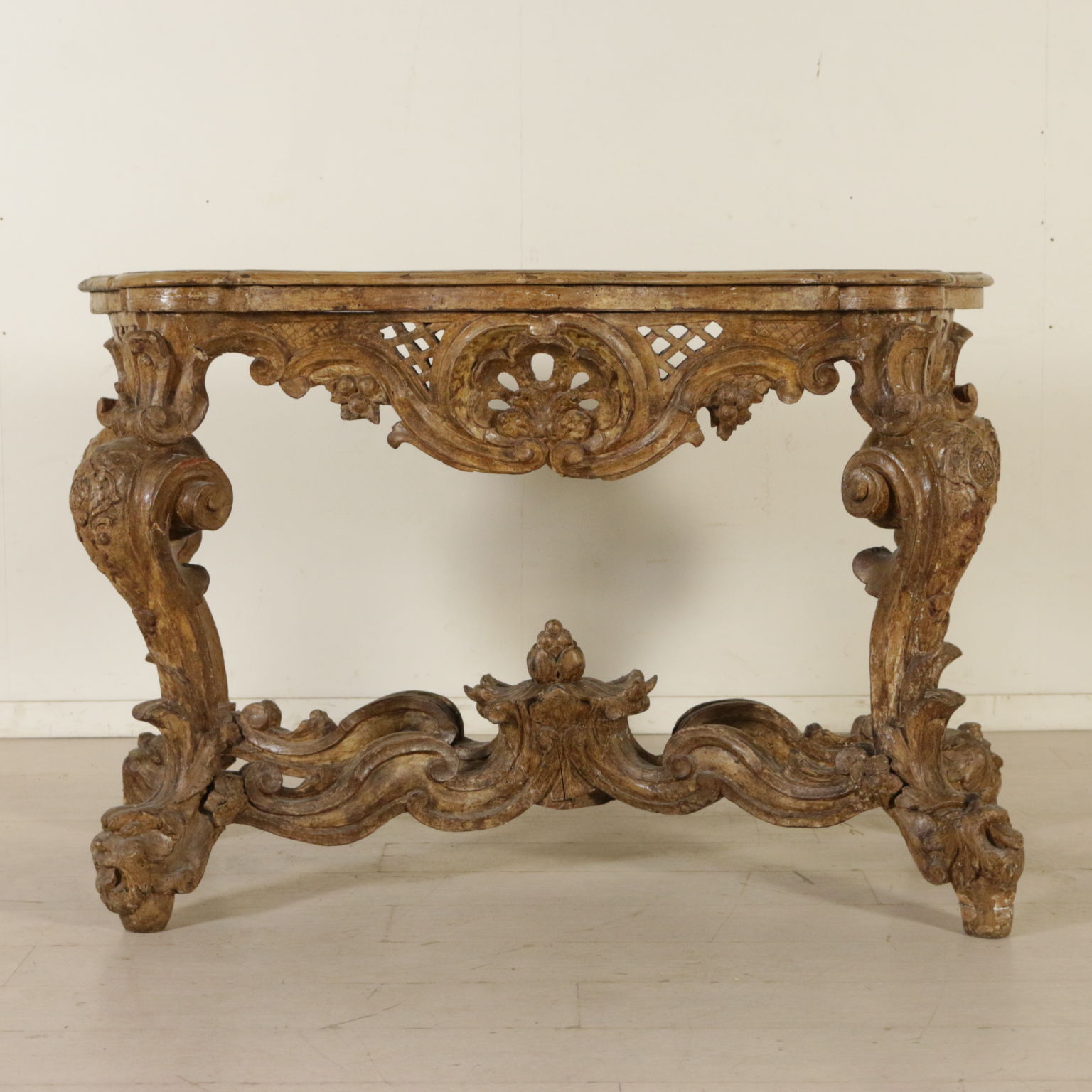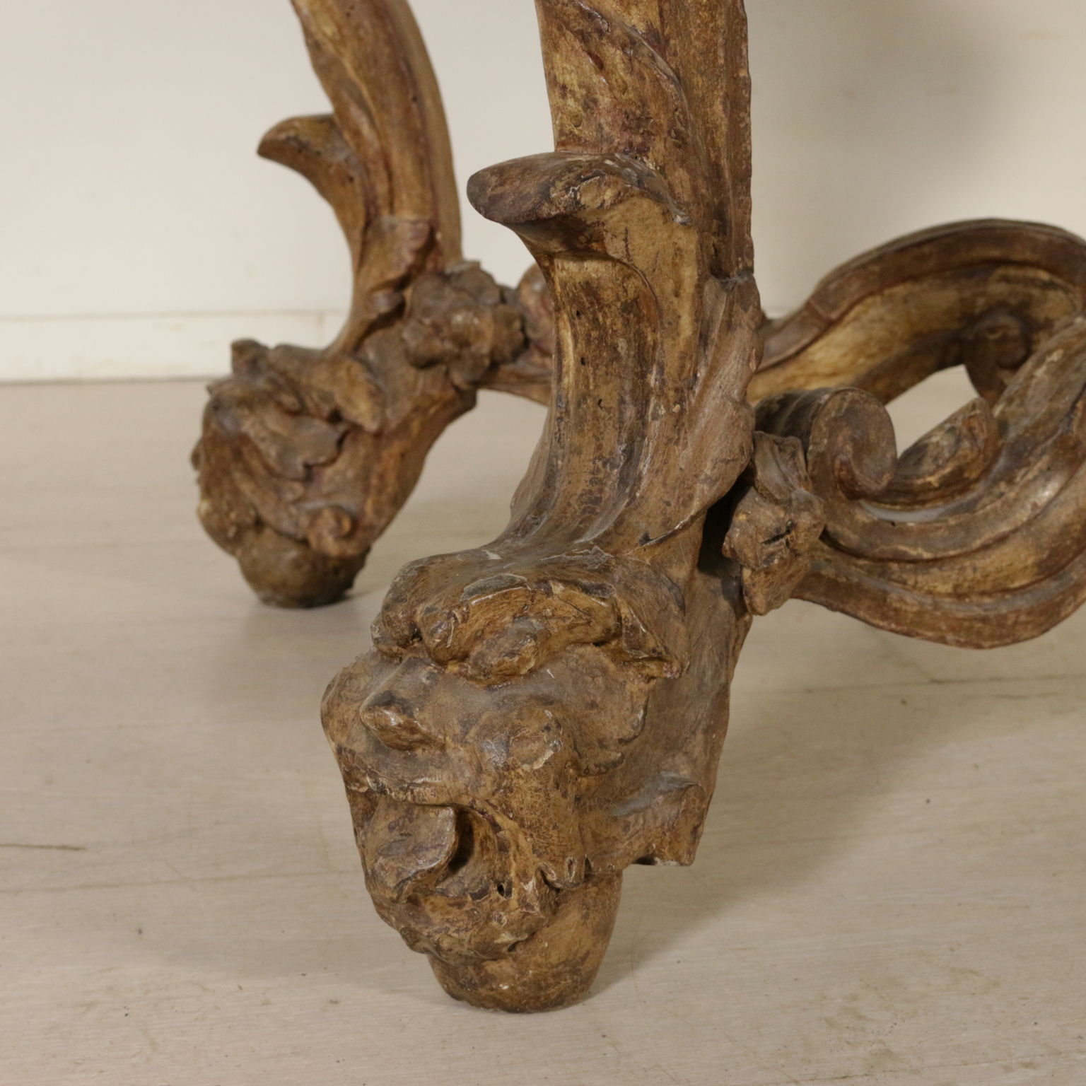 Important console baroque emiliénne; pieds avec volutes à enroulements et terminant avec pieds avec mascarons. Pieds raccordés par croisillon d'entrejambe. Bande mouluré, richement sculpté et ajouré. Partiellement laqué dans la partie inférieure. Traces de dorure. Fabriqué en Italie. XVIIeme siècle.