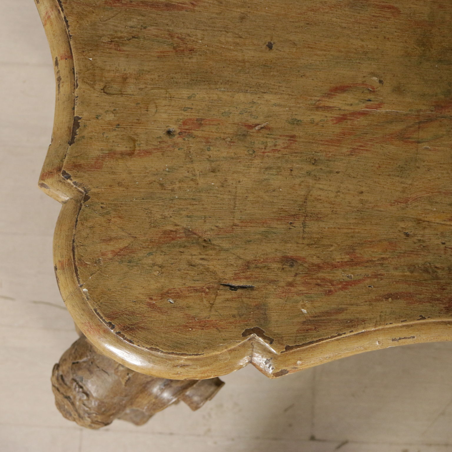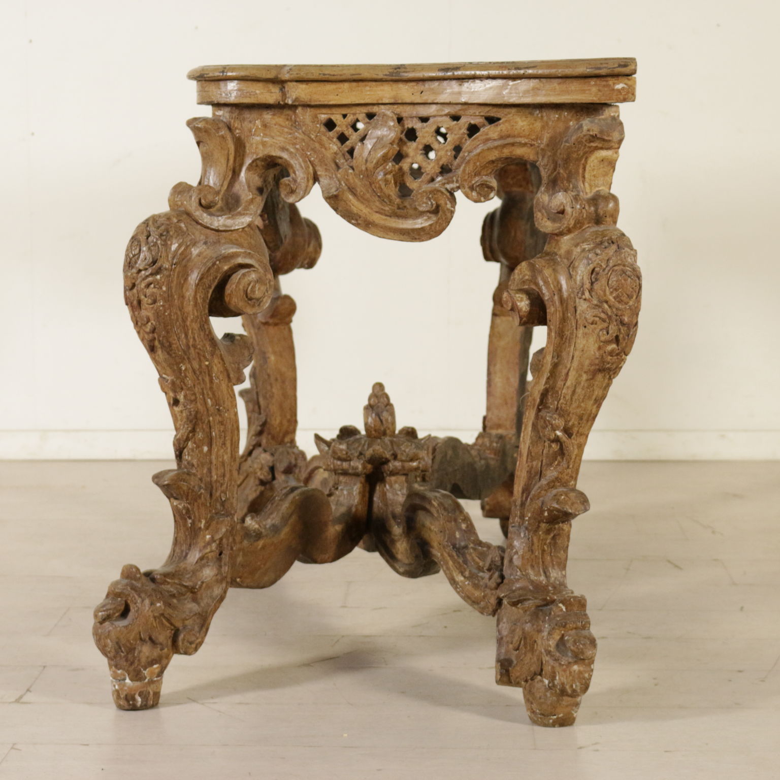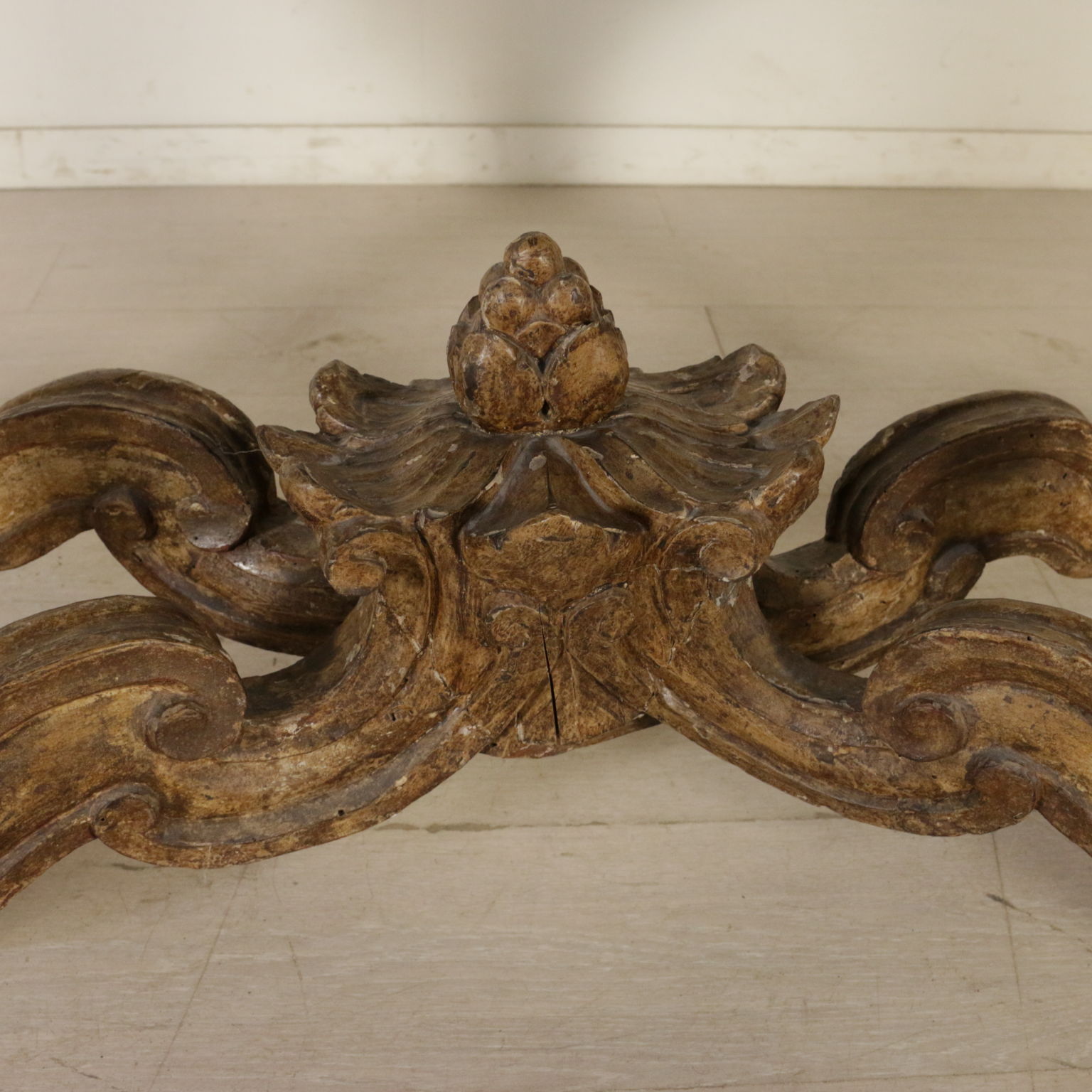 Important console baroque emiliénne; pieds avec volutes à enroulements et terminant avec pieds avec mascarons. Pieds raccordés par croisillon d'entrejambe. Bande mouluré, richement sculpté et ajouré. Partiellement laqué dans la partie inférieure. Traces de dorure. Fabriqué en Italie. XVIIeme siècle.
