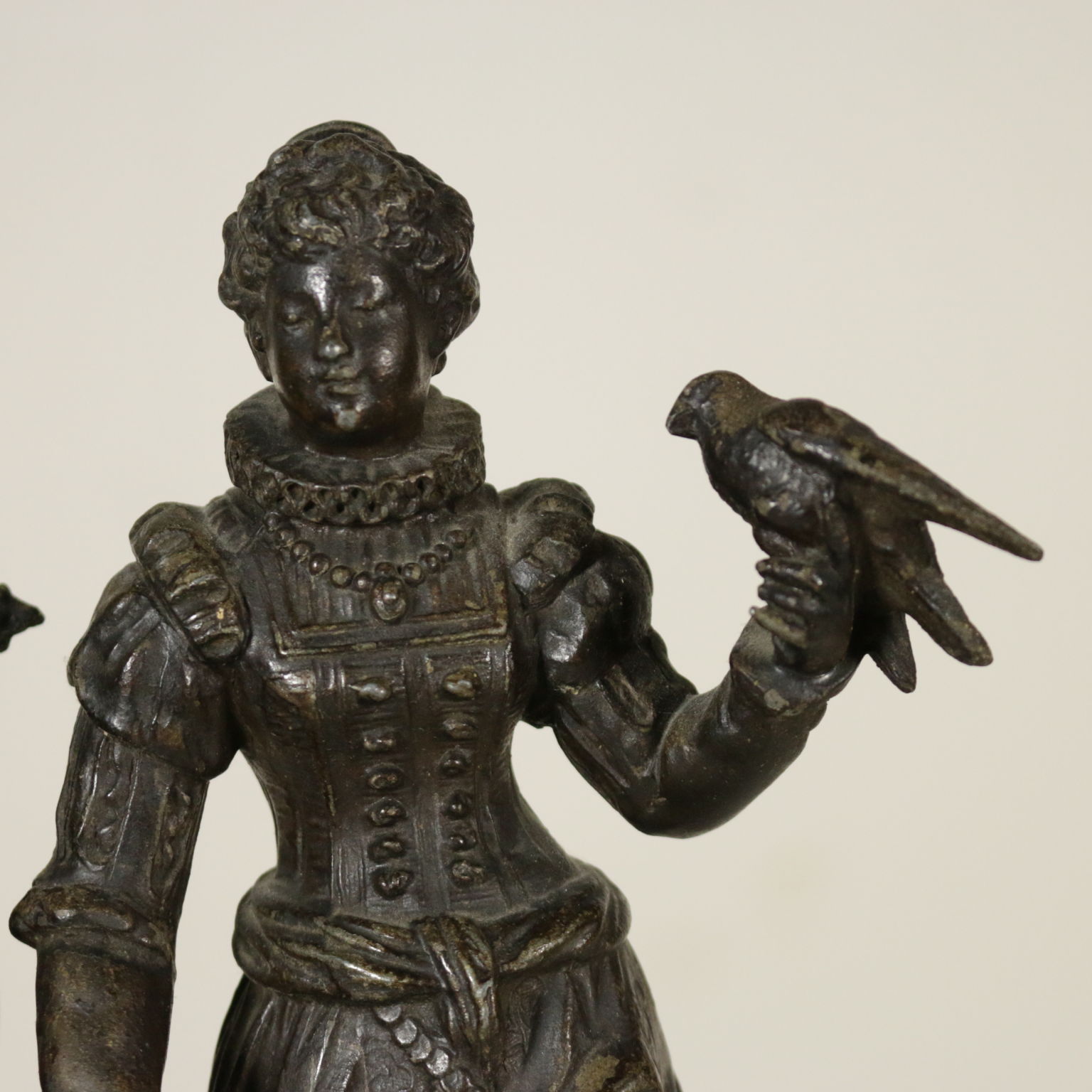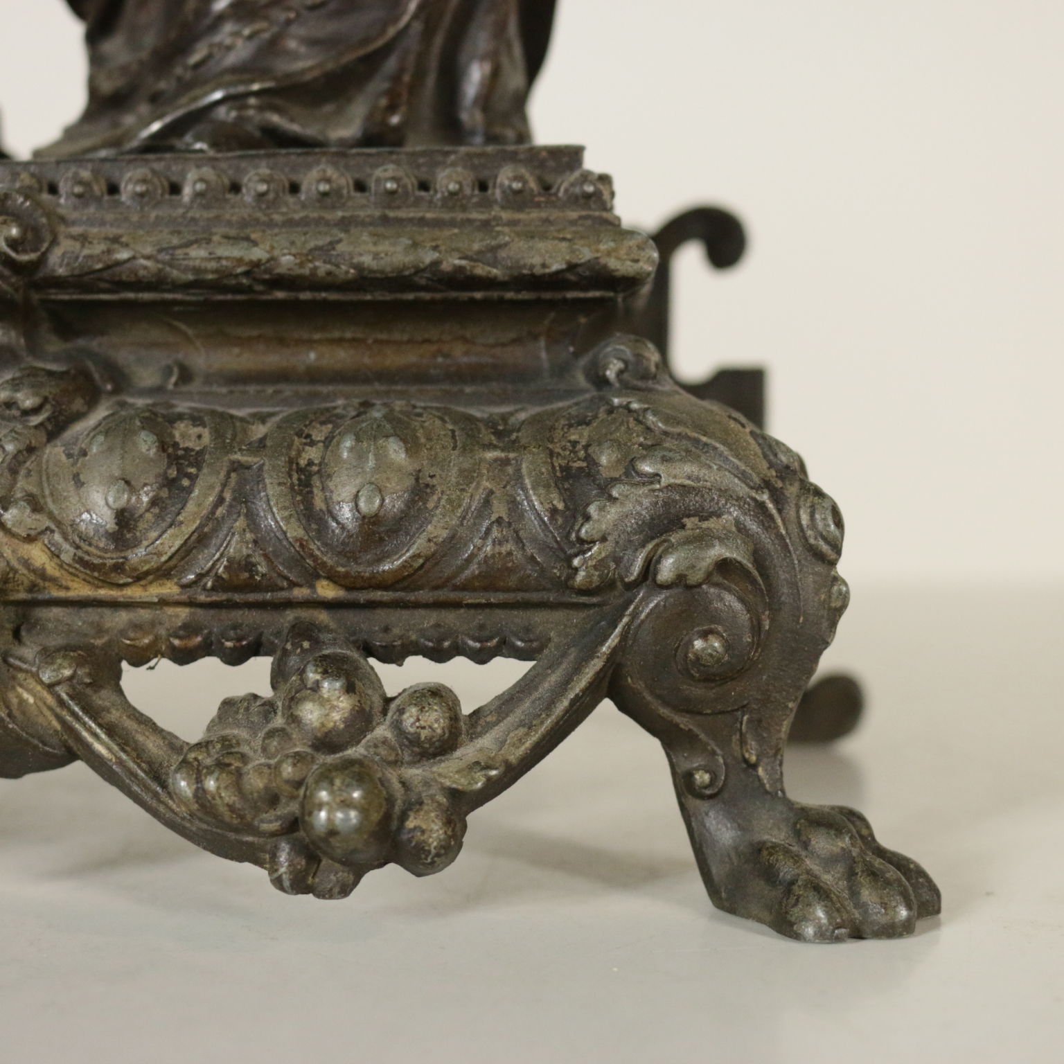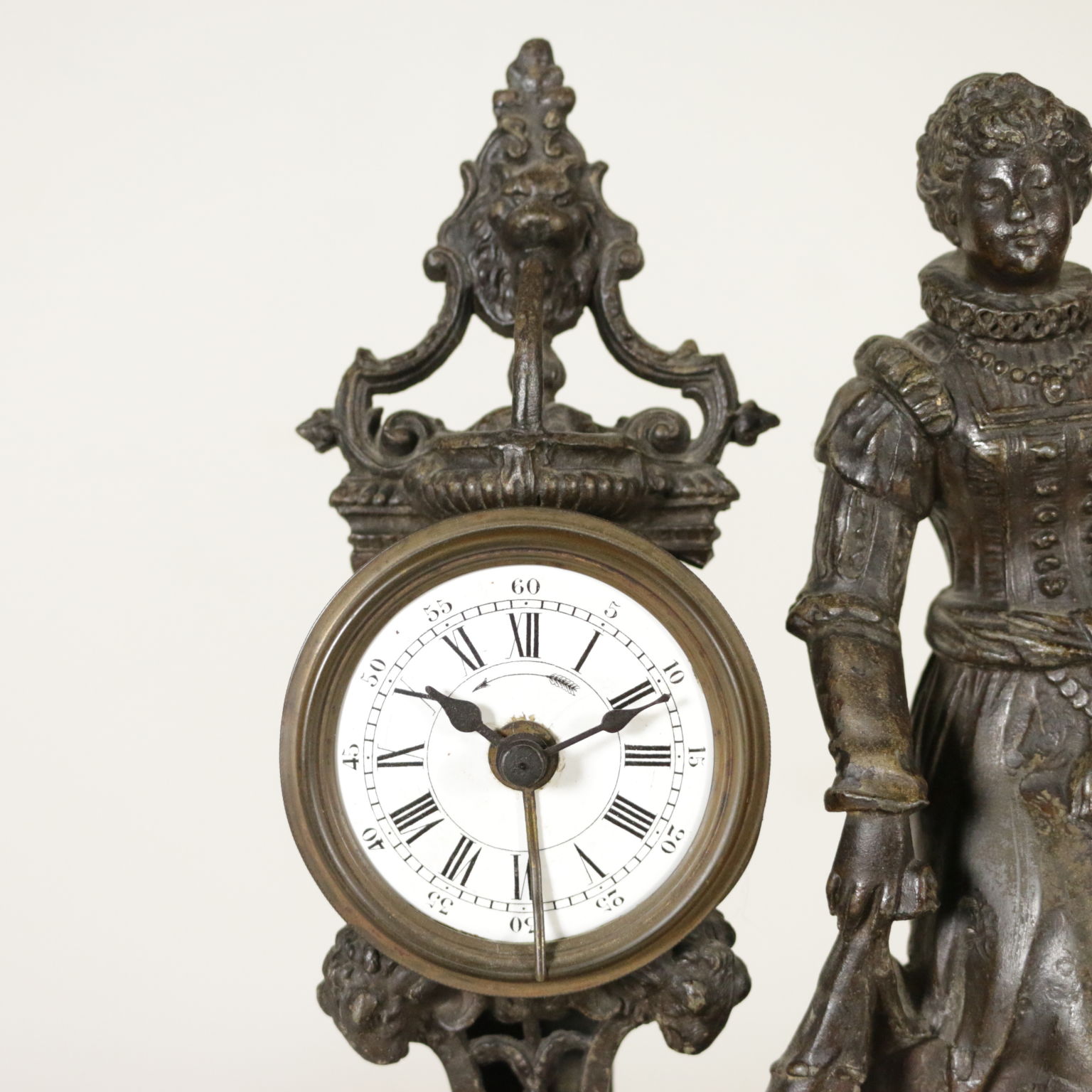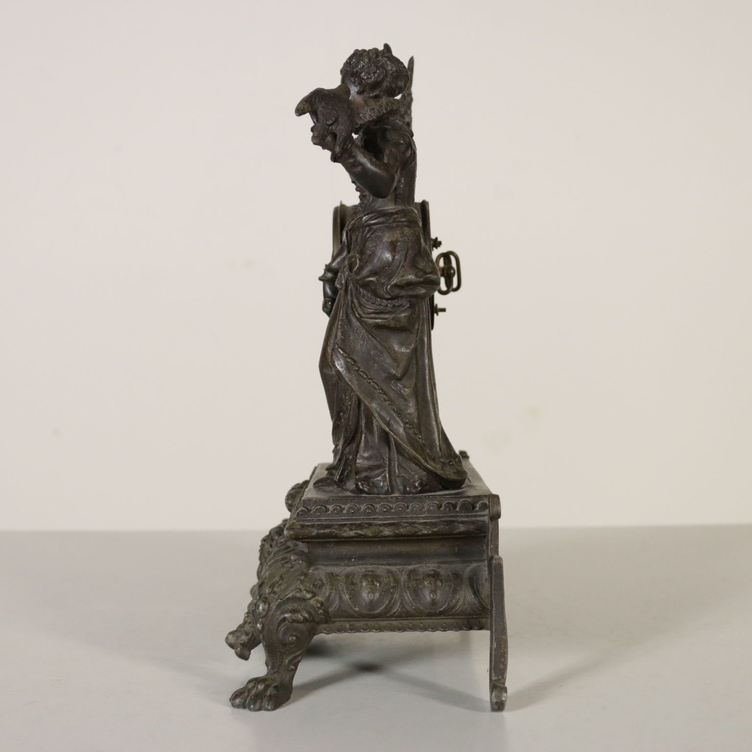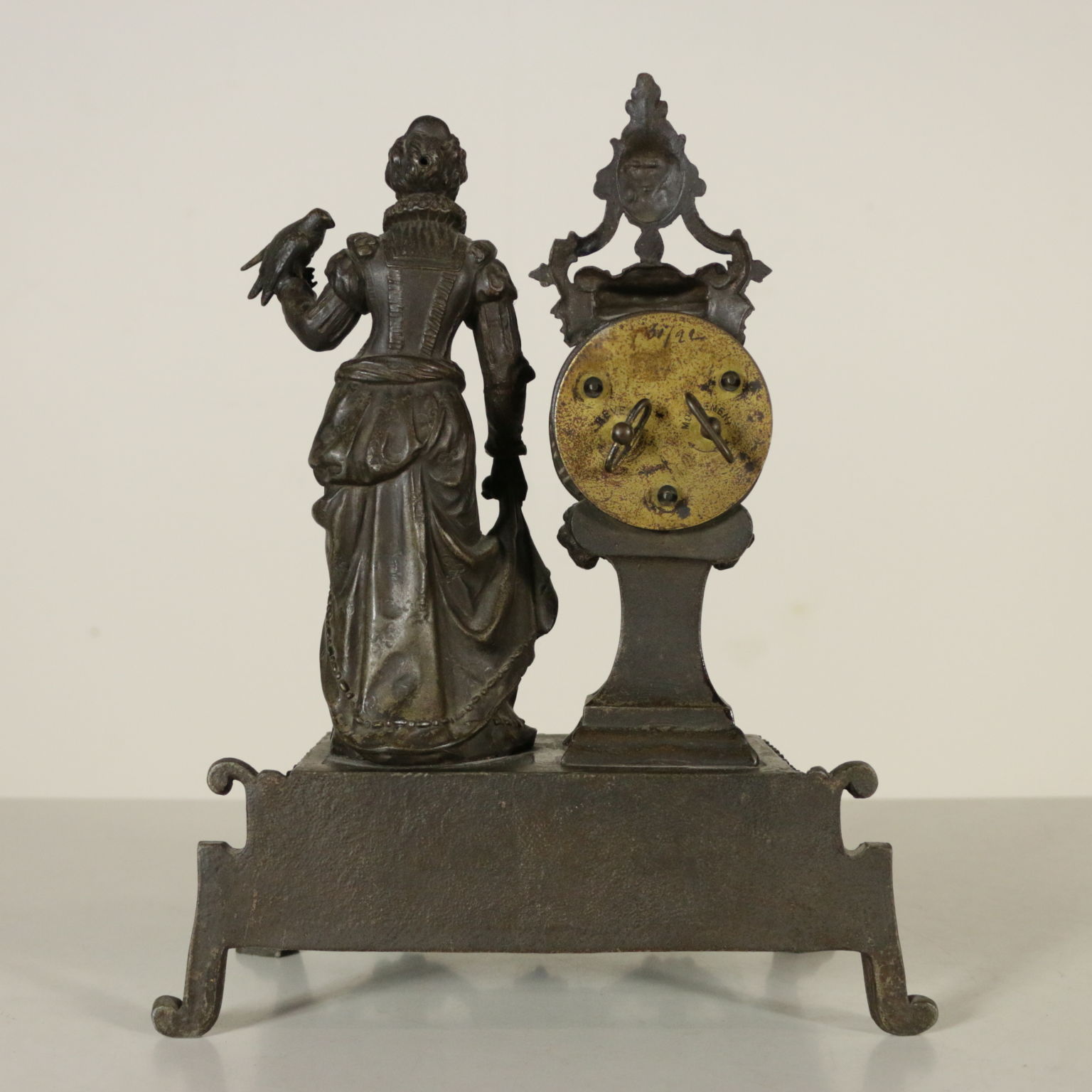 Orologio da appoggio di gusto neorinascimentale in antimonio a patina scura. Base rettangolare con decori a festoni e grottesca su cui poggia una dama con colombo e orologio retto da capitello e sormontato da fontana. Mostrino in metallo smaltato con le ore a numeri romani e i minuti a numeri arabi.