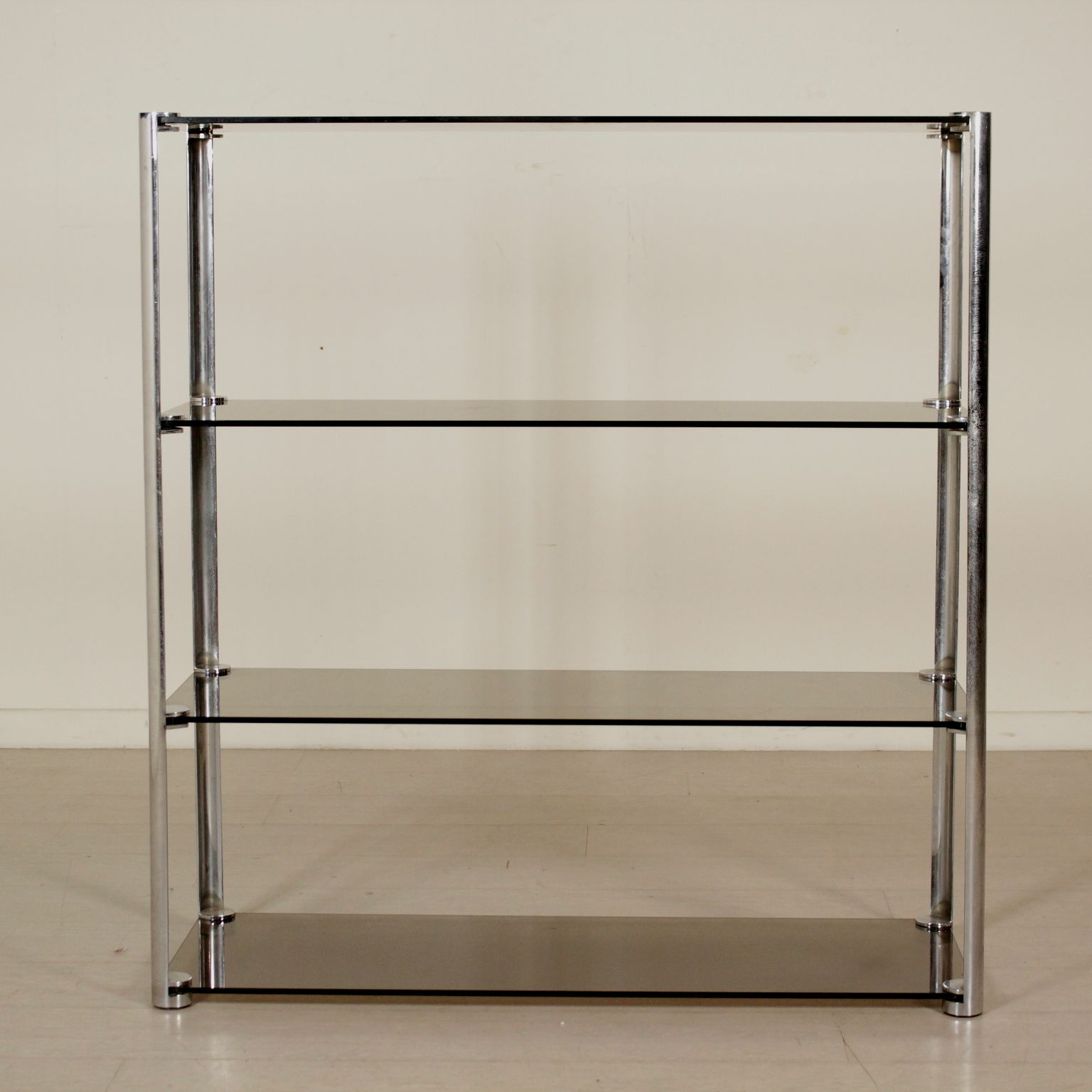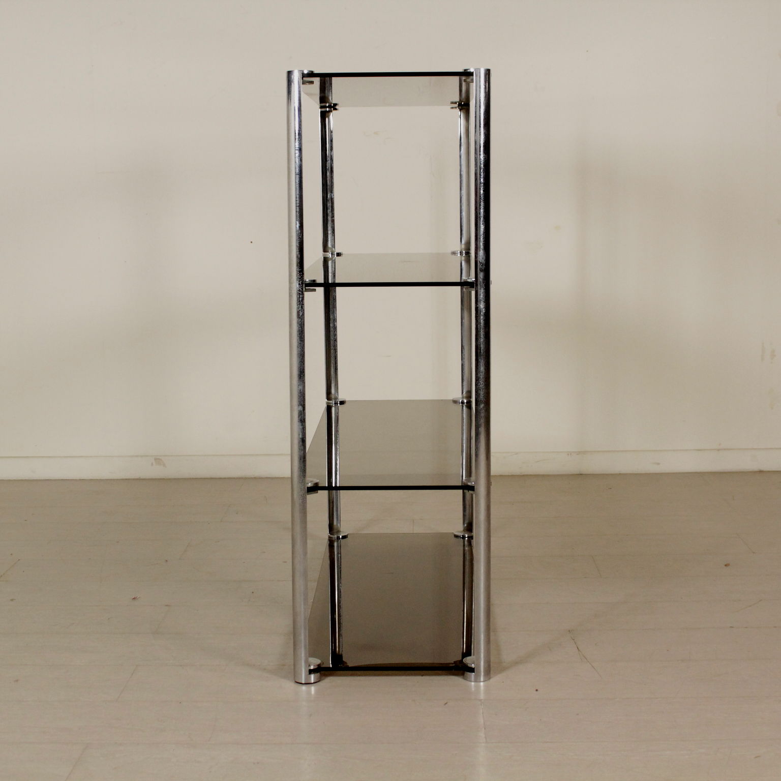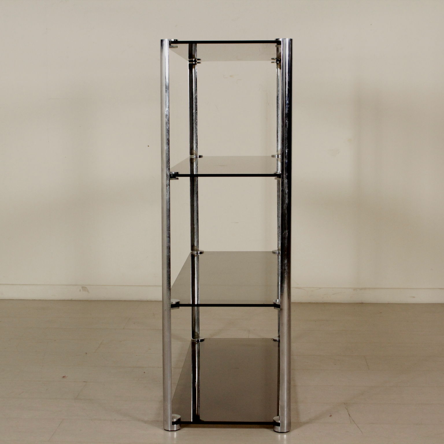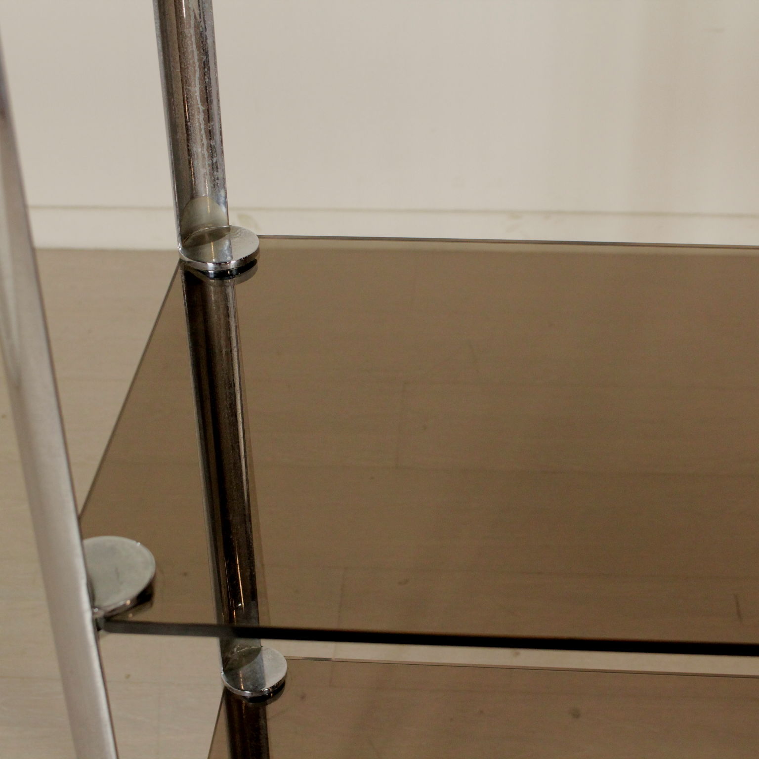 Bibliothèque; métal chromé, verre fumé. Fabriqué en Italie. Années 60.