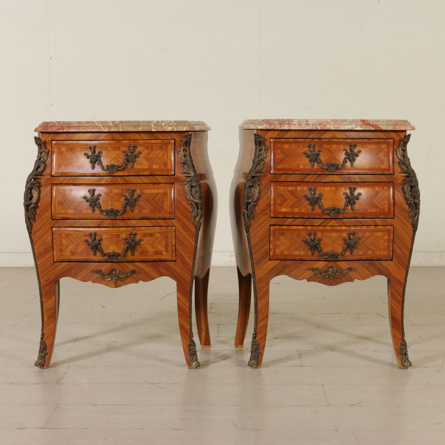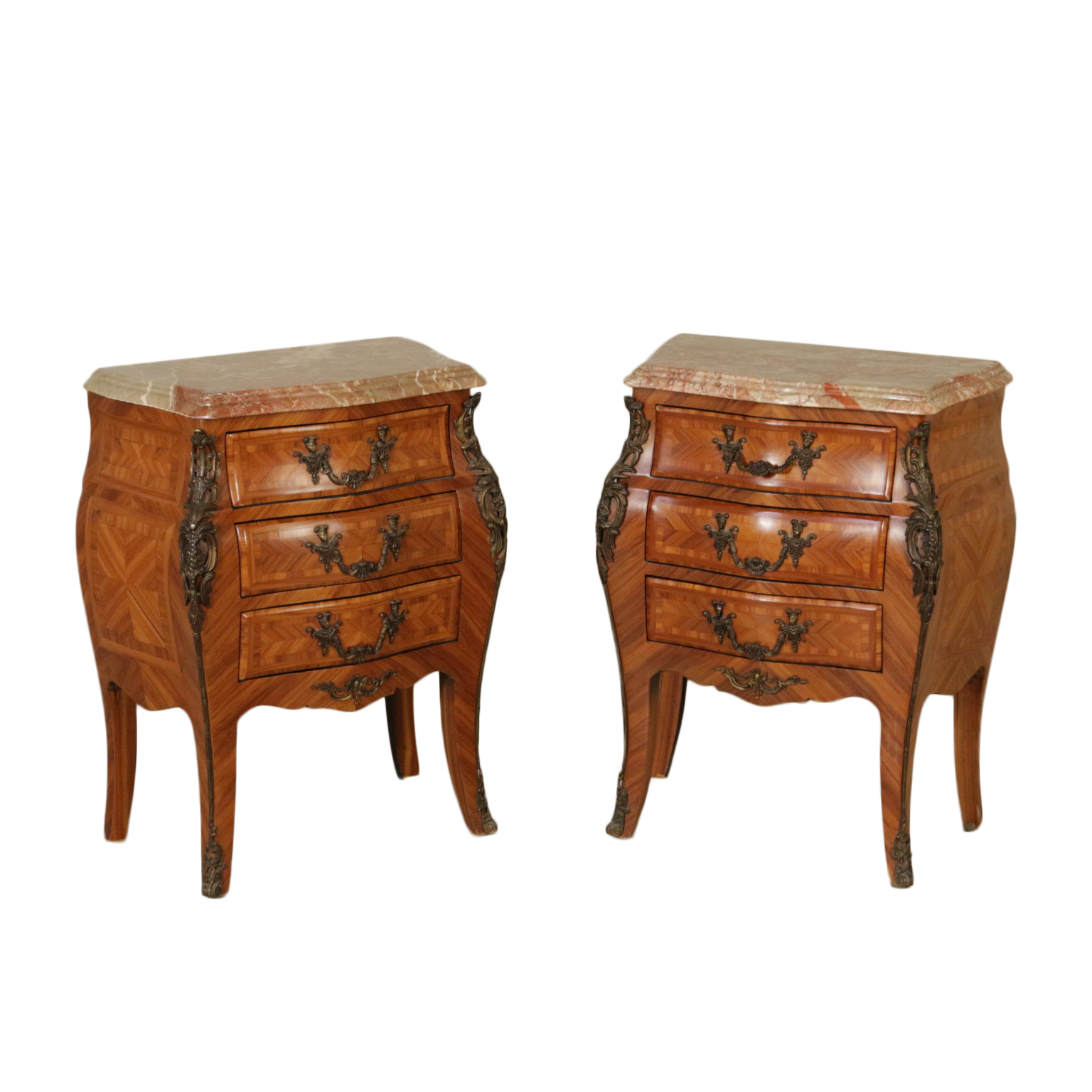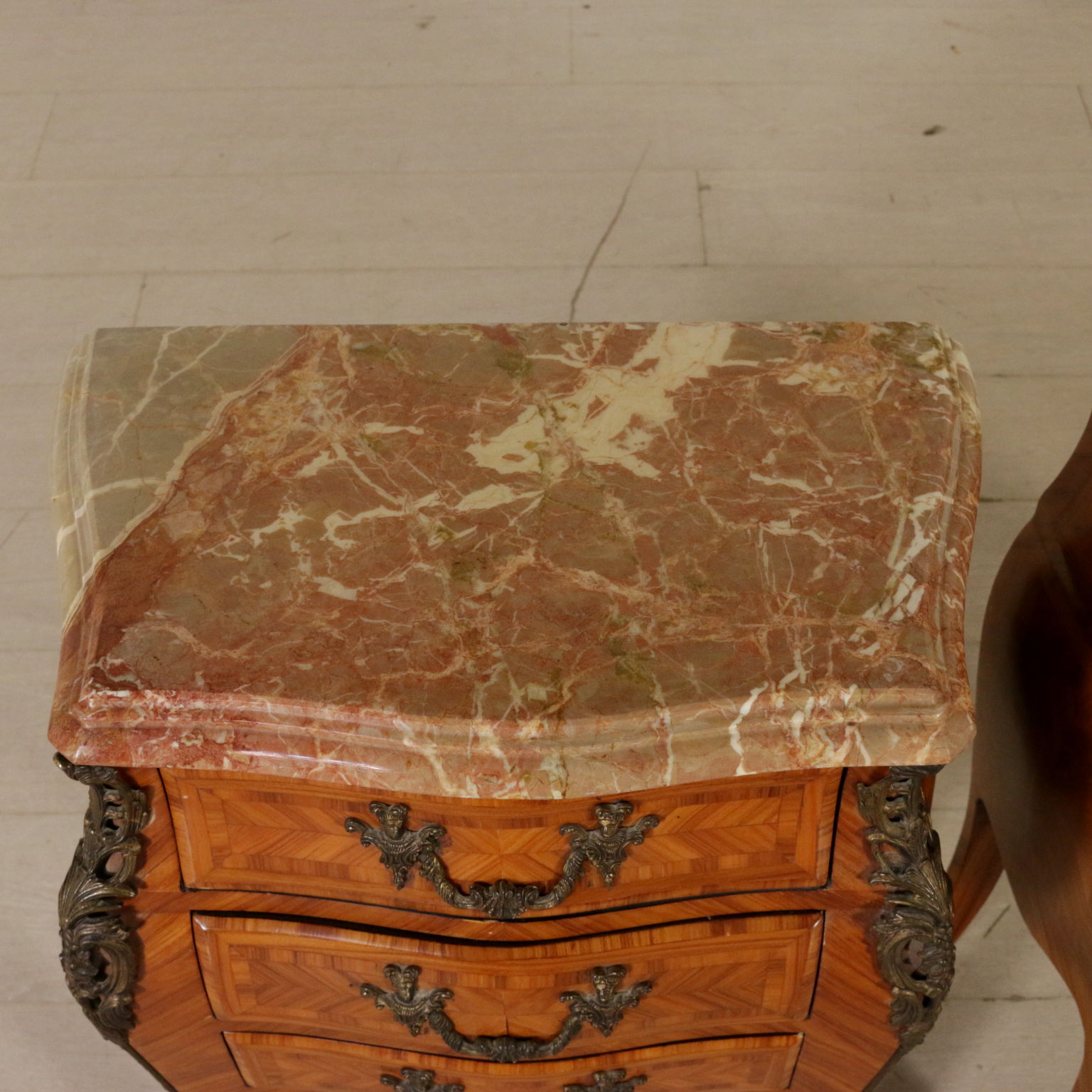 Chevets avec trois tiroirs et plateau en marbre. Frises en bronze. Fabriqué en Italie. XXeme siècle.