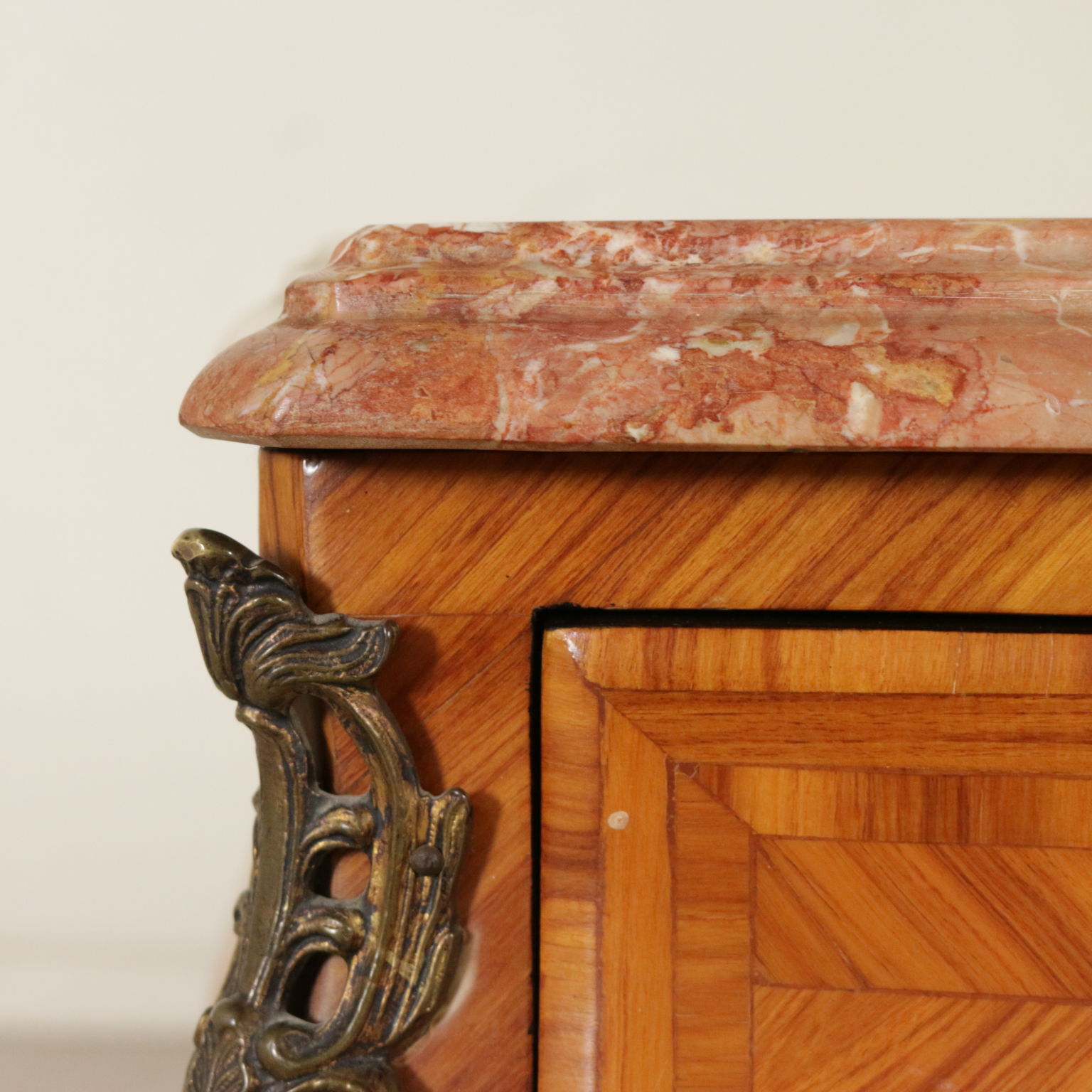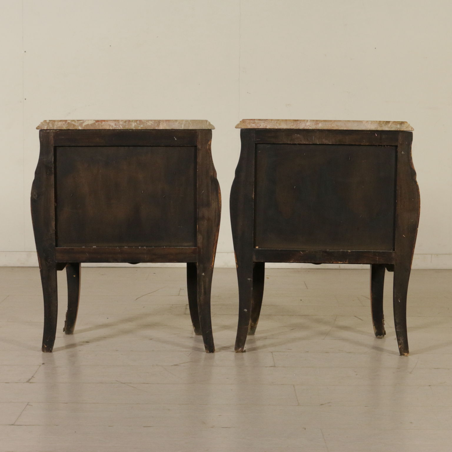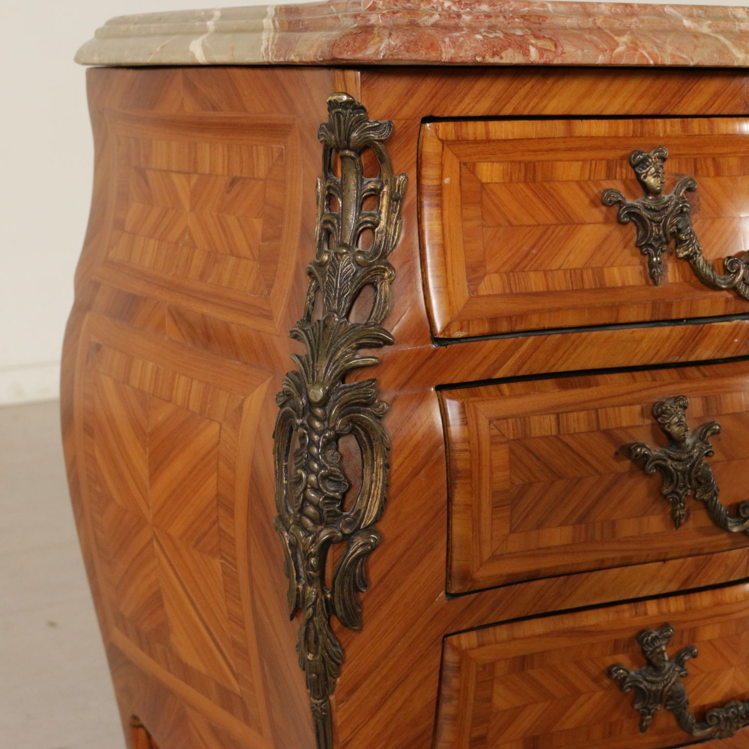 Chevets avec trois tiroirs et plateau en marbre. Frises en bronze. Fabriqué en Italie. XXeme siècle.