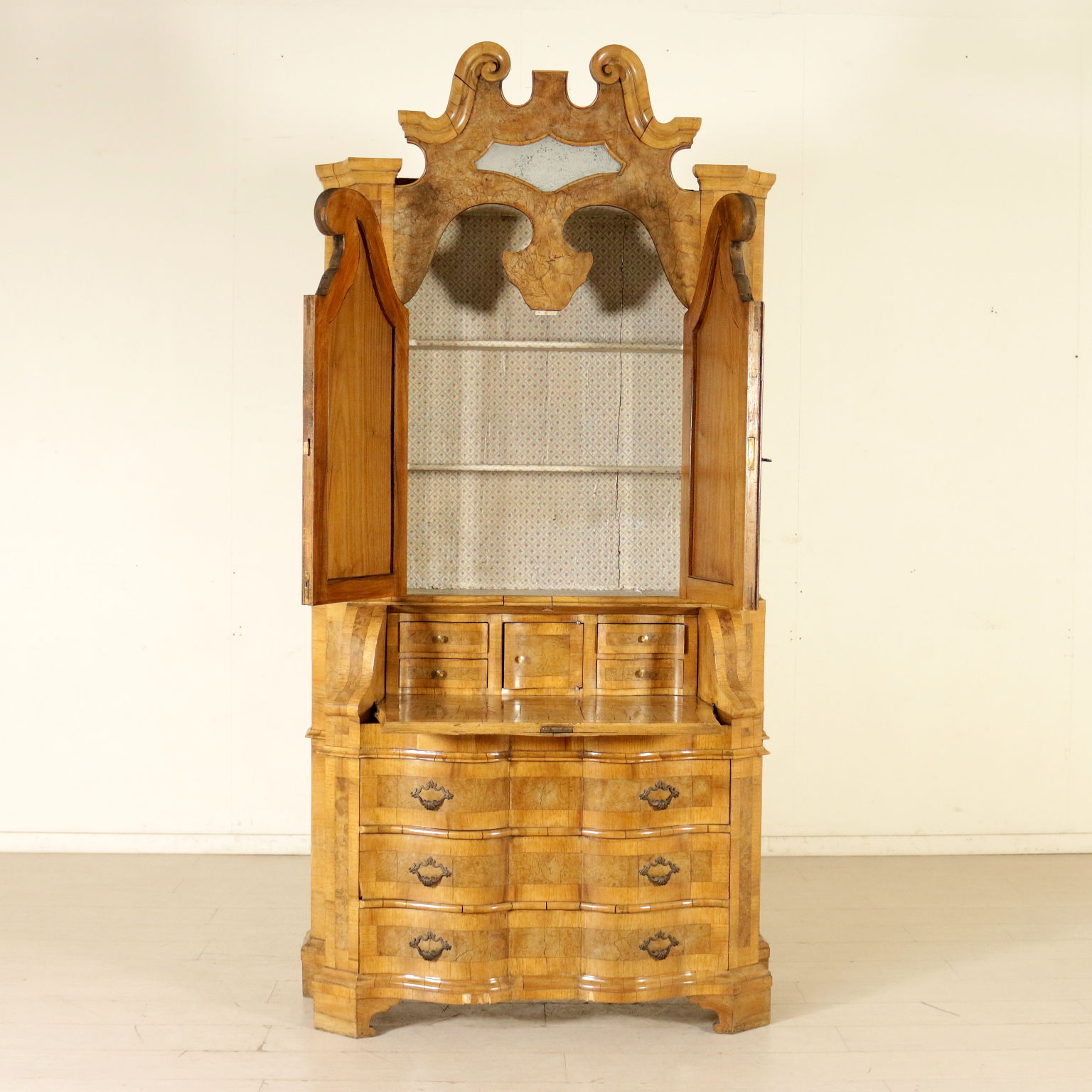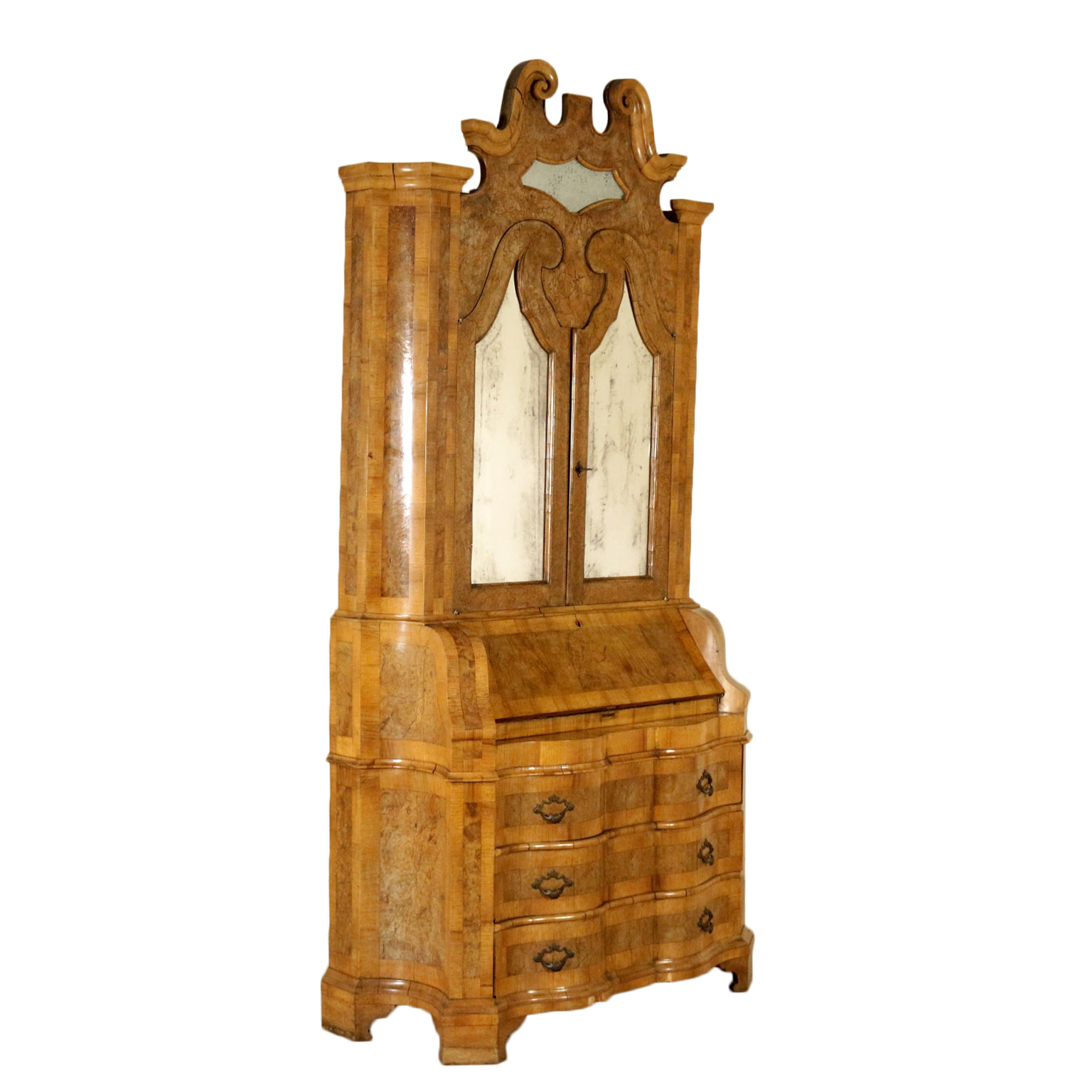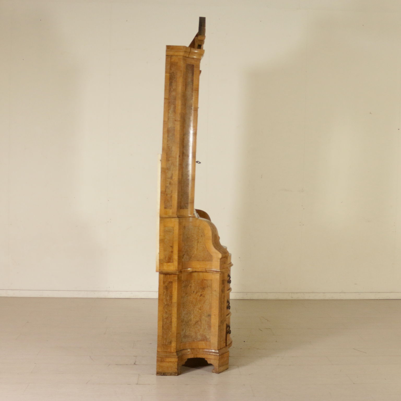 Trumeau remué sur le front et sur les hanches; présente trois tiroirs et portes à la rampe. À l'intérieur quatre tiroirs et petit vantau. La partie superieur présente deux vantaux façonnées avec des miroirs. Cimaise divisé en deux avec miroir. Fabriqué en Italie. XXeme siècle.