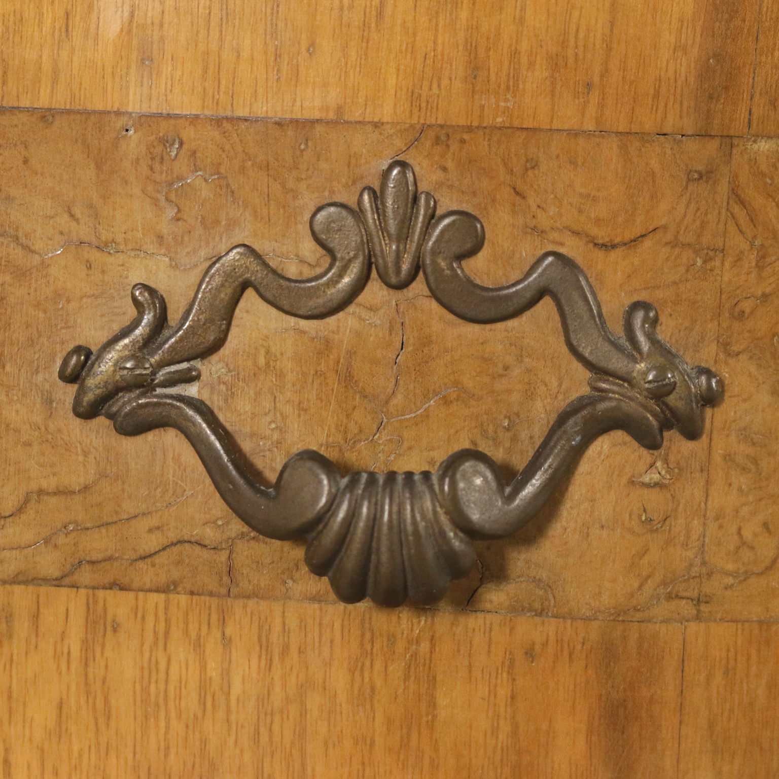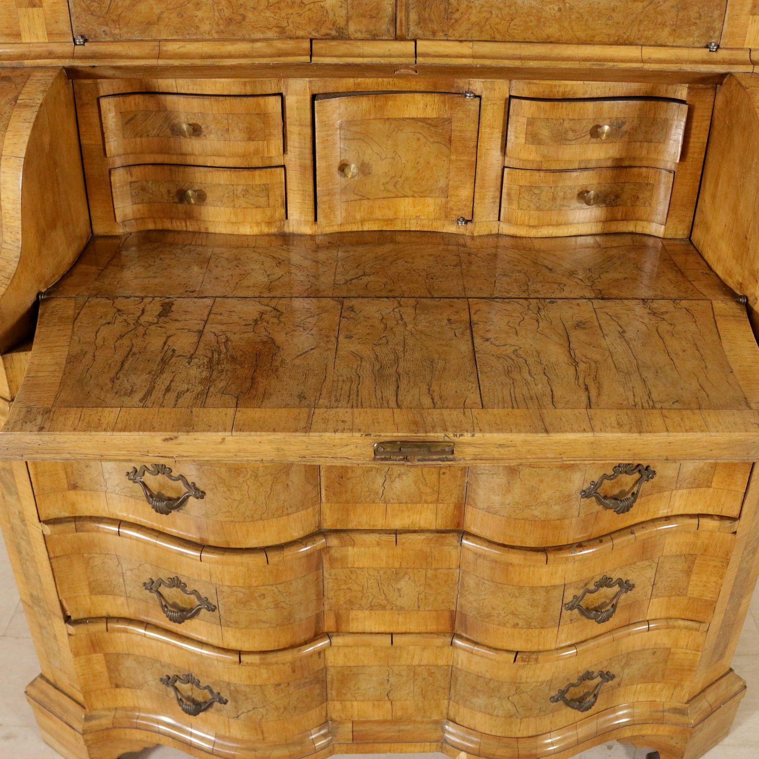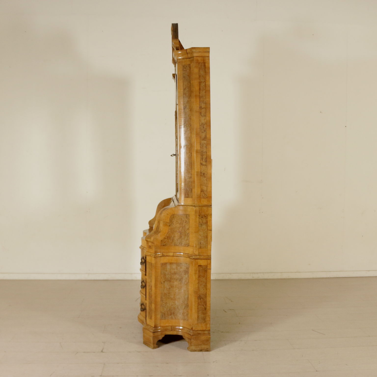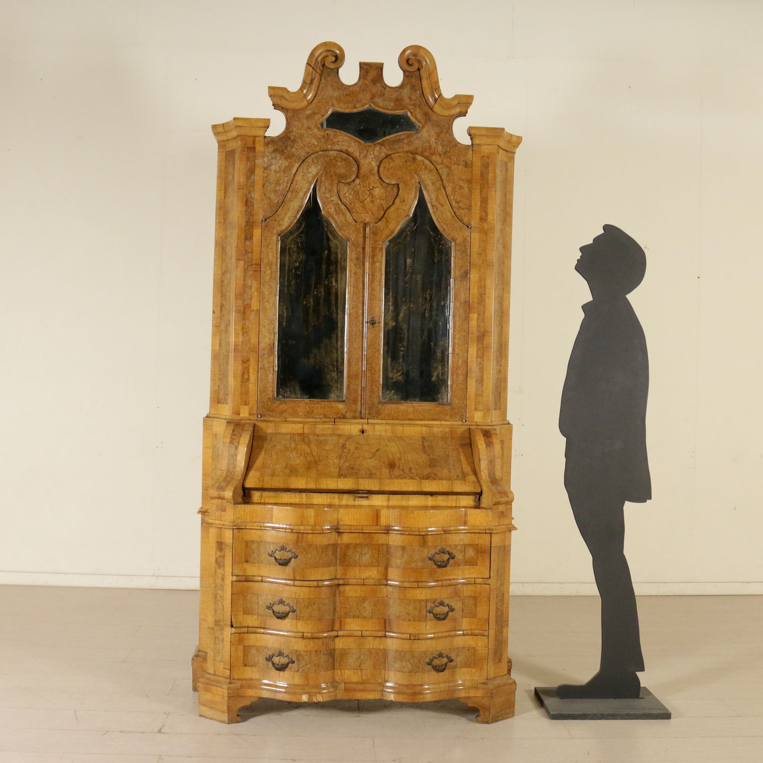 Trumeau remué sur le front et sur les hanches; présente trois tiroirs et portes à la rampe. À l'intérieur quatre tiroirs et petit vantau. La partie superieur présente deux vantaux façonnées avec des miroirs. Cimaise divisé en deux avec miroir. Fabriqué en Italie. XXeme siècle.