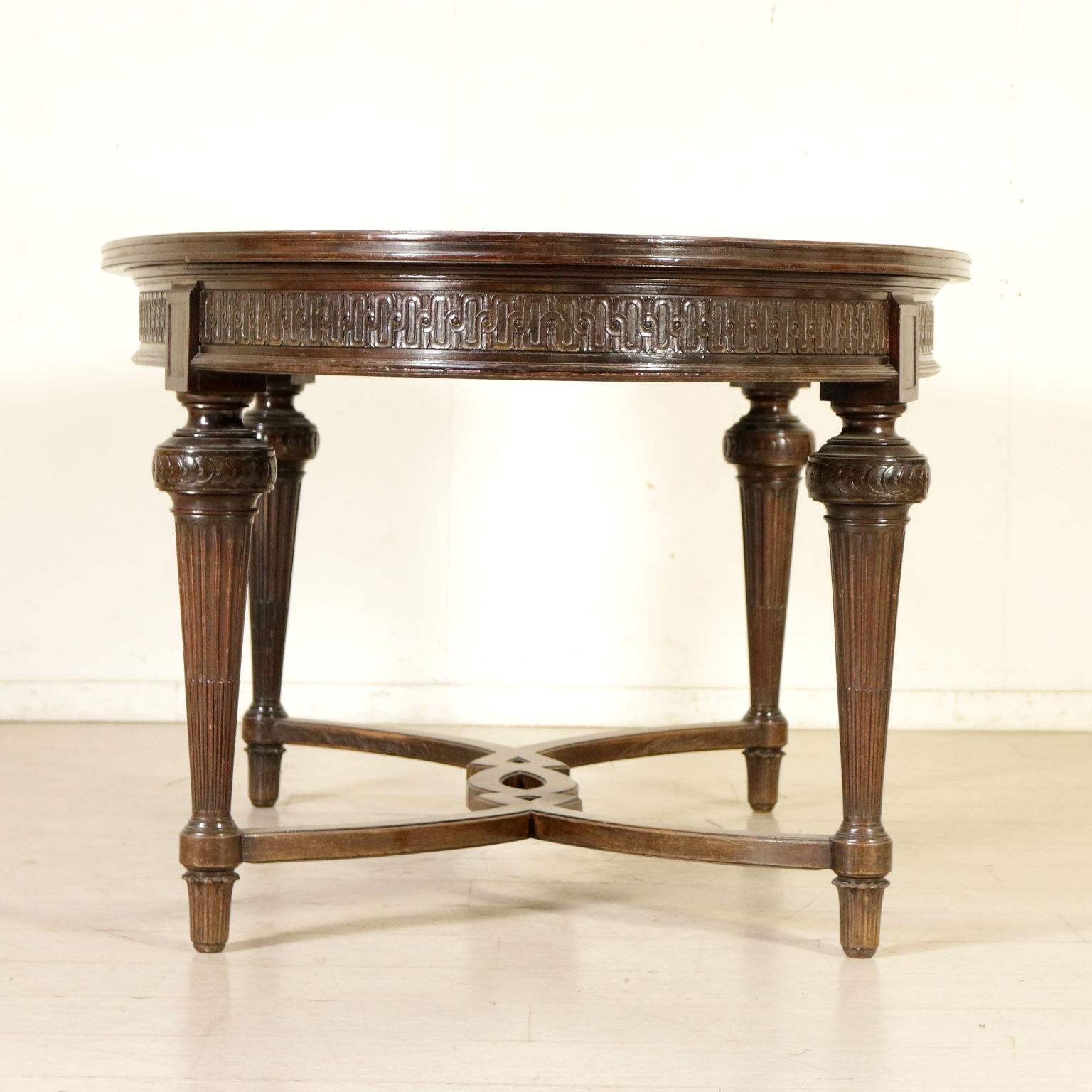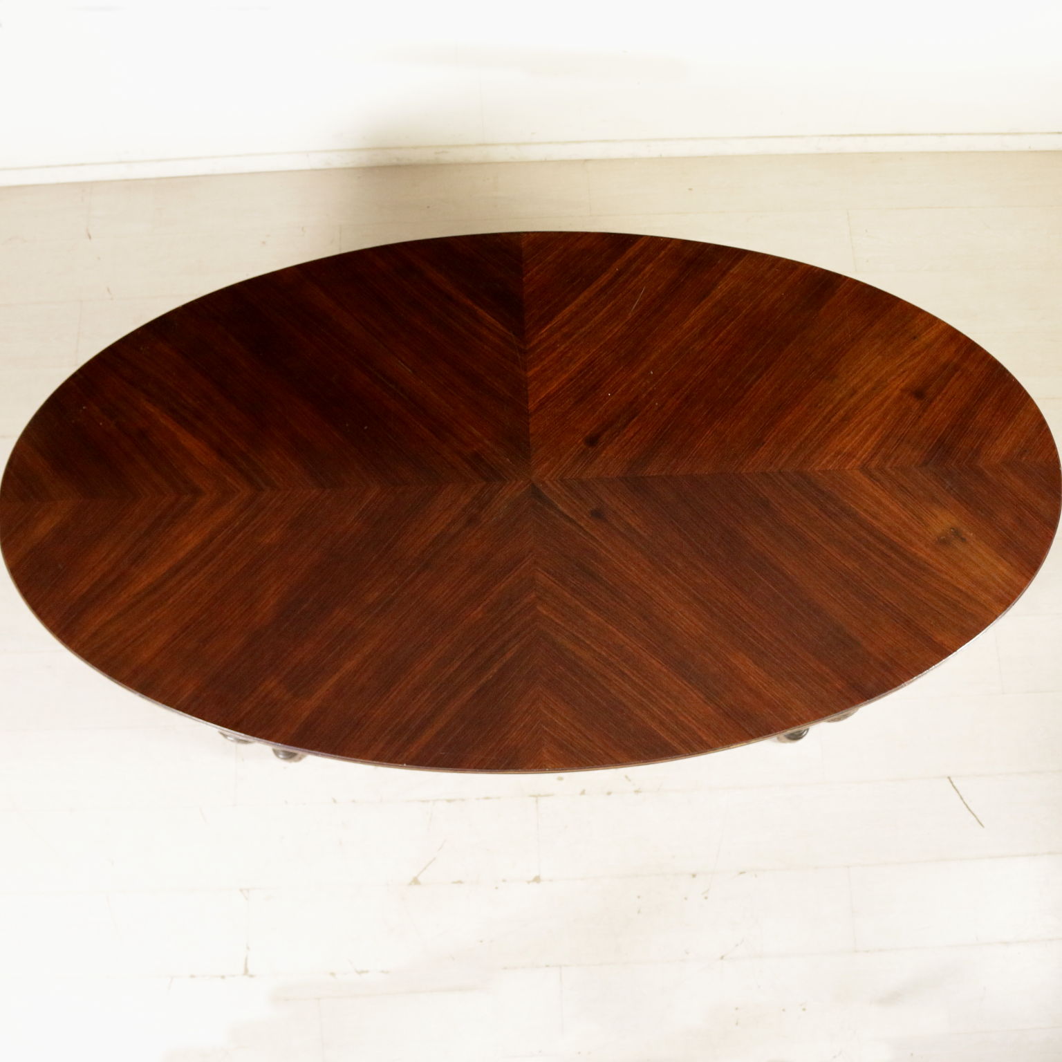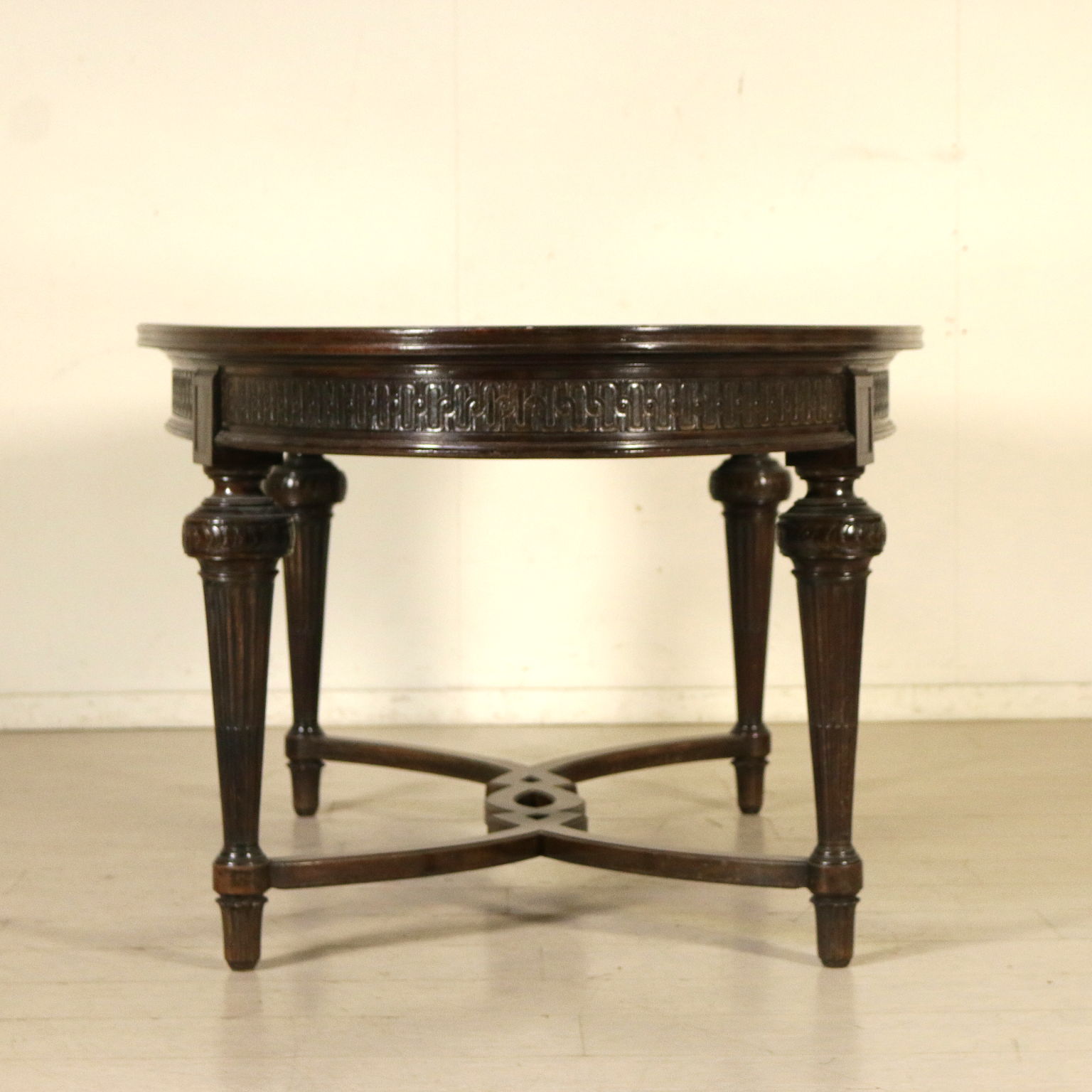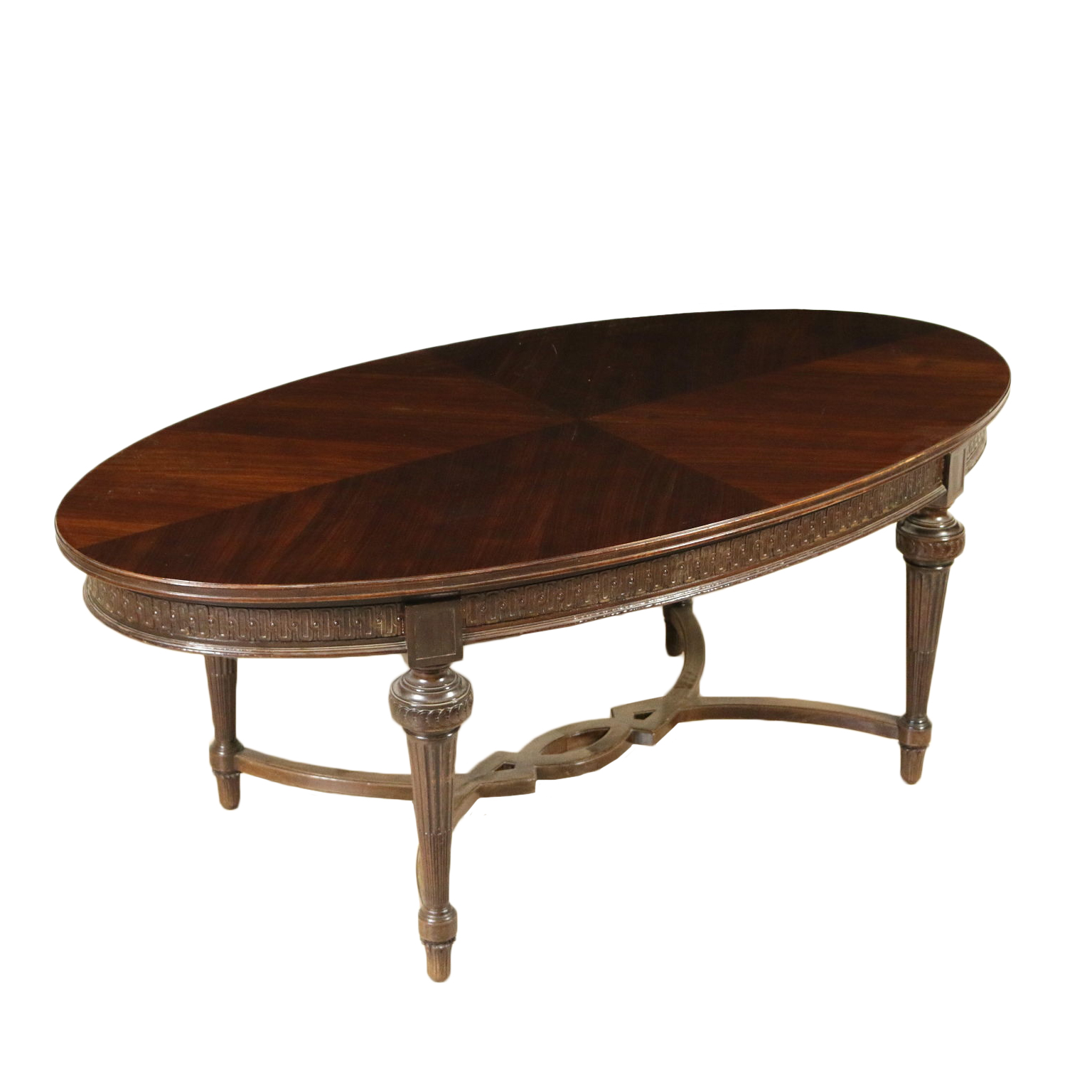 Table en style avec pieds troncoconiques raccordés par croisillon d'entrejambe; dessus oval plaqué de palissandre divisé en quatre parties. Sculpture. Fabriqué en Italie. XXeme siècle.