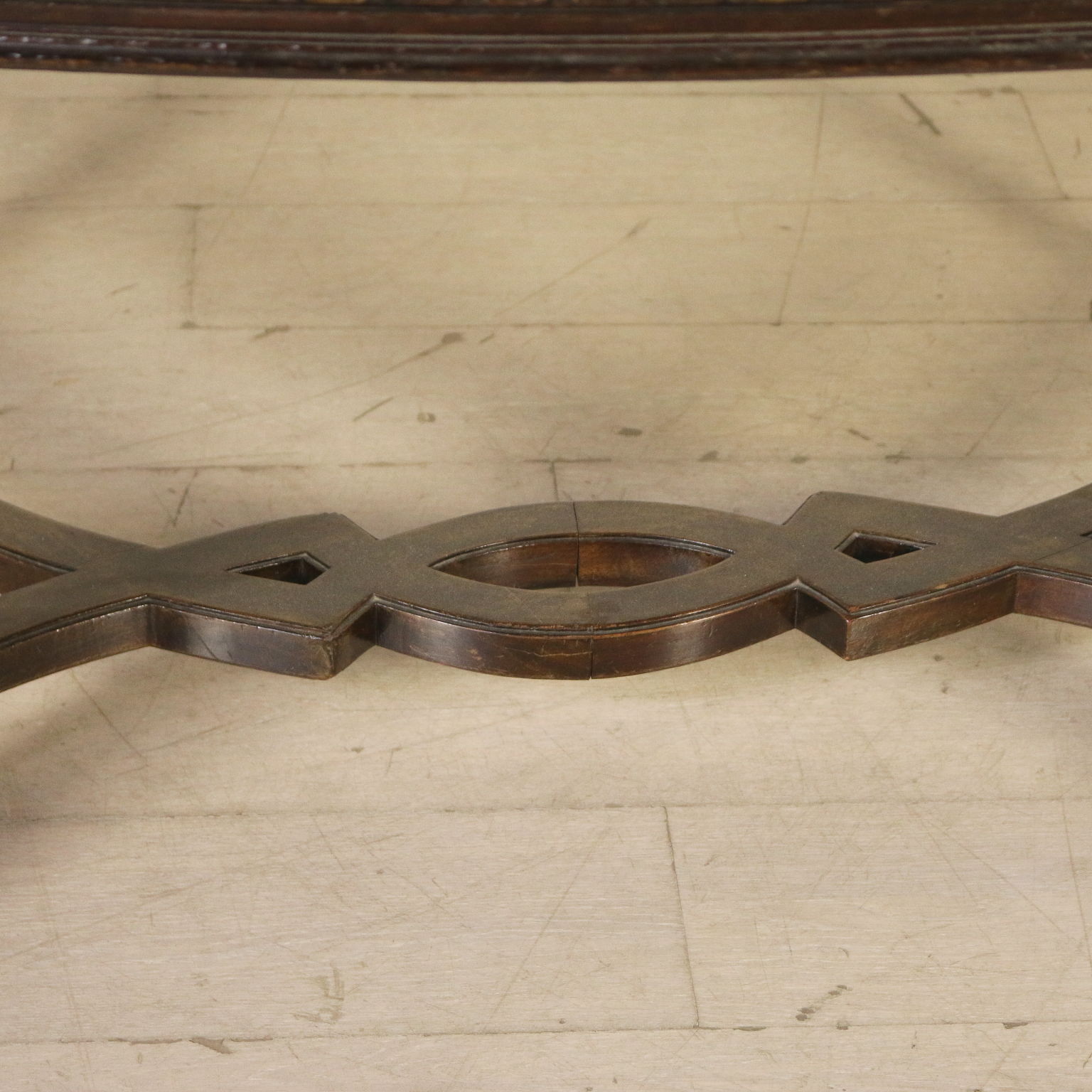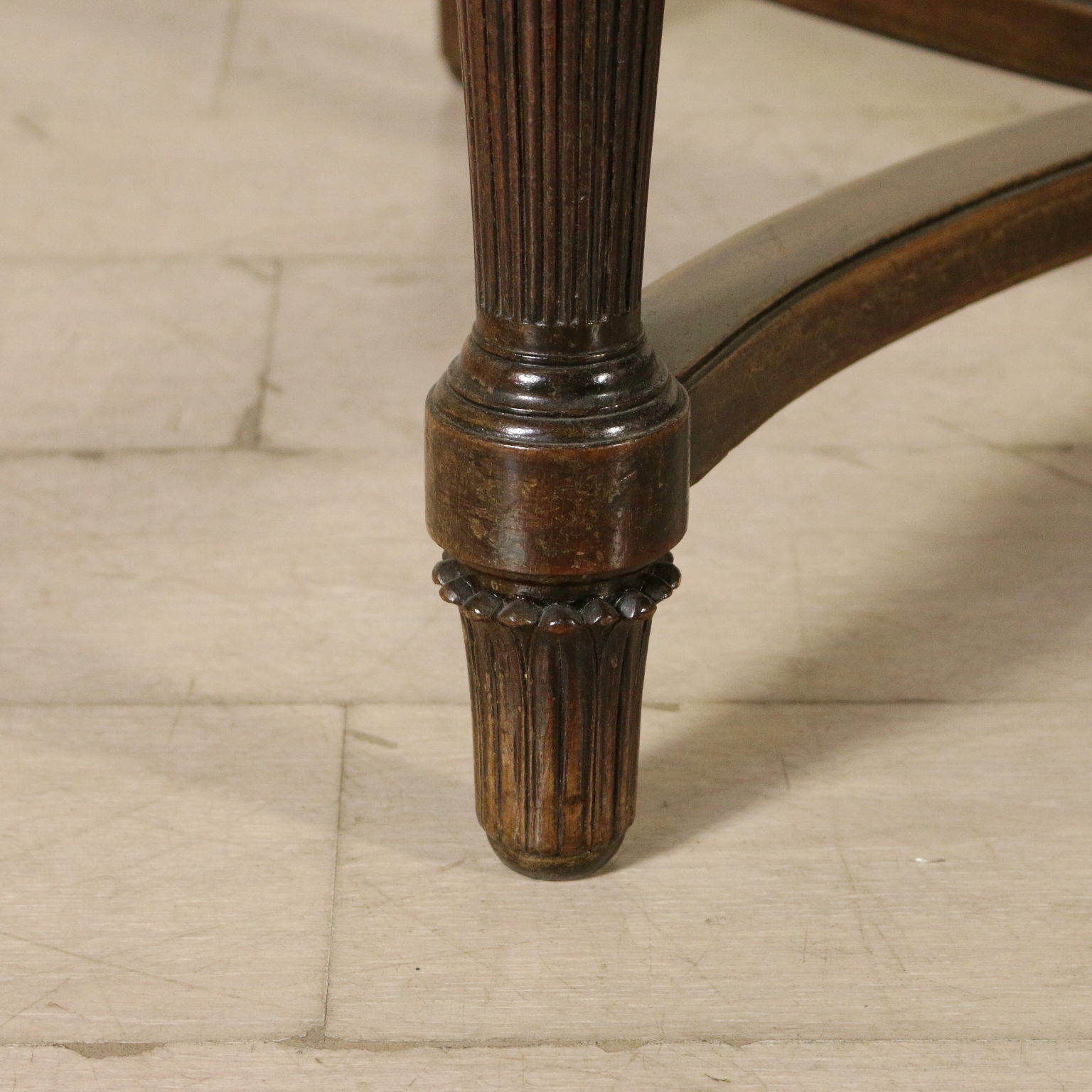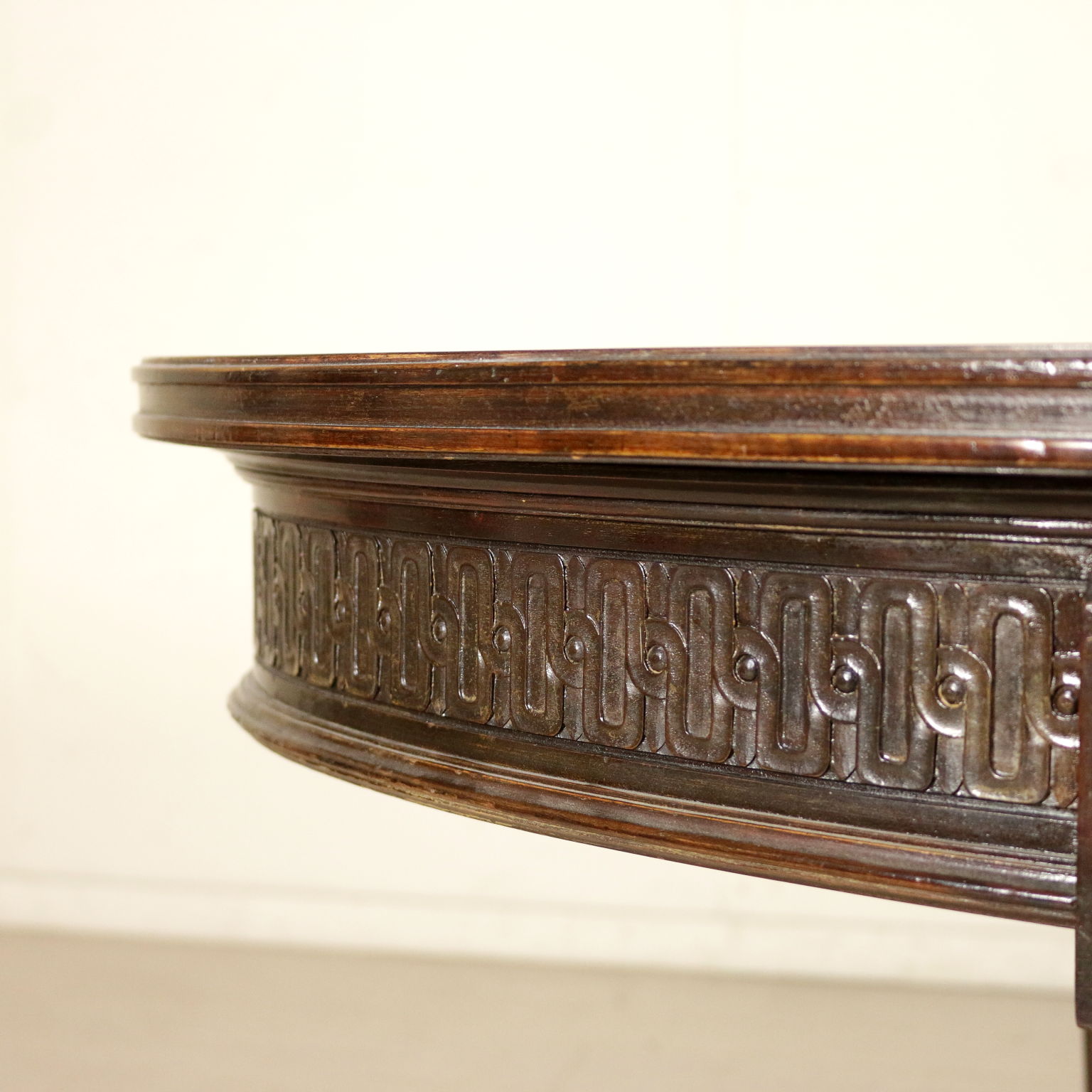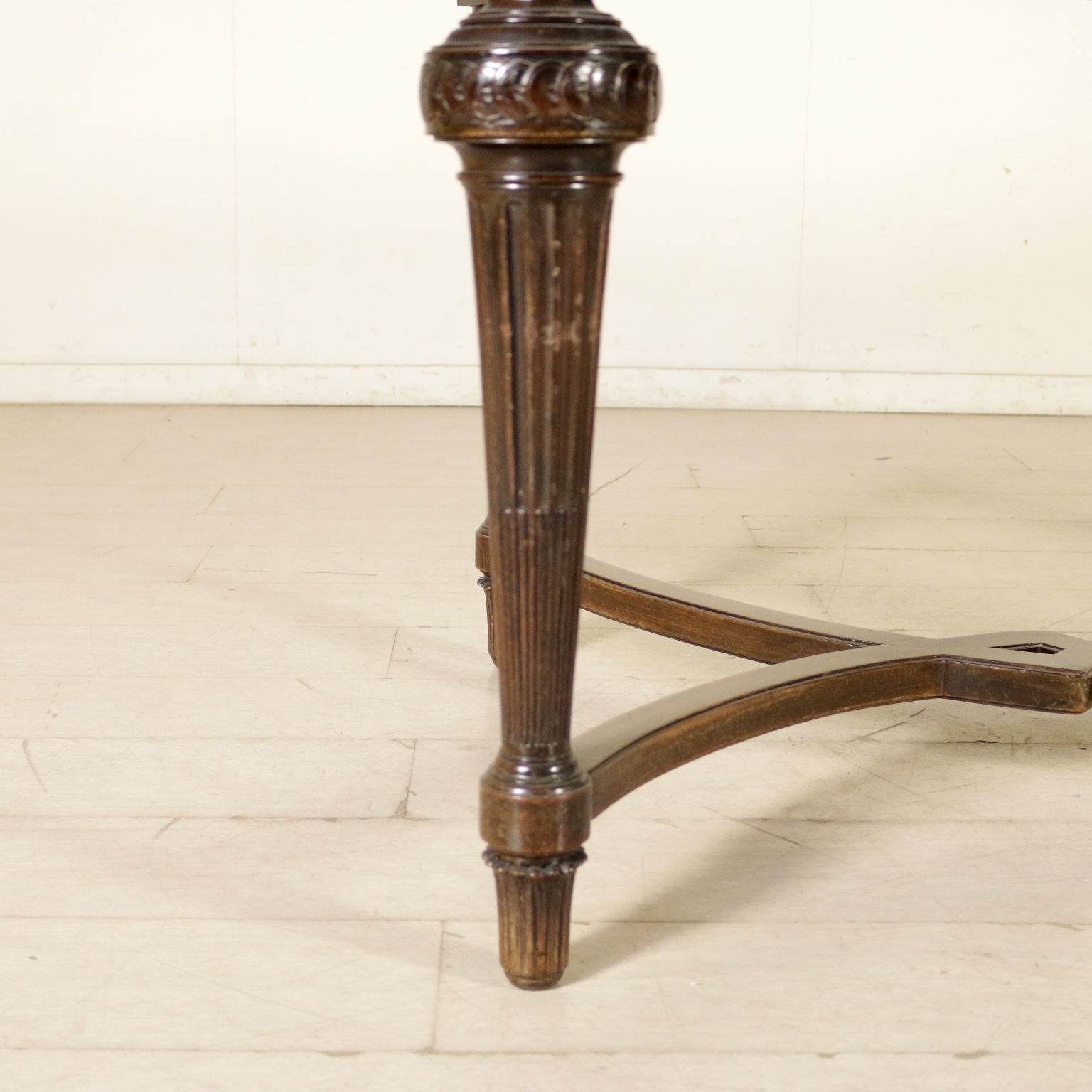 Table en style avec pieds troncoconiques raccordés par croisillon d'entrejambe; dessus oval plaqué de palissandre divisé en quatre parties. Sculpture. Fabriqué en Italie. XXeme siècle.