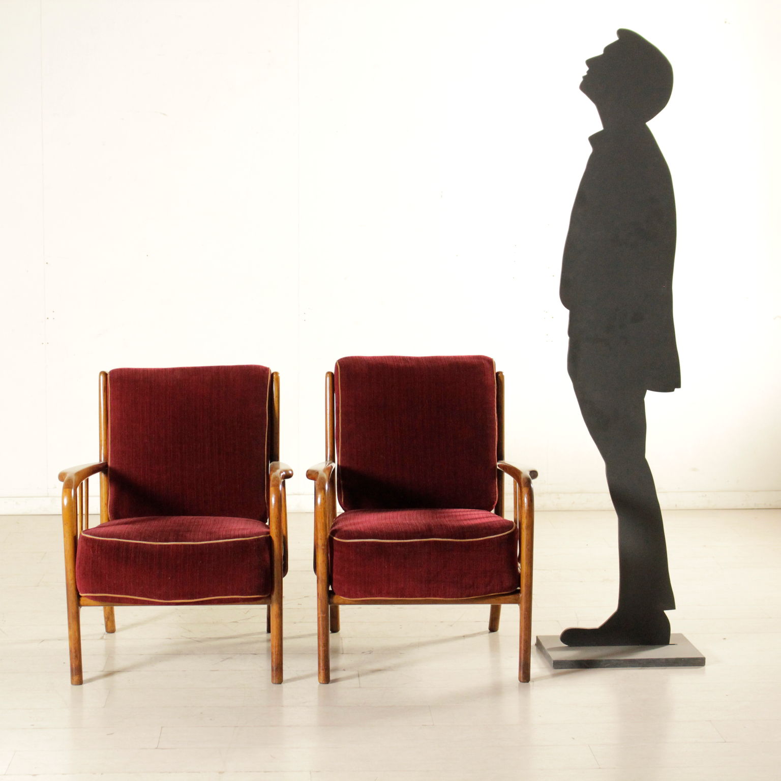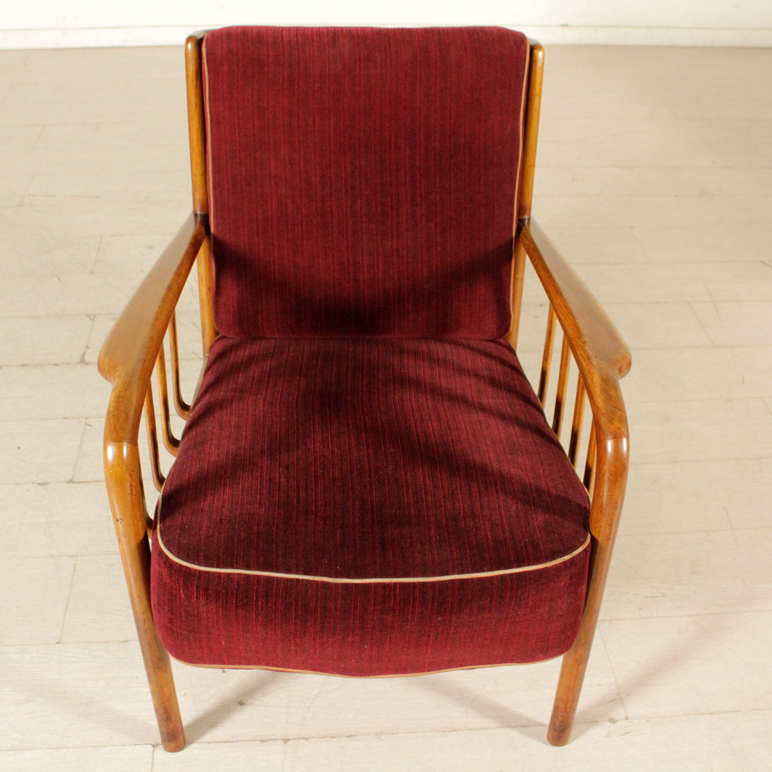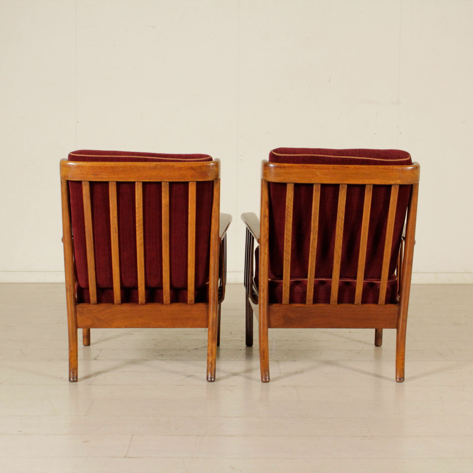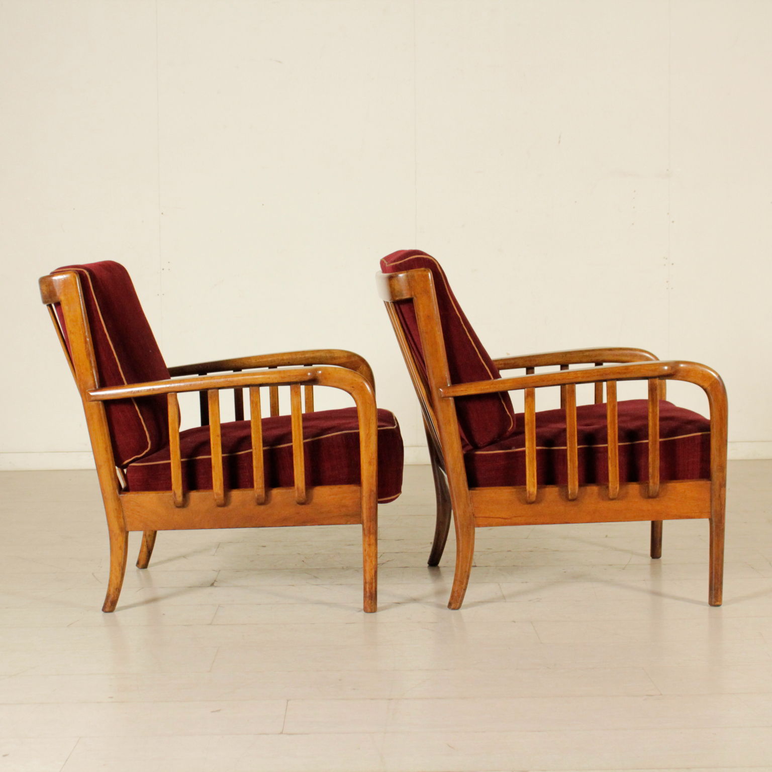 Paire de fauteuils avec structure en bois de hêtre; coussins aux ressorts, rêvetement en velours. Fabriqué en Italie. Années 40-50.