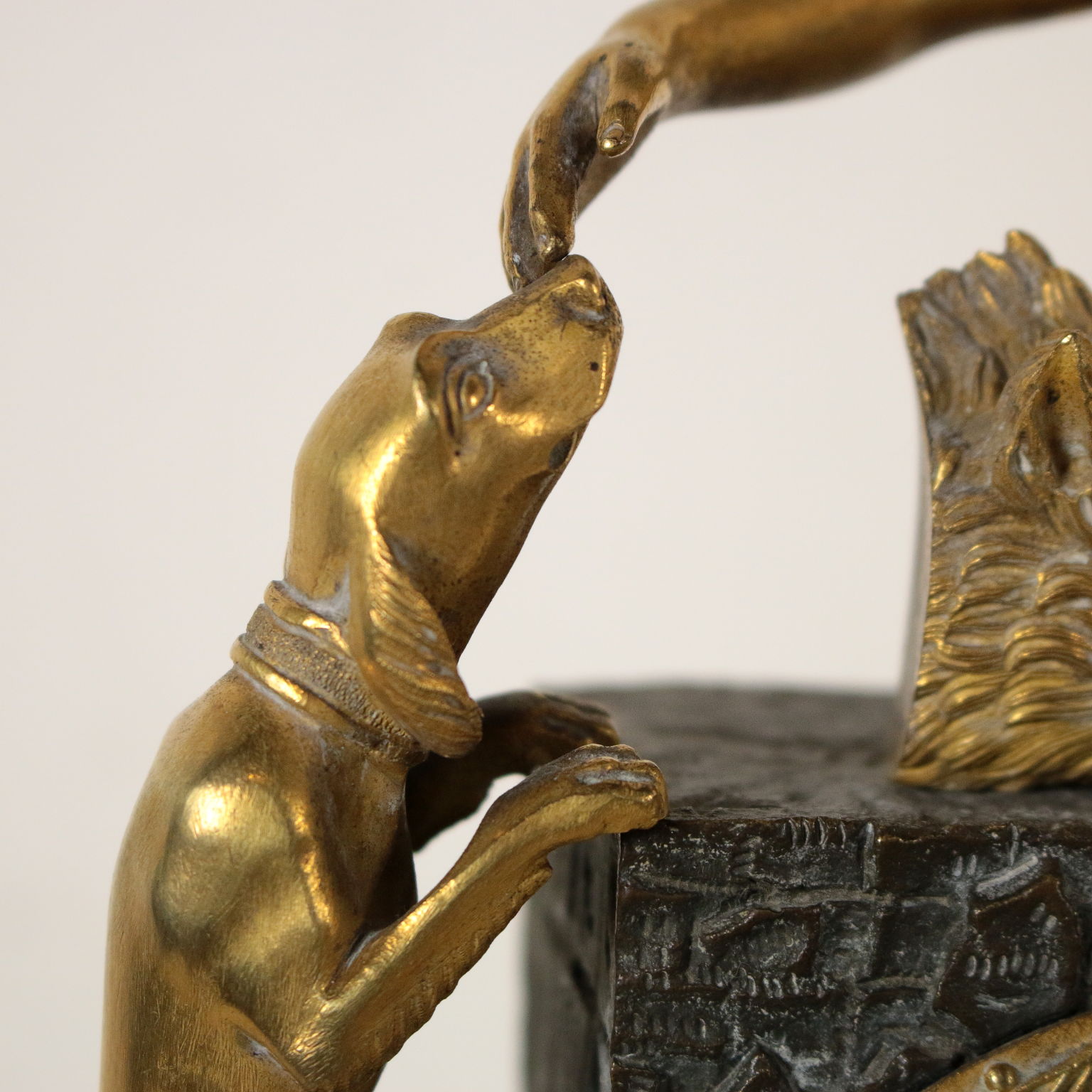 Horloge de table en bronze doré à base rectangulaire et décorations à motifs végétaux. Au centre, un relief avec une allégorie de la chasse: arc, flèches, têtes de sanglier et branches de chêne. Au sommet, on voit un bronze doré à l'intérieur d'un faux mur de pierre surmonté d'un jeune homme avec un chien de chasse et une tête de sanglier. Moitié '800.