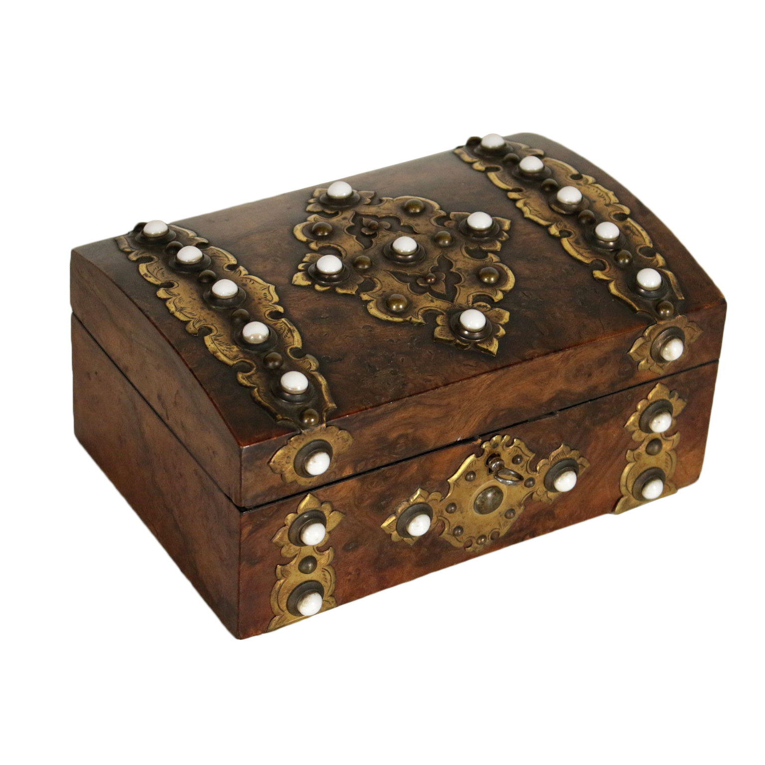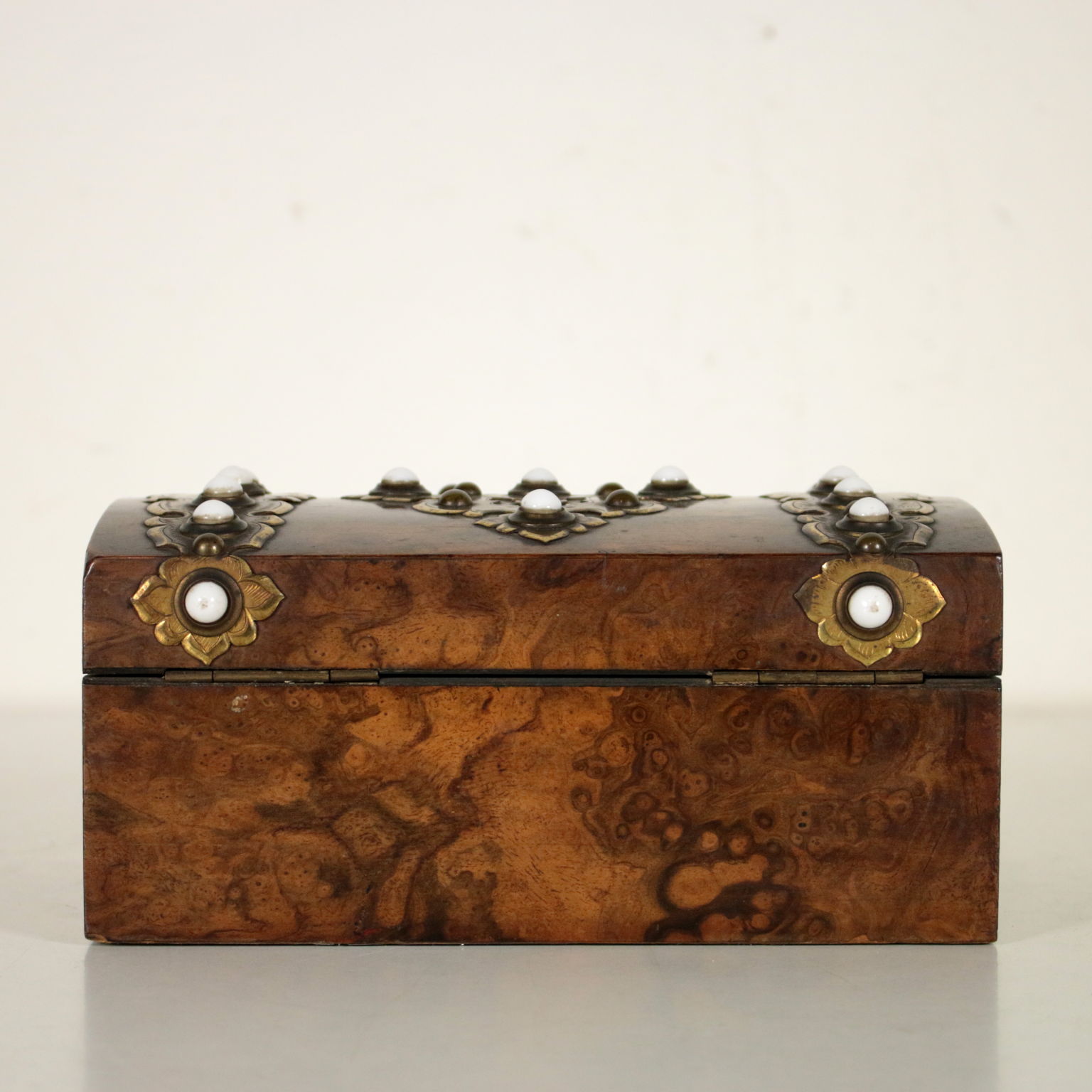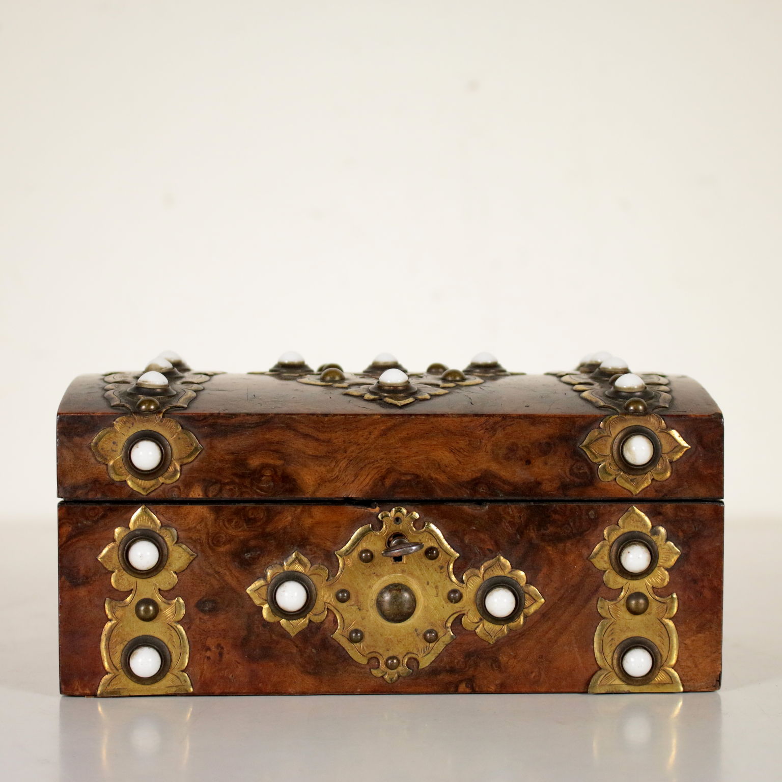 Description Boîte en bois plaqué en loupe de noyer avec décorations en bronze finement traité et clous en pâte de verre coloeur blanche. Dans l'intérieur rêvetement en papier et tissu. Clé et serrure contemporain. Dernier quart '800.