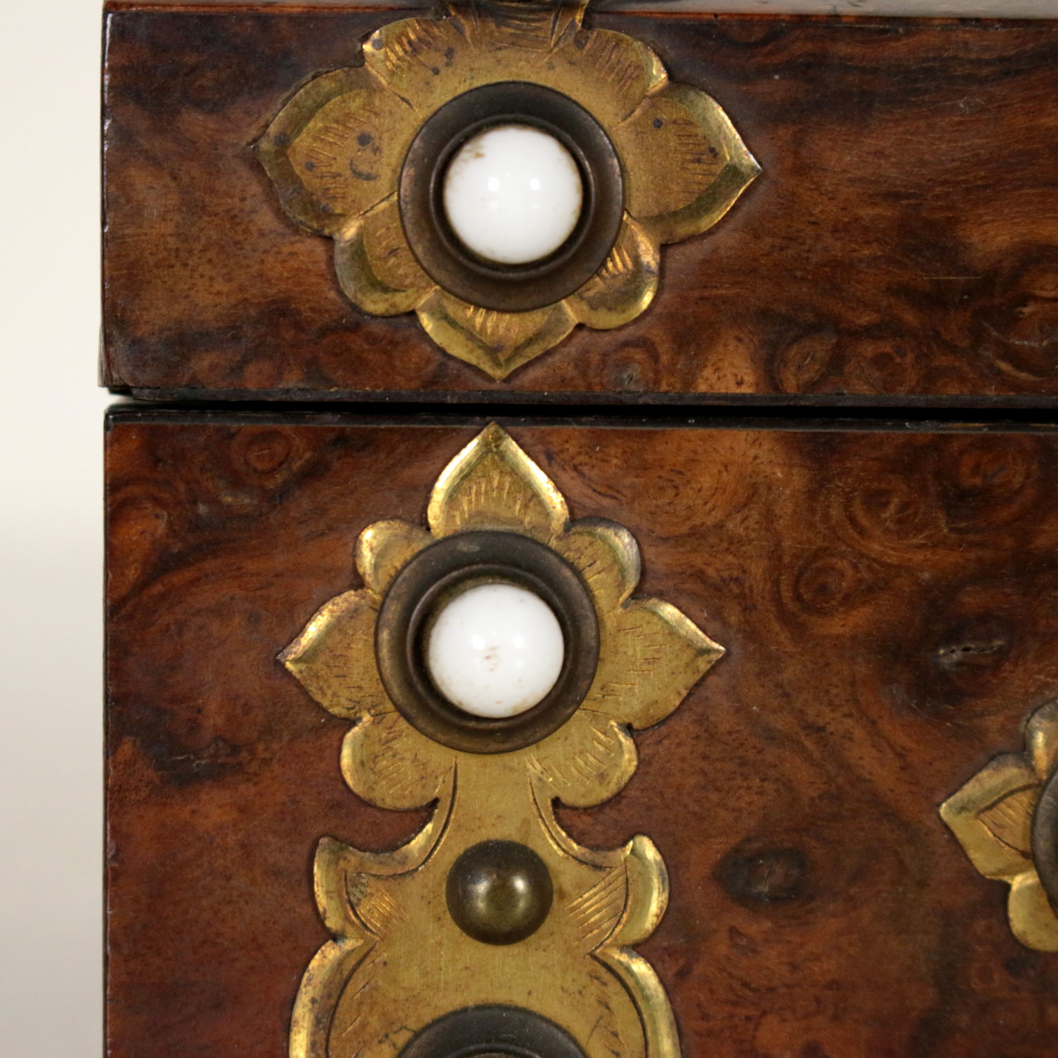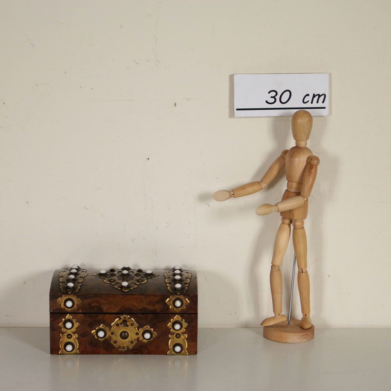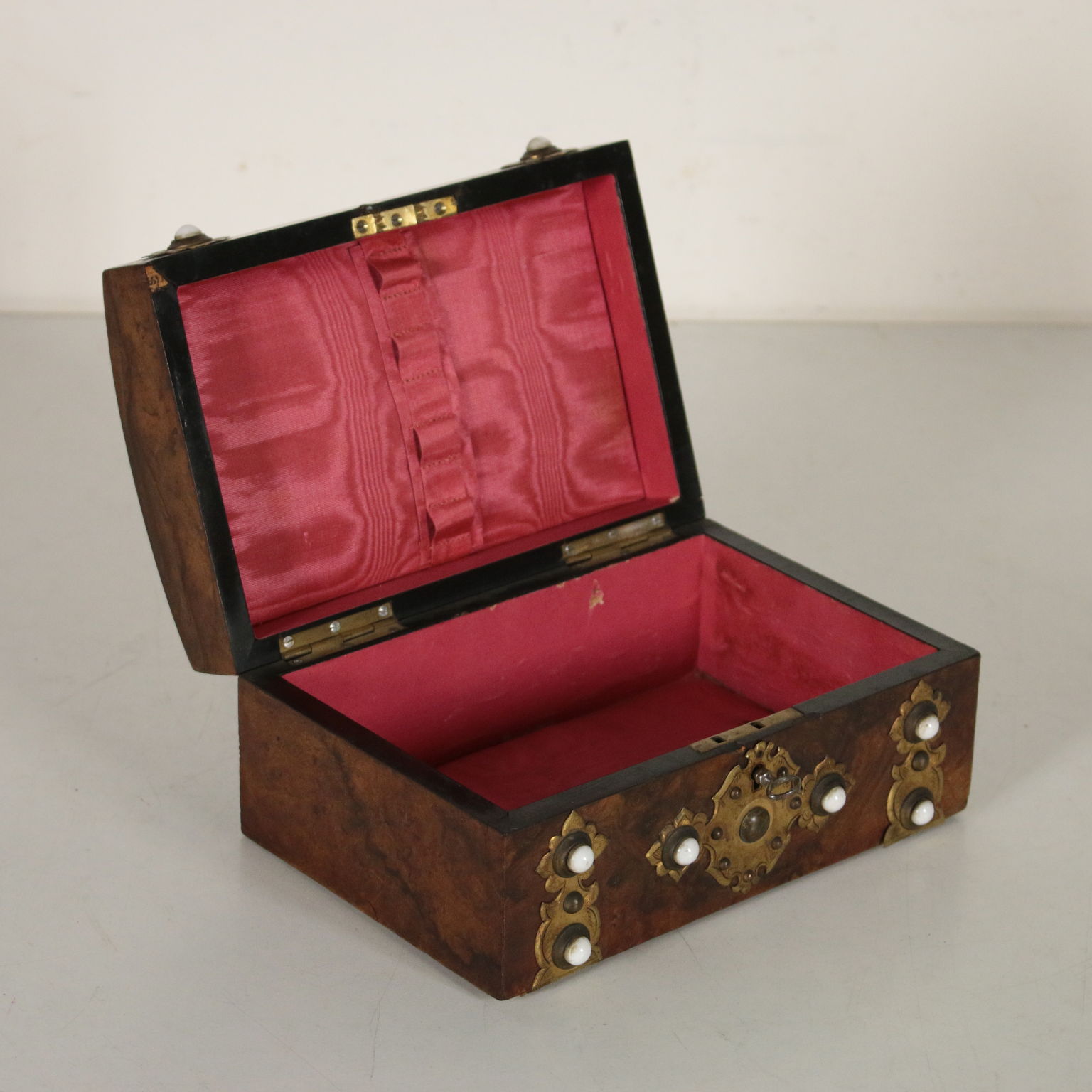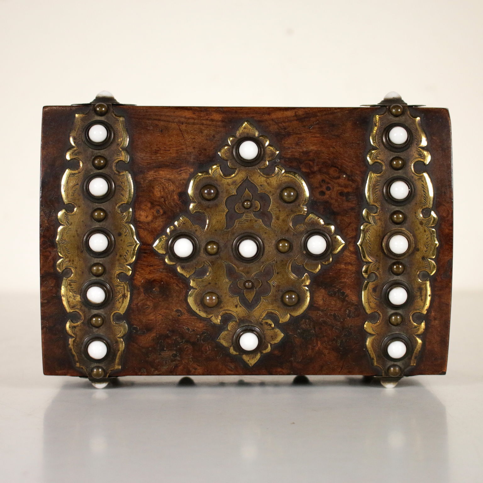 Description Boîte en bois plaqué en loupe de noyer avec décorations en bronze finement traité et clous en pâte de verre coloeur blanche. Dans l'intérieur rêvetement en papier et tissu. Clé et serrure contemporain. Dernier quart '800.