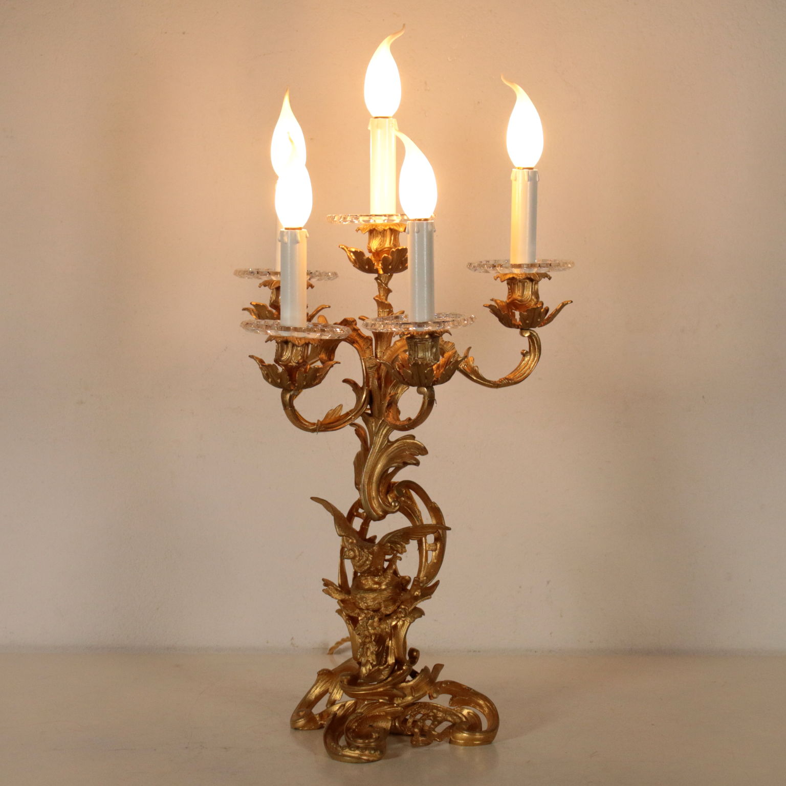Candélabre en bronze doré et verre de Baccarat. Décorations à volutes foliacés en partie ciselés; au centre oiseau de proie avec couvée. Premier '900.