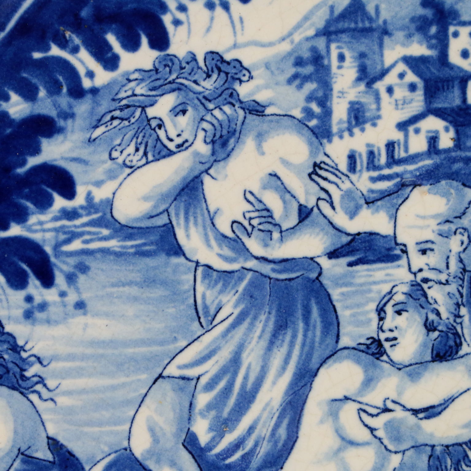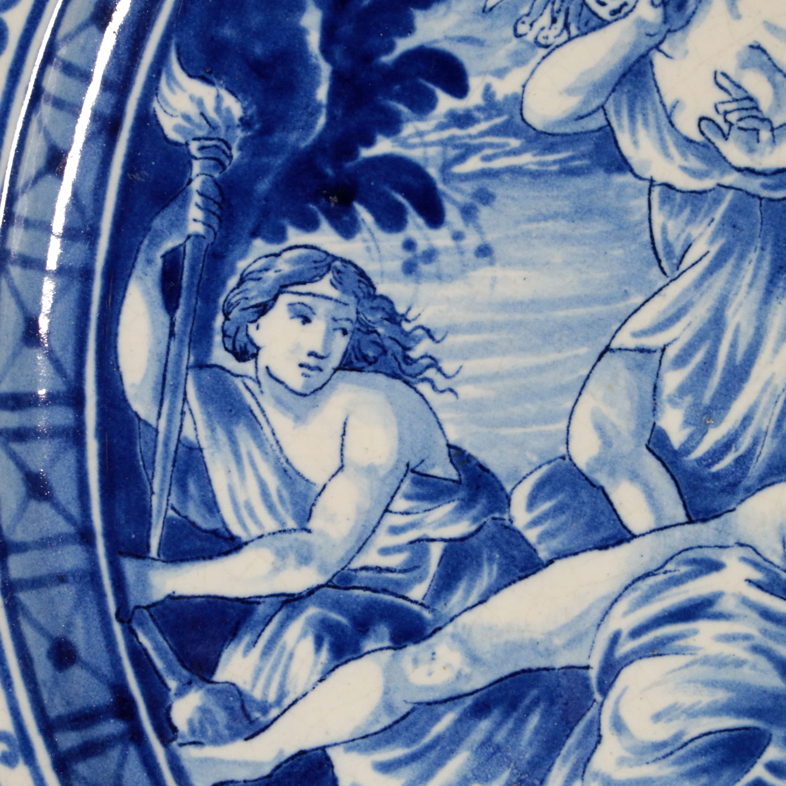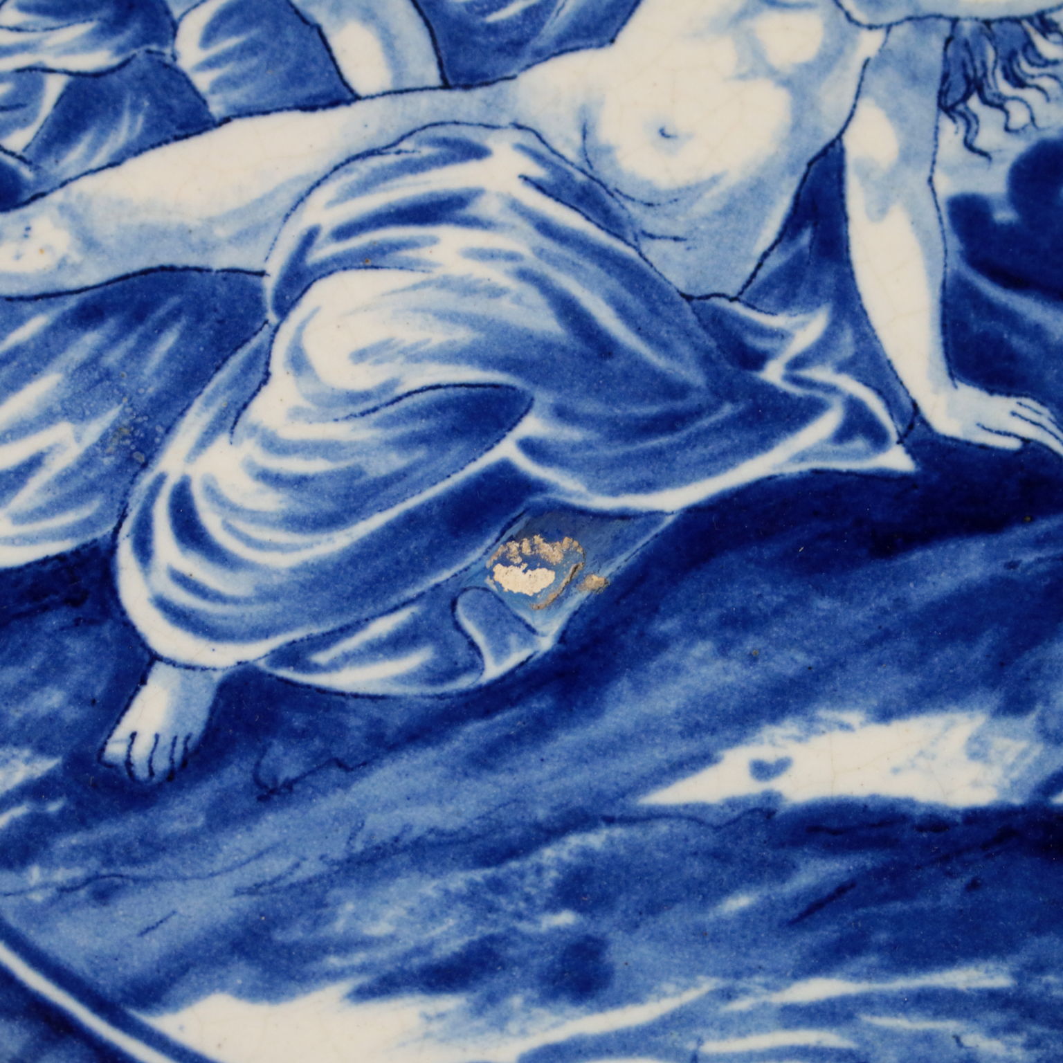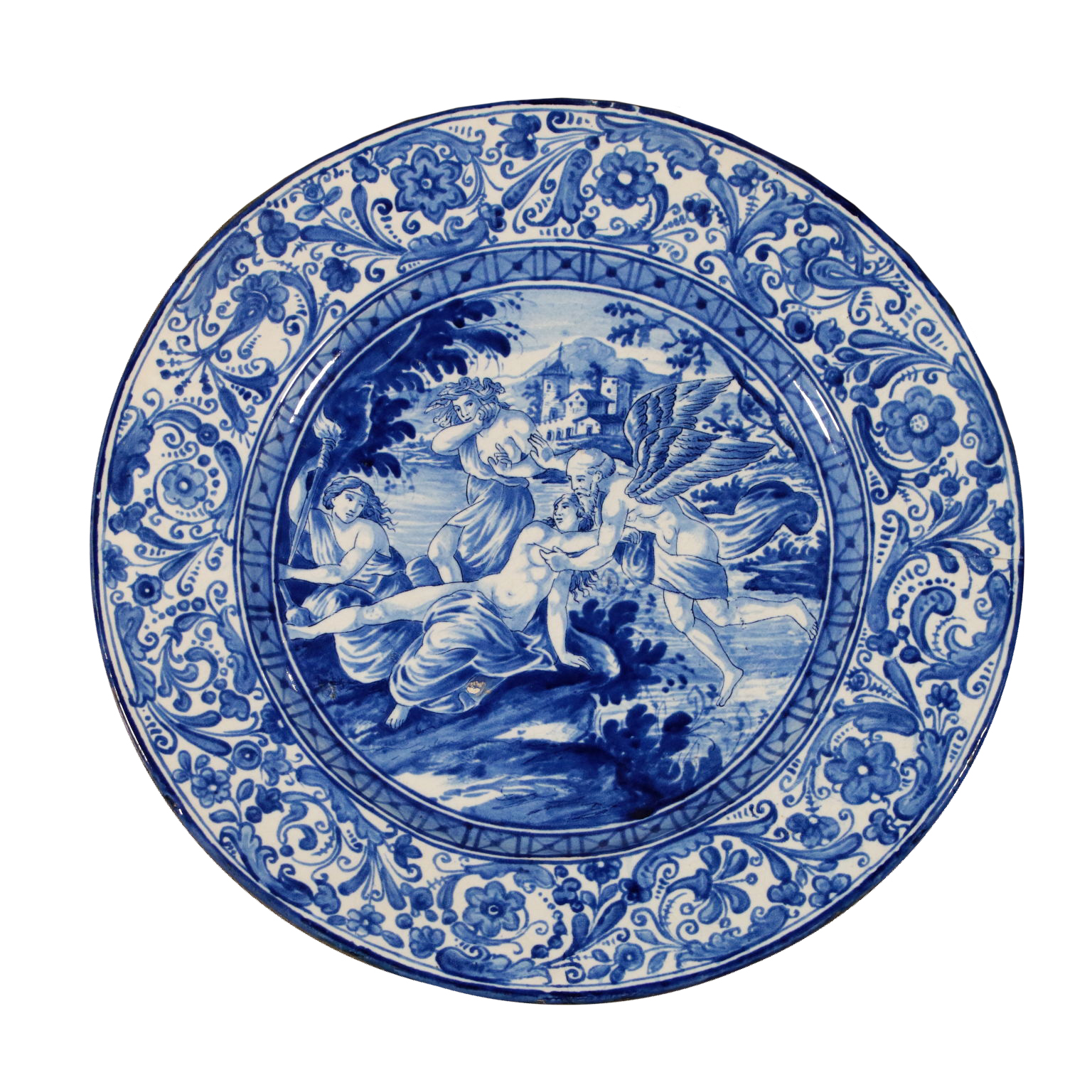 Assiette au mur en céramique à scène baroque avec figures mythologique. Sur le marli il y a décorations aux motifs vegetaux. Au derrière marque de la manifacture. Fabriqué en Italie. Premier '900.