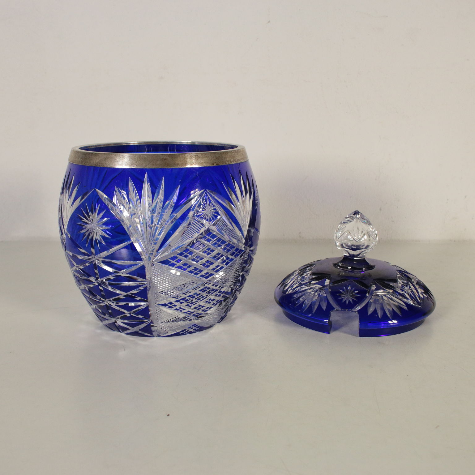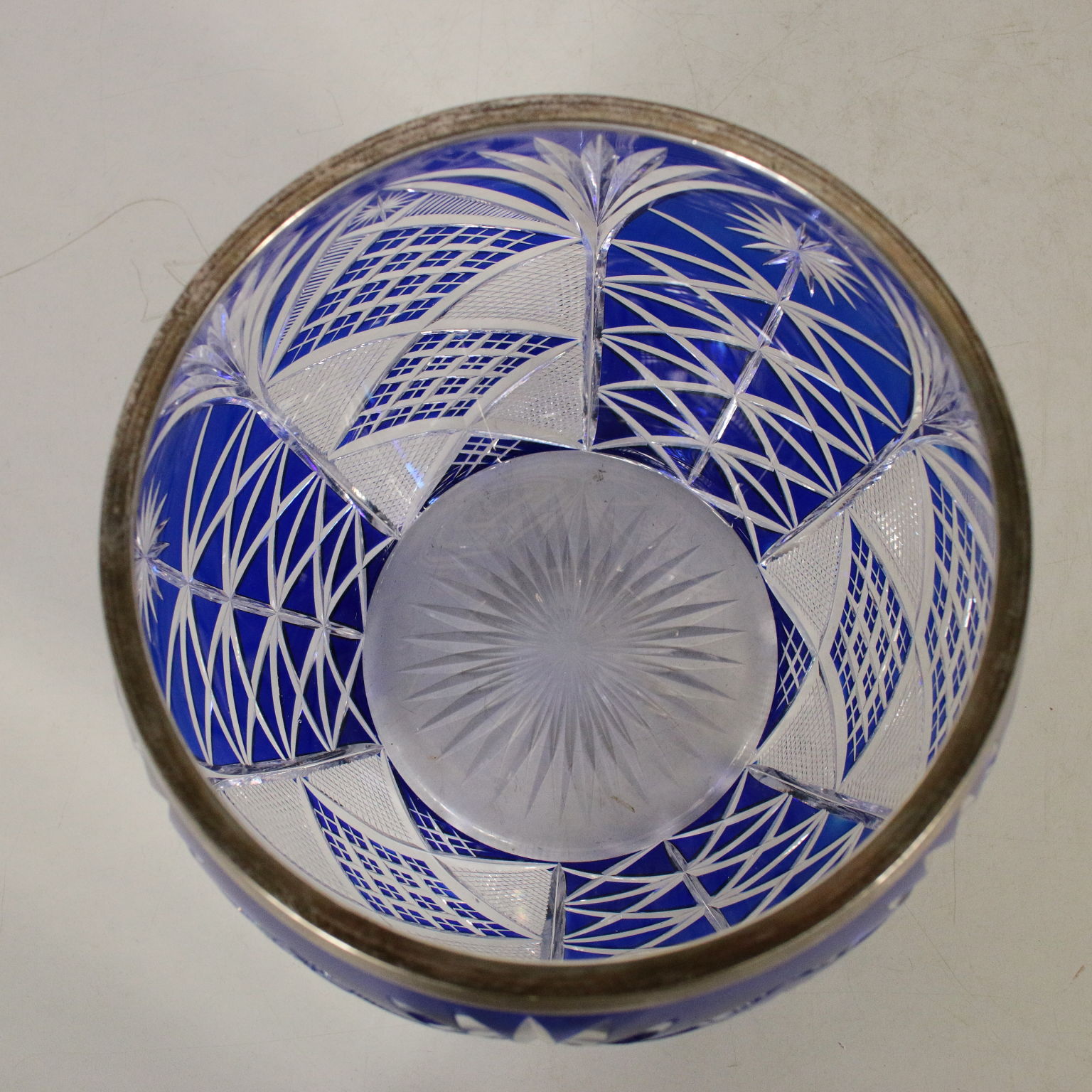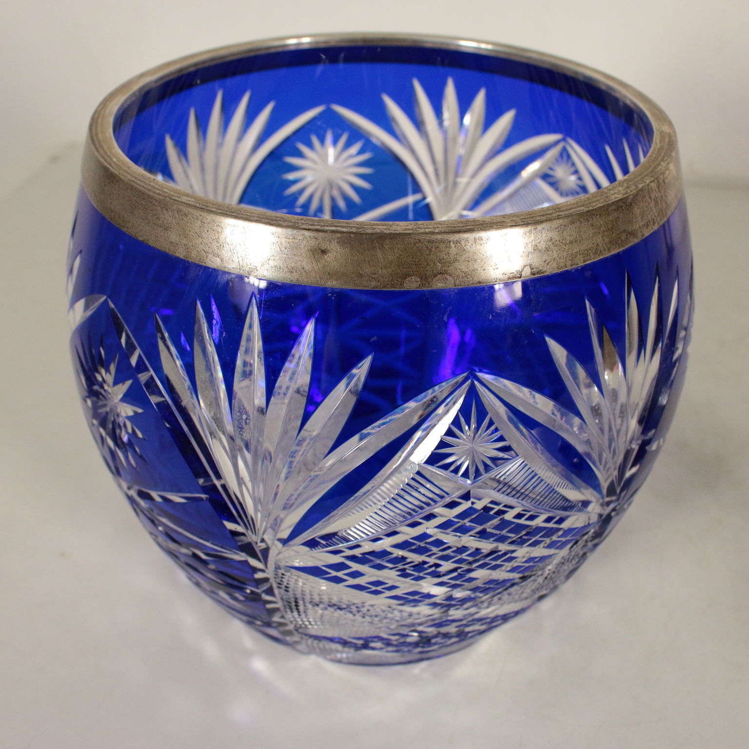 Récipient à punch en cristal taillé bleu et transparent. Base et bord en argent. Marques déposées à la base. Environ 350 gr.