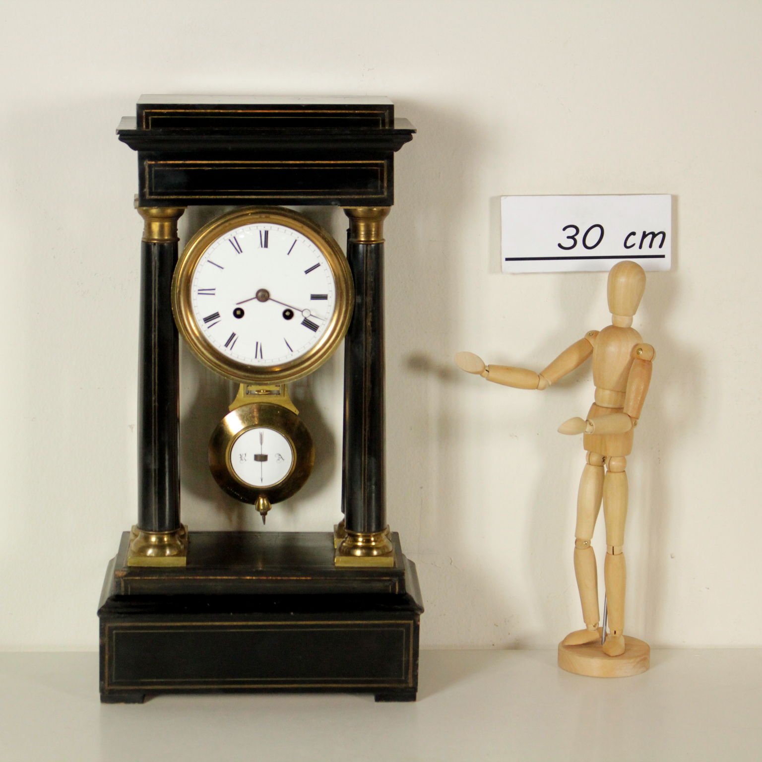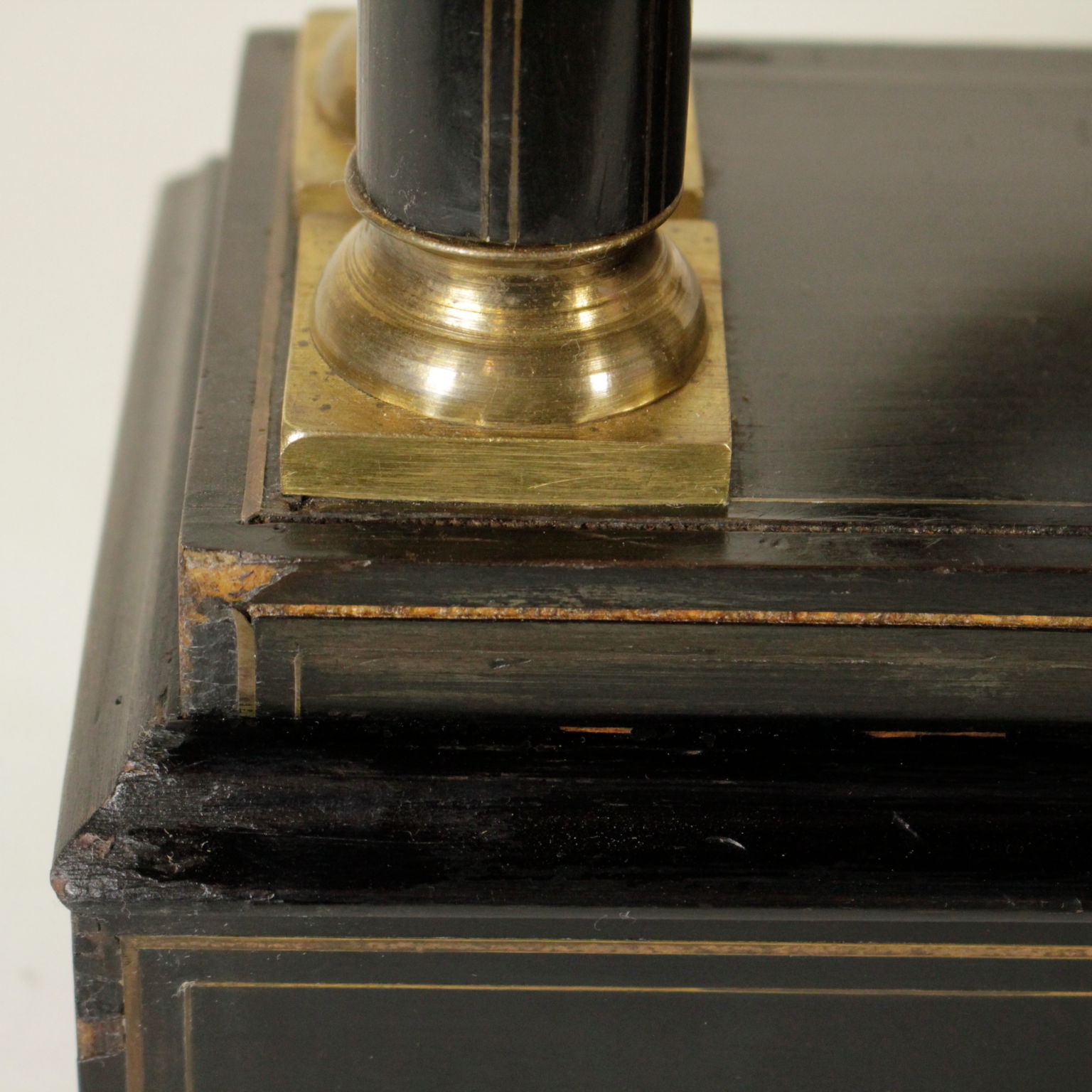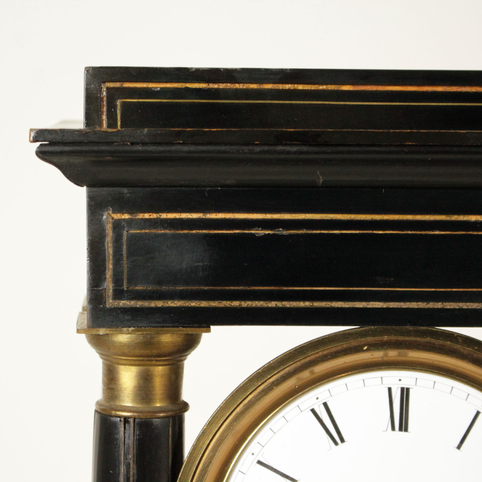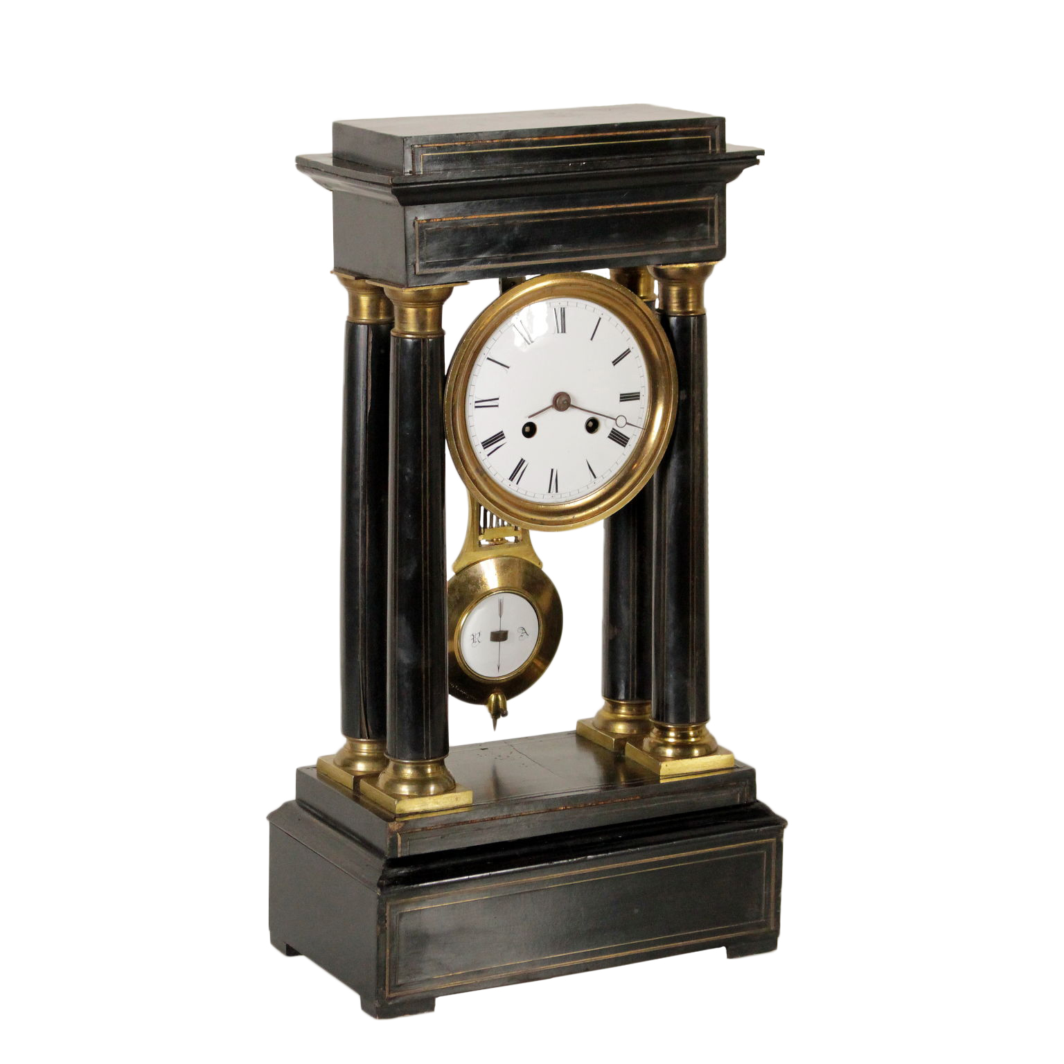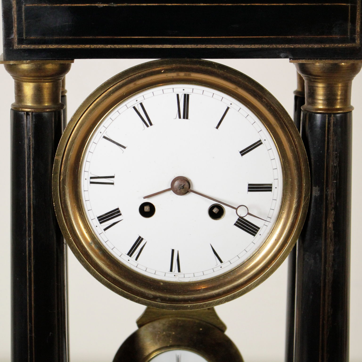 Regarder le temple dans le bois avec ebonised décoration intarso en bronze. La base, les chapiteaux des colonnes et le pendule sont en bronze doré. Montrer en métal émaillé, chiffres romains et le mécanisme Japy Freres Medailles d'or Hottot à Paris.
