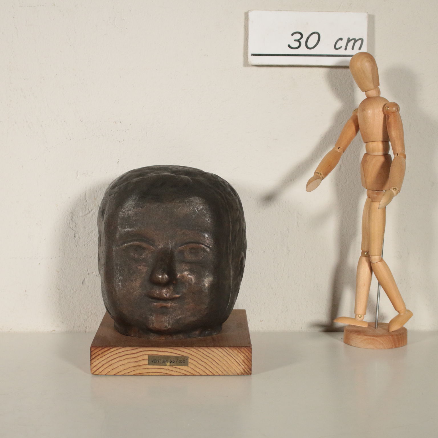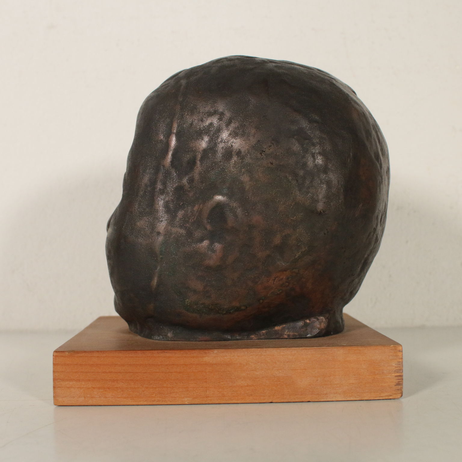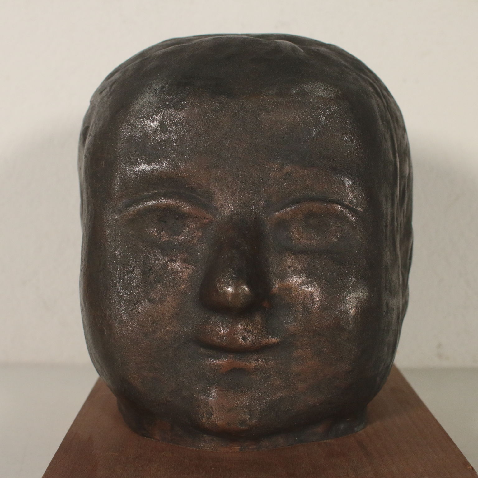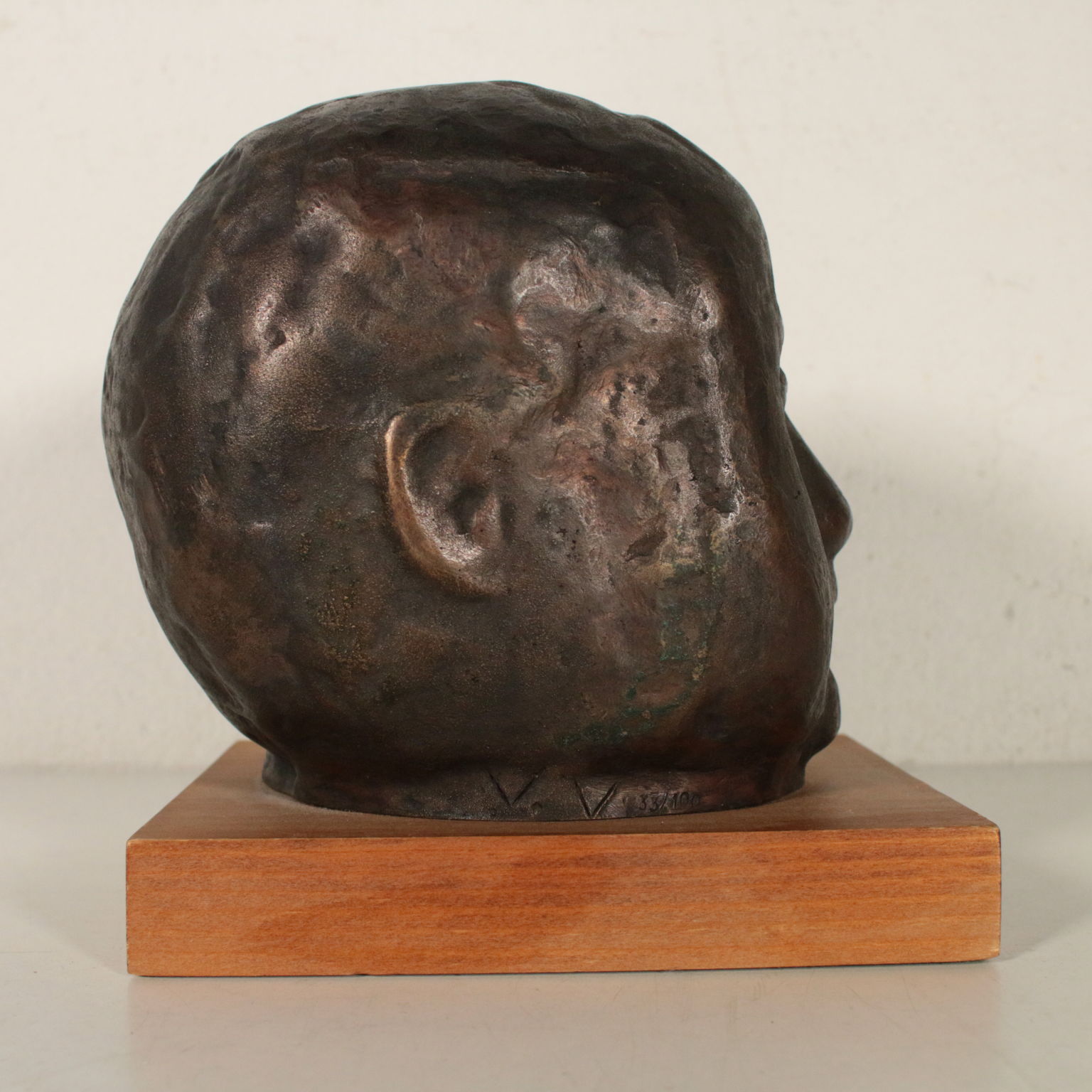 Sculpture en Bronze représentant la tête d'un enfant sur une base en bois. Et. 33/100. Les initiales de l'auteur, et la numérotation de l'édition limitée incusse sur le cou.