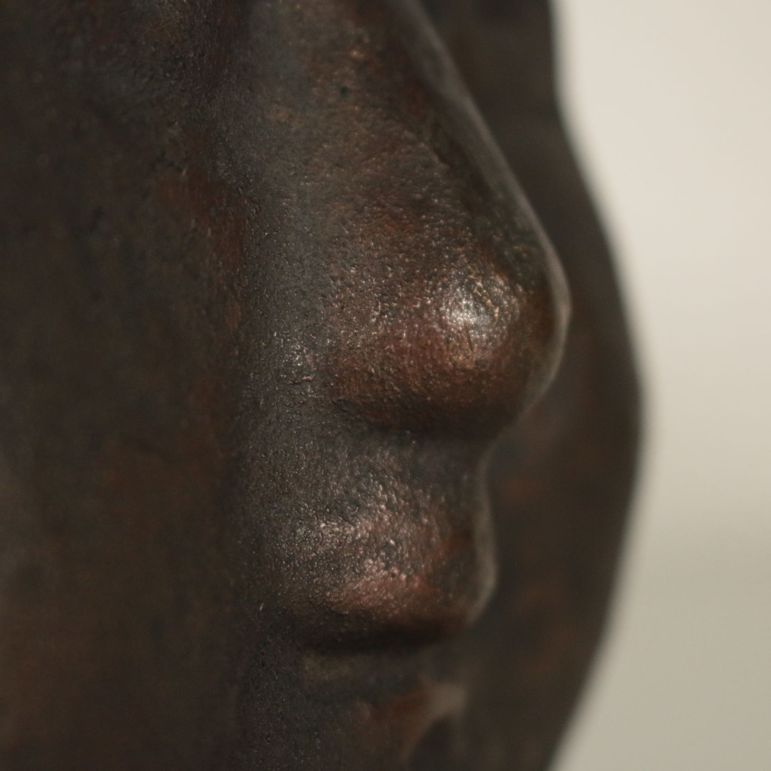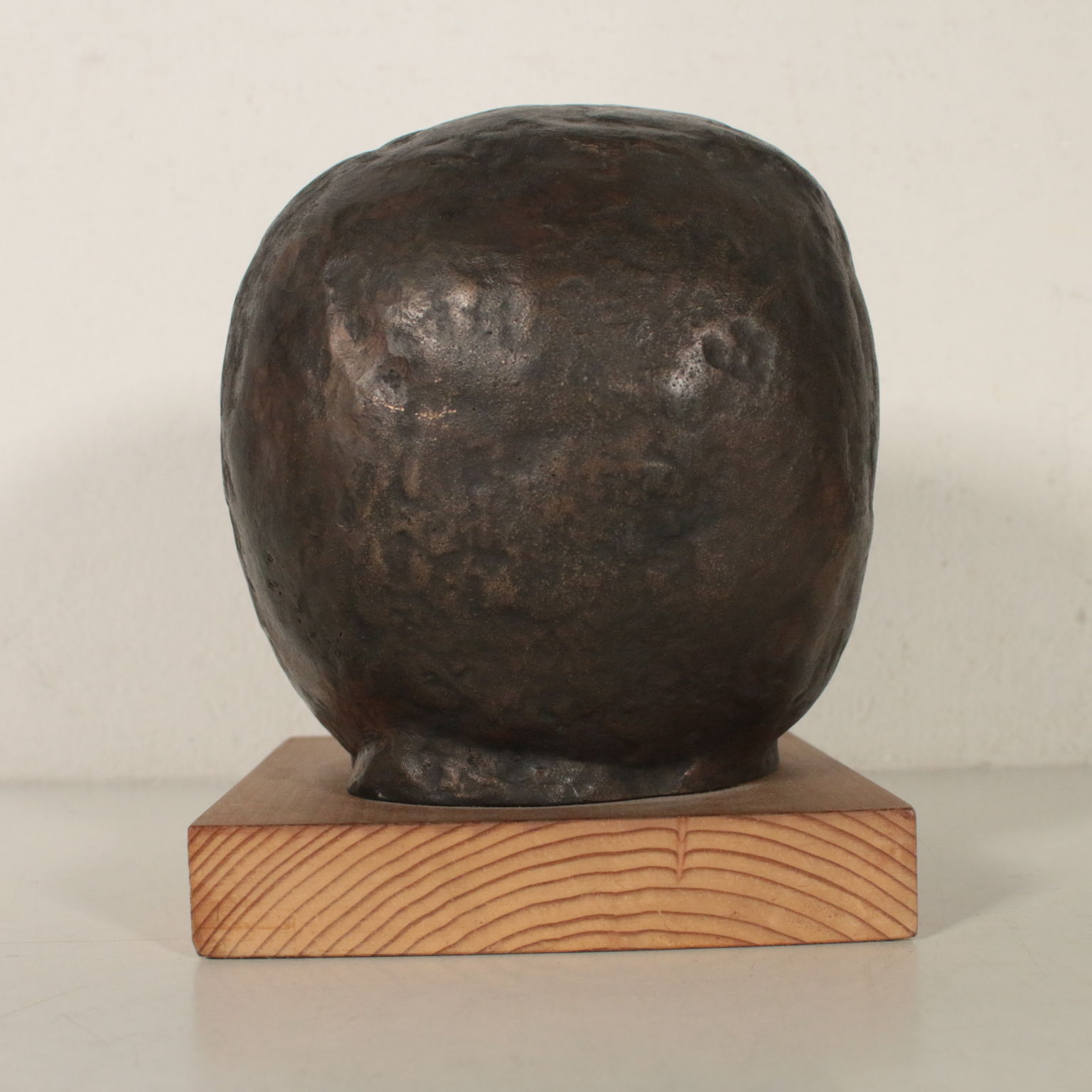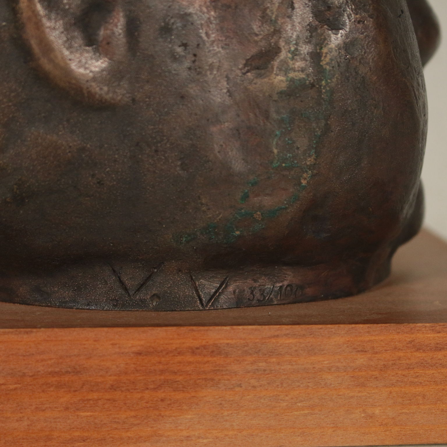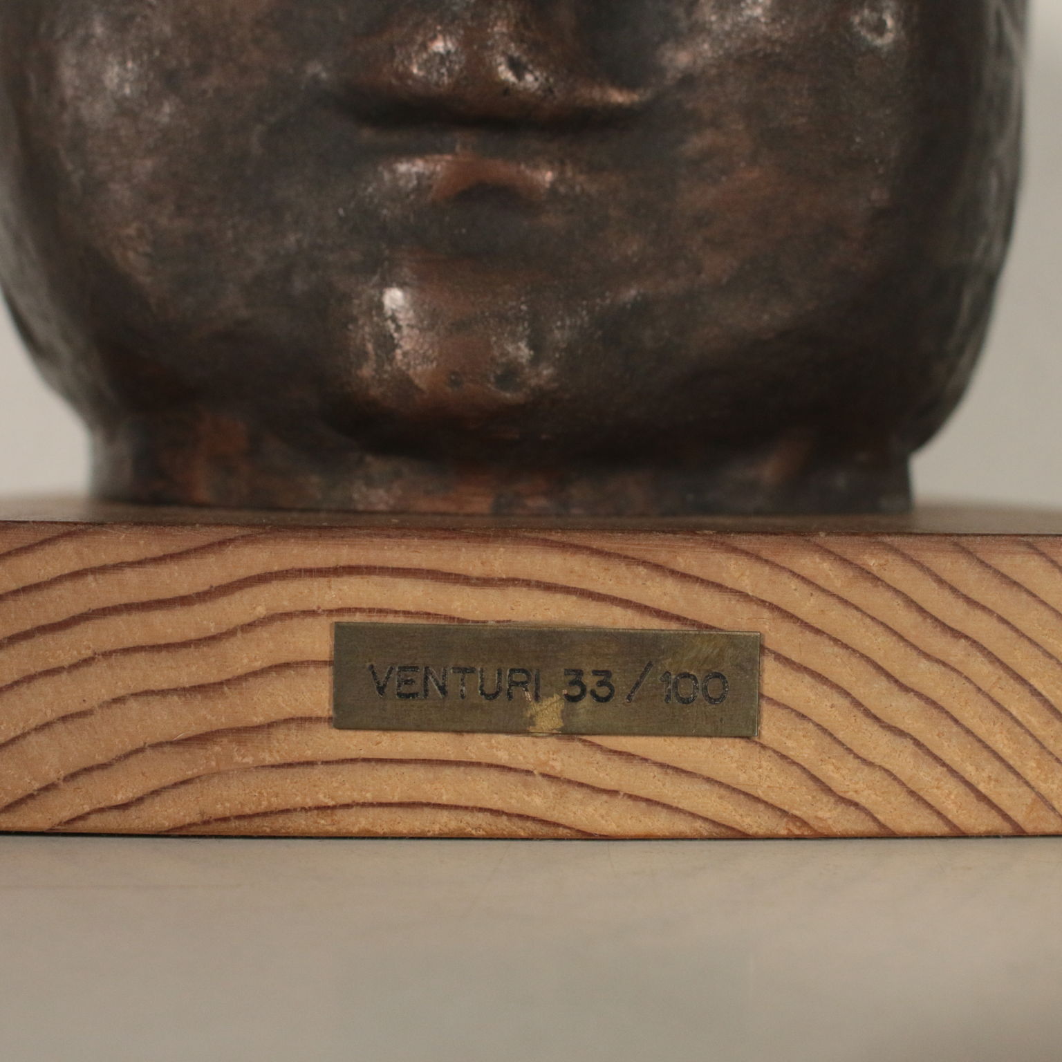 Sculpture en Bronze représentant la tête d'un enfant sur une base en bois. Et. 33/100. Les initiales de l'auteur, et la numérotation de l'édition limitée incusse sur le cou.