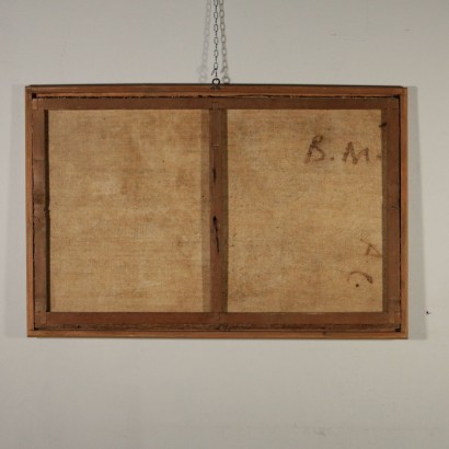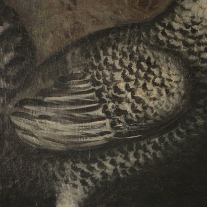 Huile sur toile. Au dos de la toile, il y a des monogrammes, B.M. et A.C. L'œuvre rappelle, par affinité stylistique, les œuvres du peintre anonyme de natures mortes nommé Monogrammista A.V. (actif en Émilie dans la première moitié du XVIIIe siècle), auteur de compositions dans lesquelles un vase de fleurs souvent vu à l'extérieur est souvent utilisé, la plupart du temps associé à des fruits ou à presque toujours des animaux domestiques, parfois exotiques. La peinture présente plusieurs petites gouttes de couleur, répandues. Dans un cadre ancien