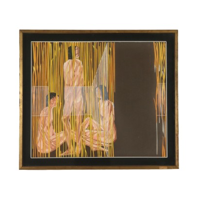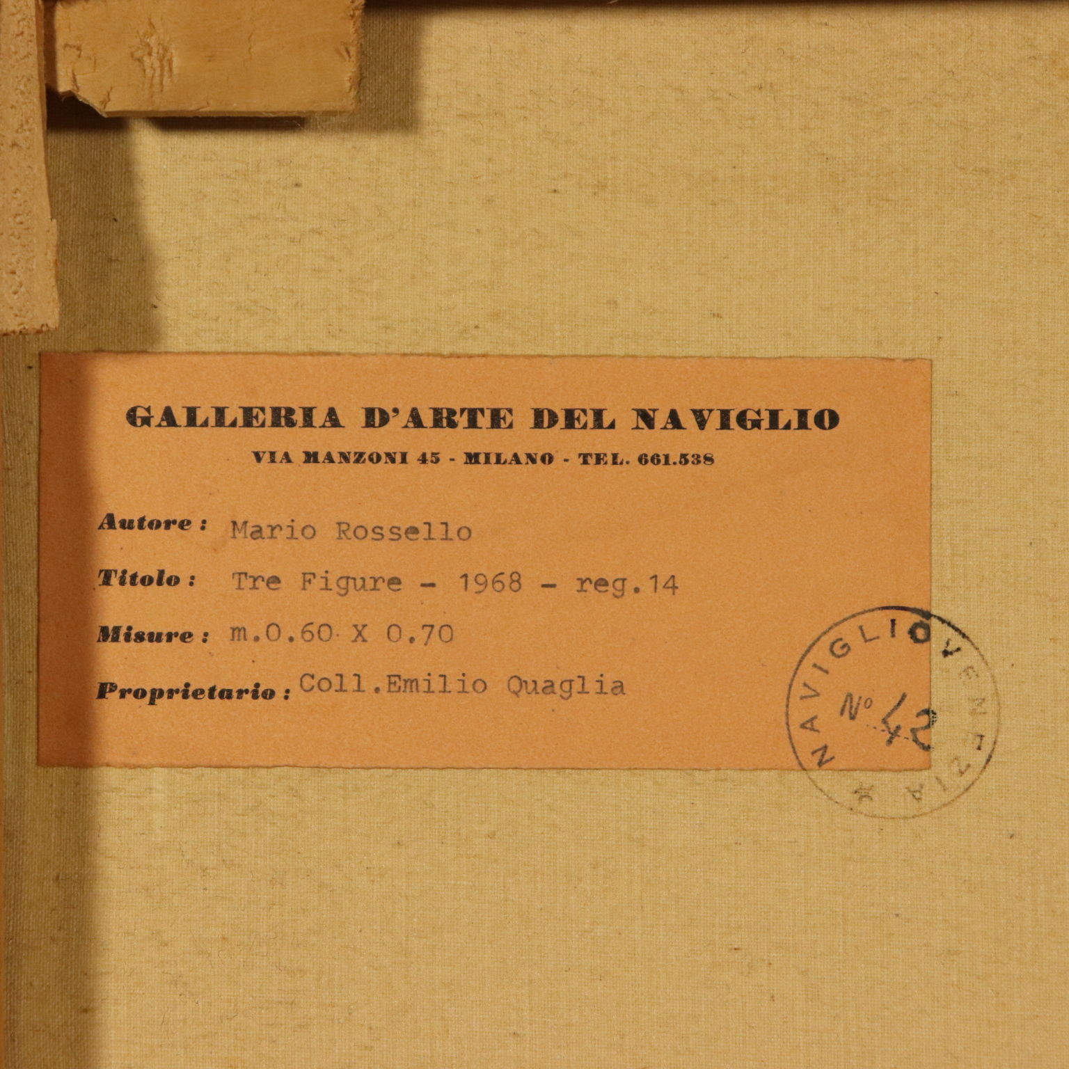 Huile sur toile. Signé en bas à droite. Après avoir commencé avec un figuratif, post-cubiste, le peintre de savone, Mario Rossello approches de la peinture abstraite. Au début des années 50, il a assisté la ville et ses artistes, où il a expérimenté avec la peinture, le nucléaire. À la fin des années '60 a été un retour à la figuration et plus abstraite. L'oeuvre appartient à la période de l'abstrait (1968). Représente trois personnages humains sans visage sur un arrière-plan de la géométrie. Une étiquette sur le dos du papier de la galleria d'arte del Naviglio, avec le titre, la date et l'auteur. Dans le cadre.