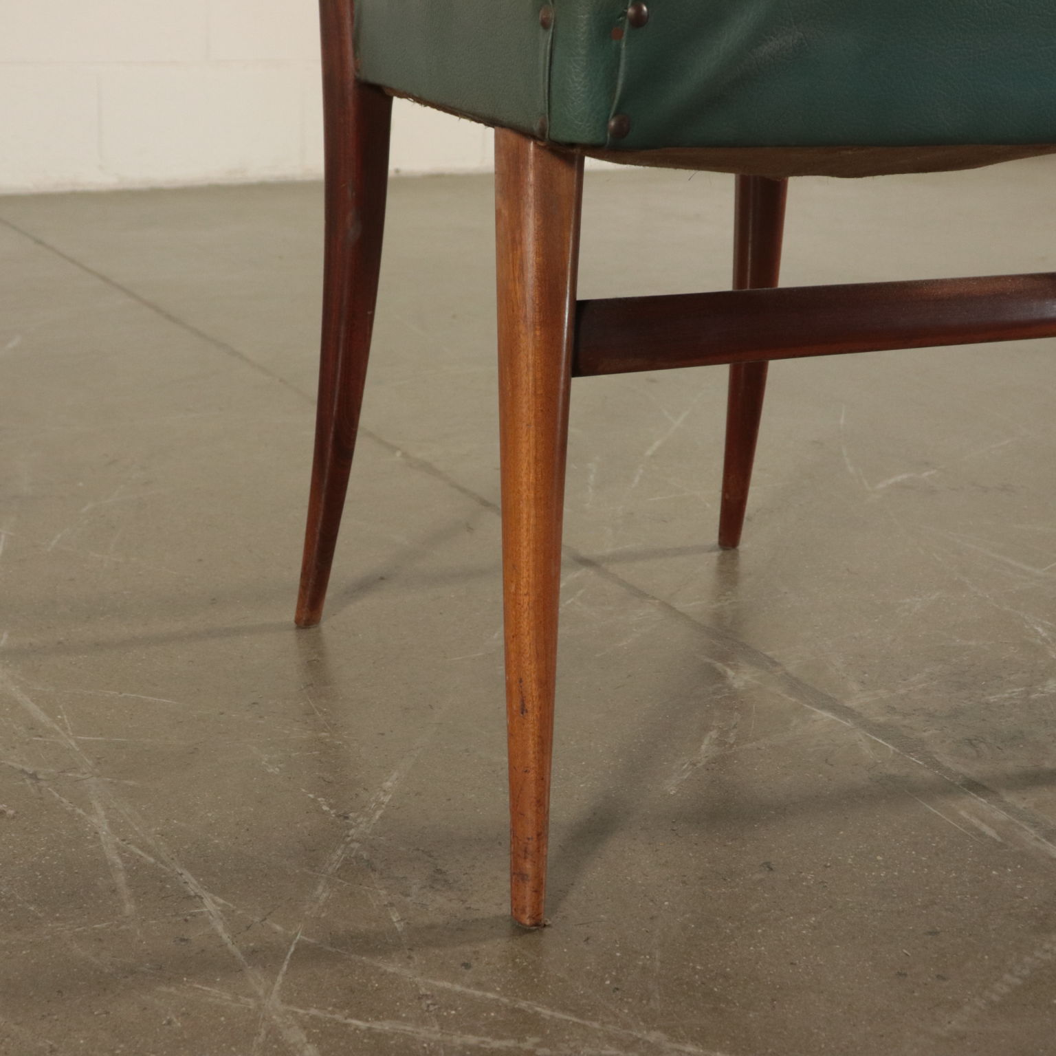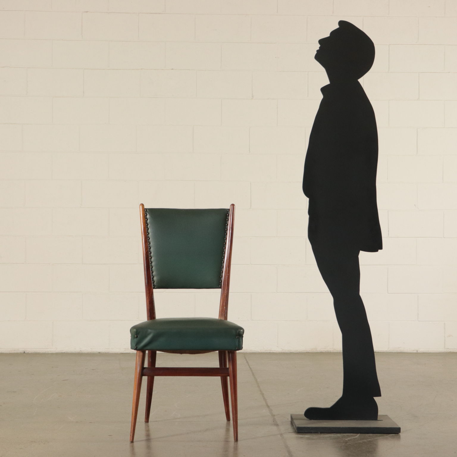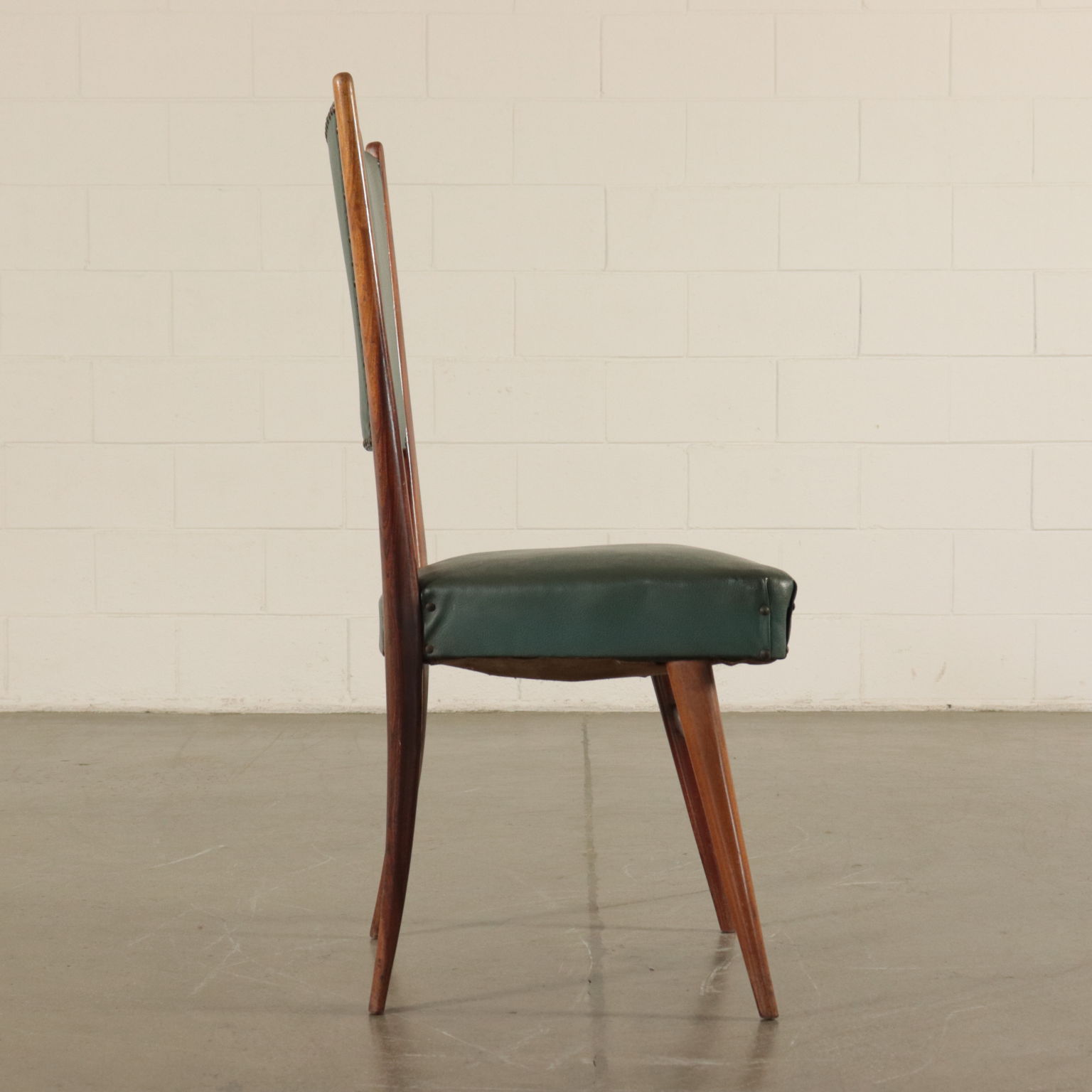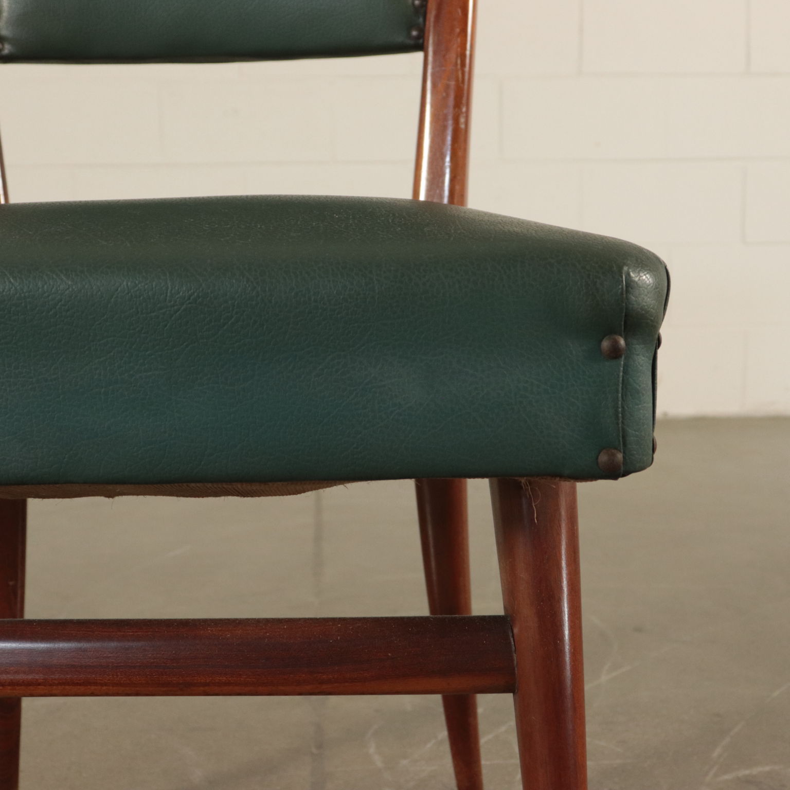 Suite de six chaises en bois de hêtre teint, rembourrage aux ressorts, rêvetement en cuir synthétique. Italie. Années 50-60.