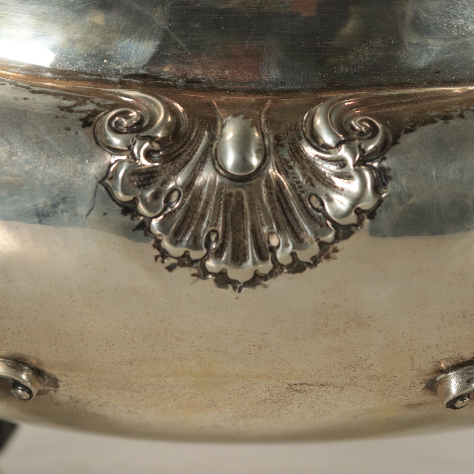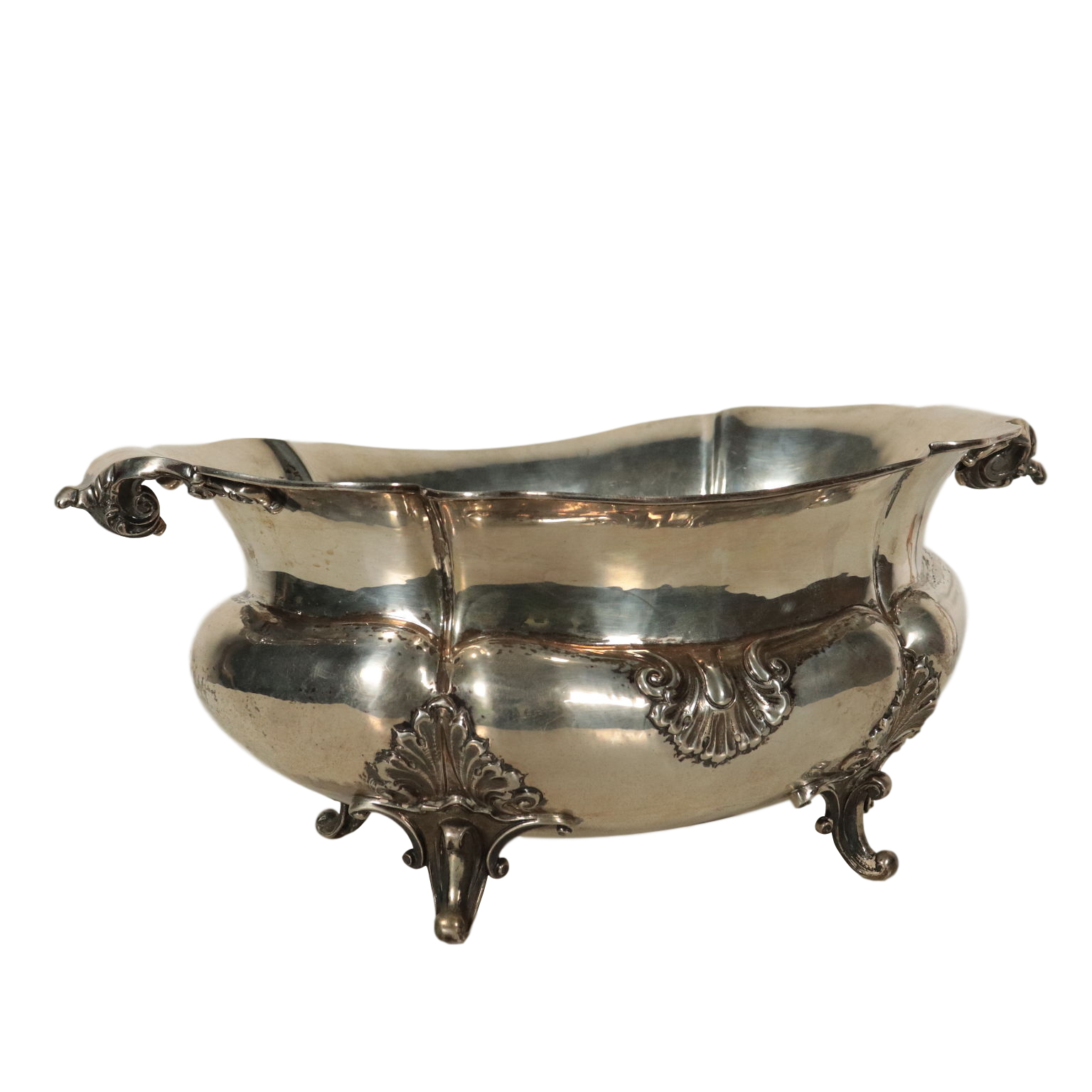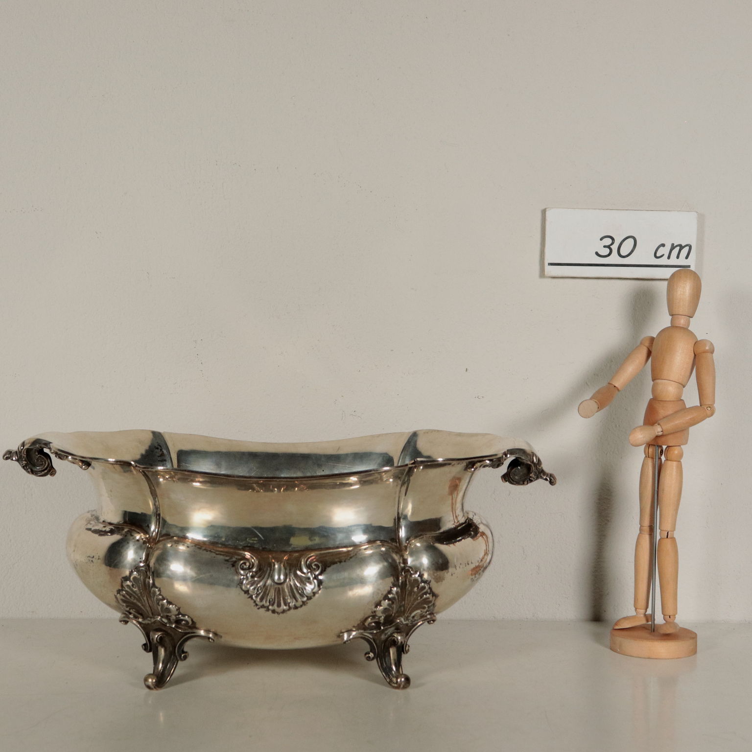 Centre de table en argent avec décorations à coquilles et volutes foliacés. Les décorations, les anses et les pieds ont un travail au ciseau raffiné. Marque d'argent incusso, mais le cachet de l'orfèvre milanais est difficile à lire. Gr.1736