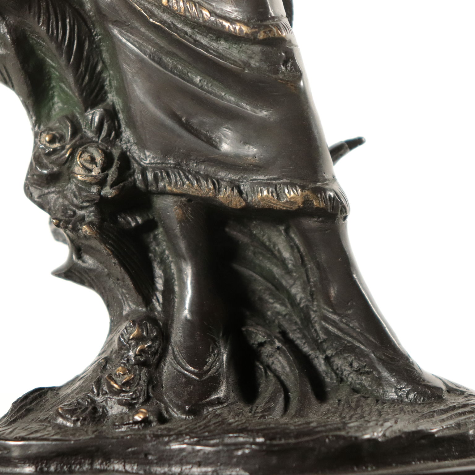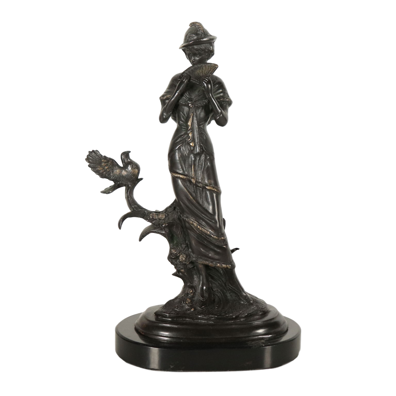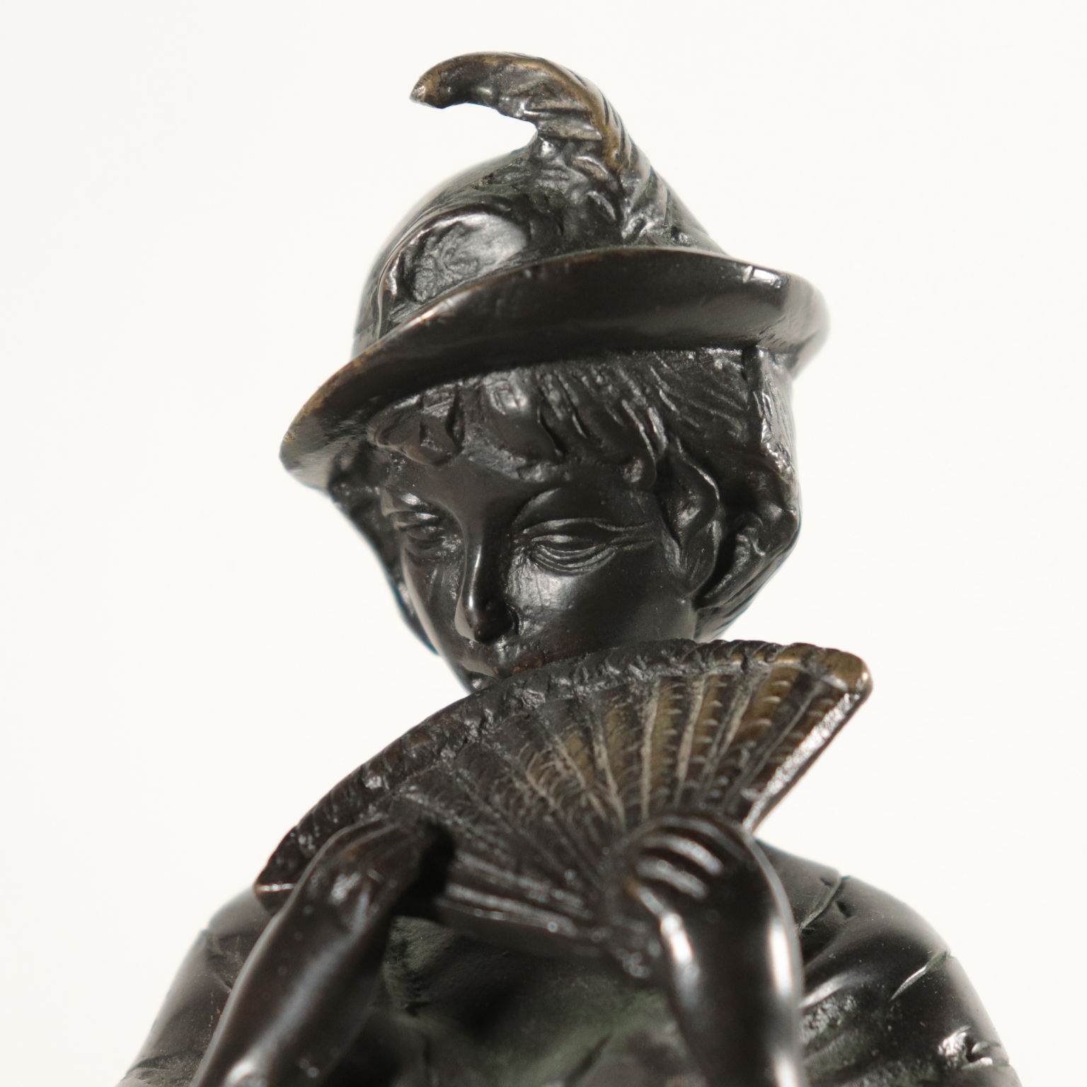 Sculpture en Bronze sur socle en marbre noir représentant une jeune femme avec un ventilateur. La base de signature incussa de l'artiste, mais pas très lisible.