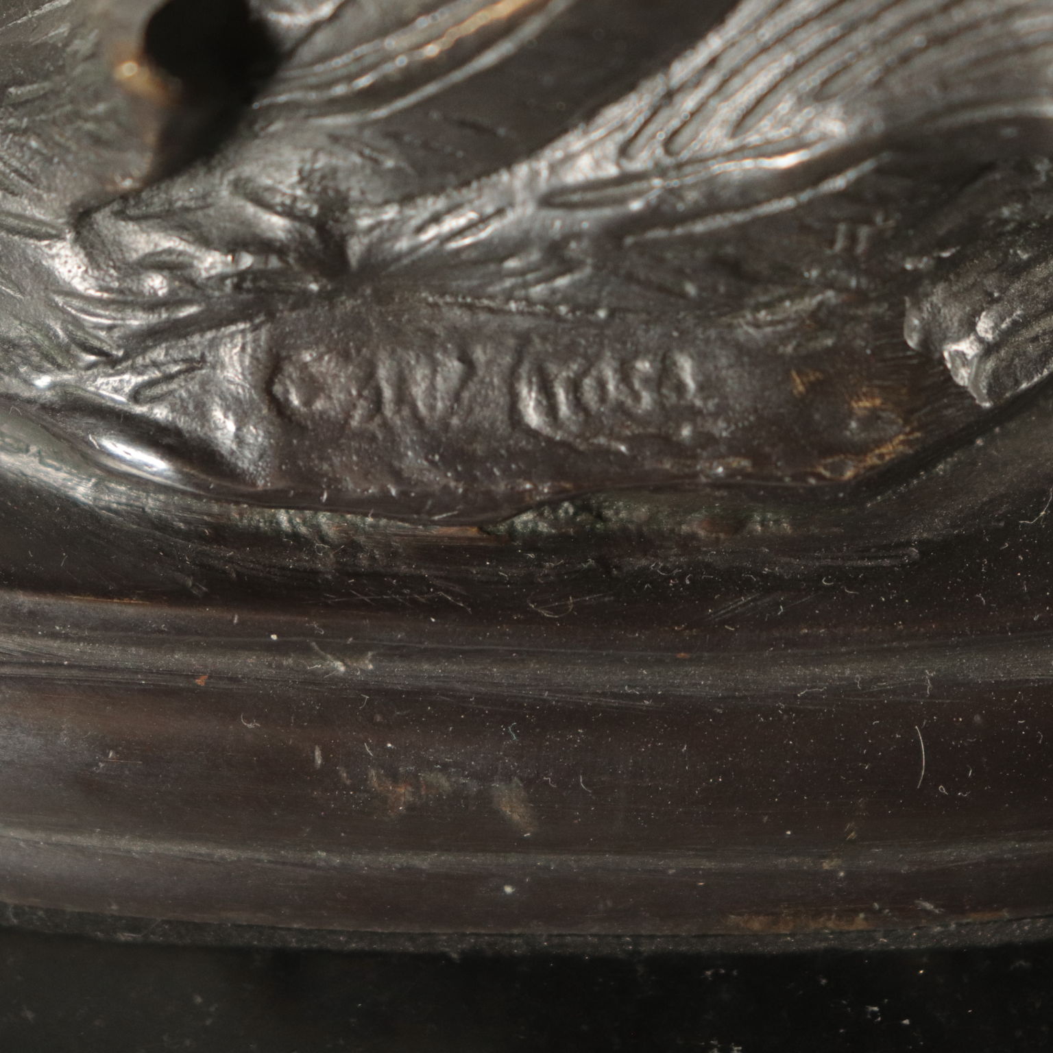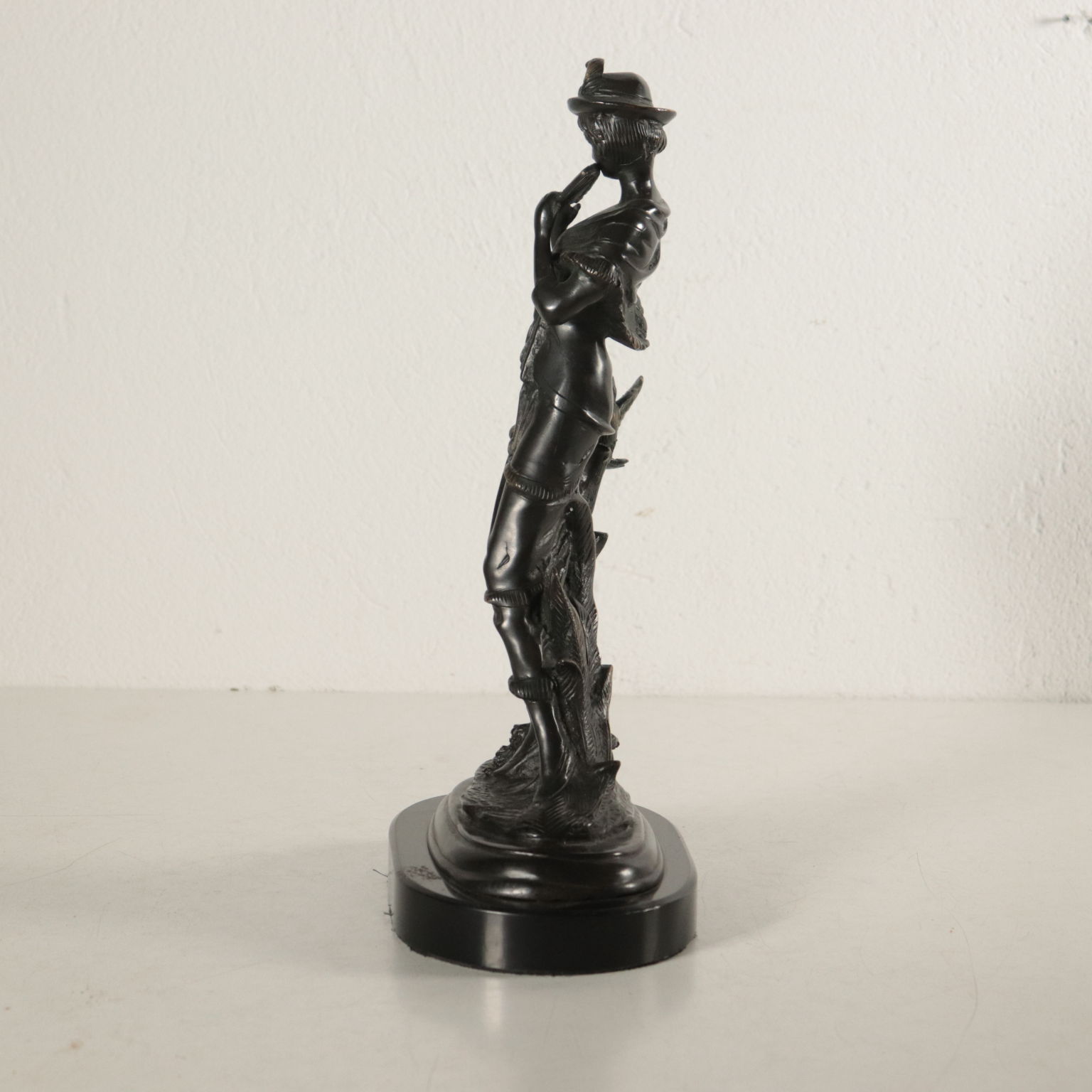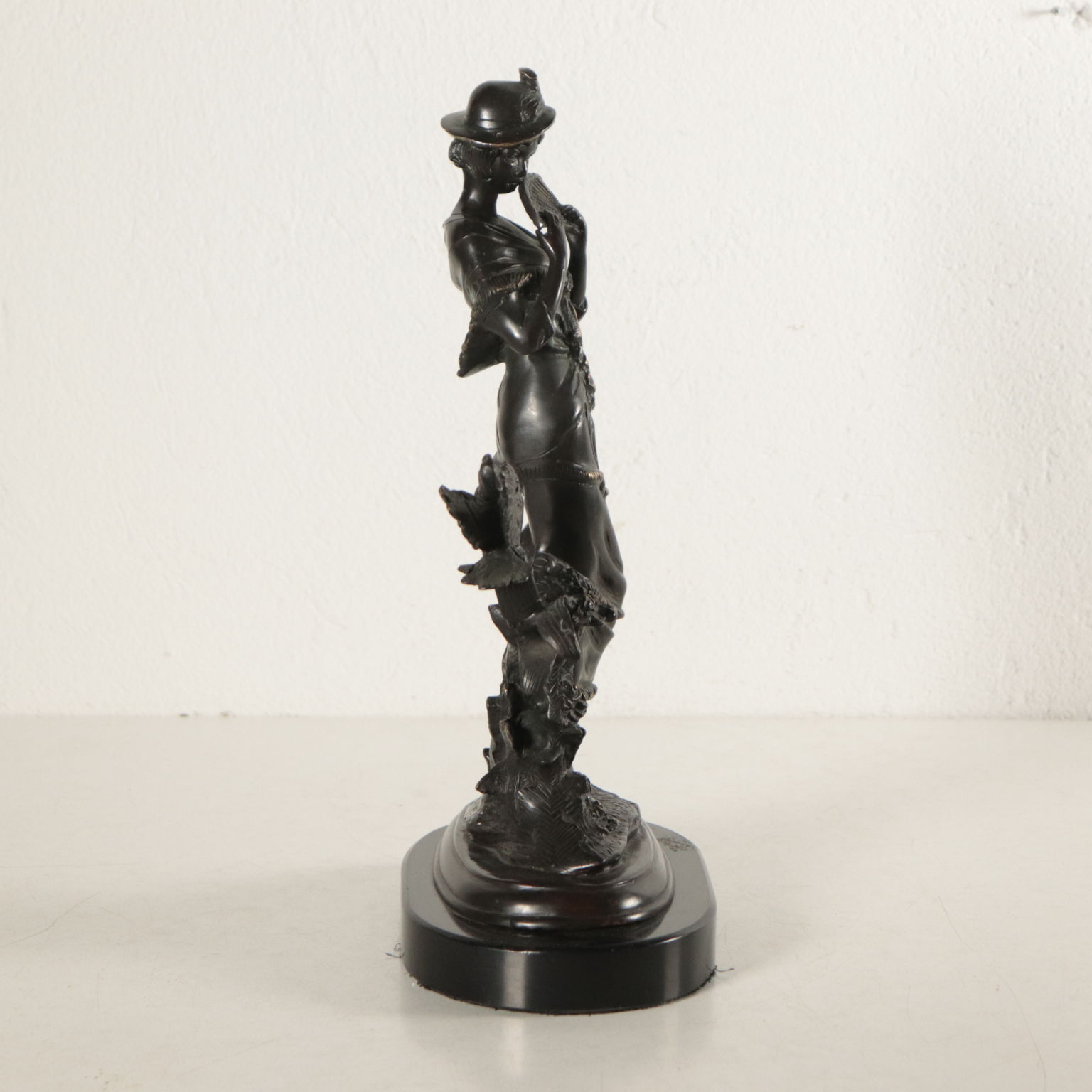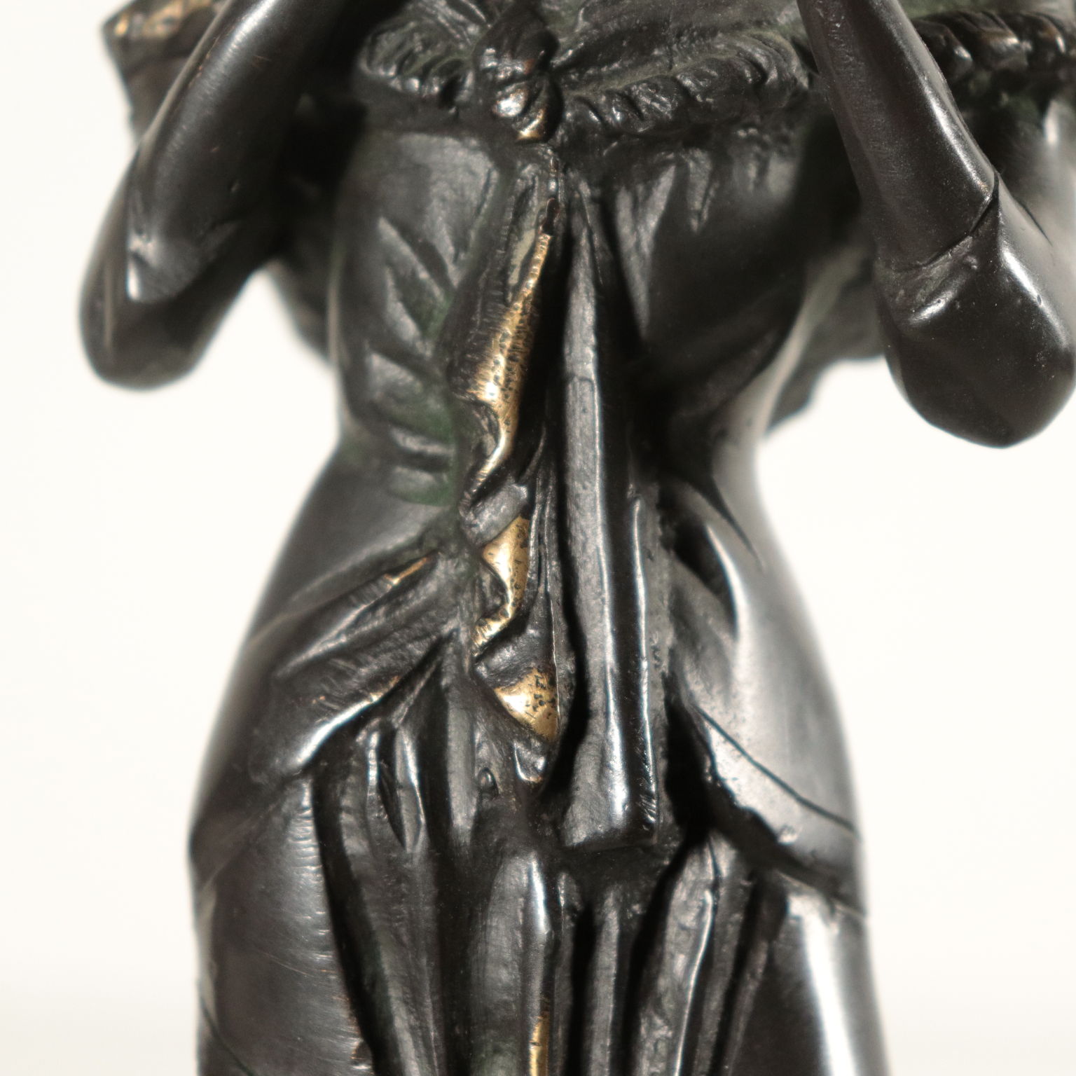 Sculpture en Bronze sur socle en marbre noir représentant une jeune femme avec un ventilateur. La base de signature incussa de l'artiste, mais pas très lisible.
