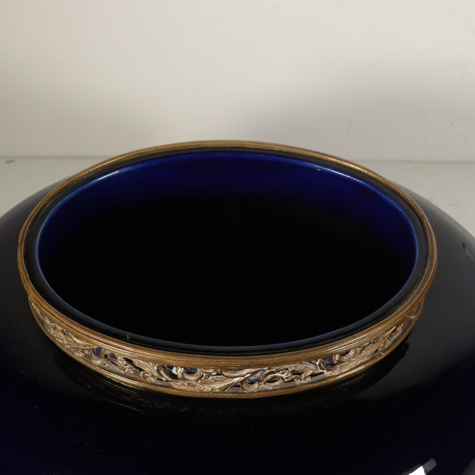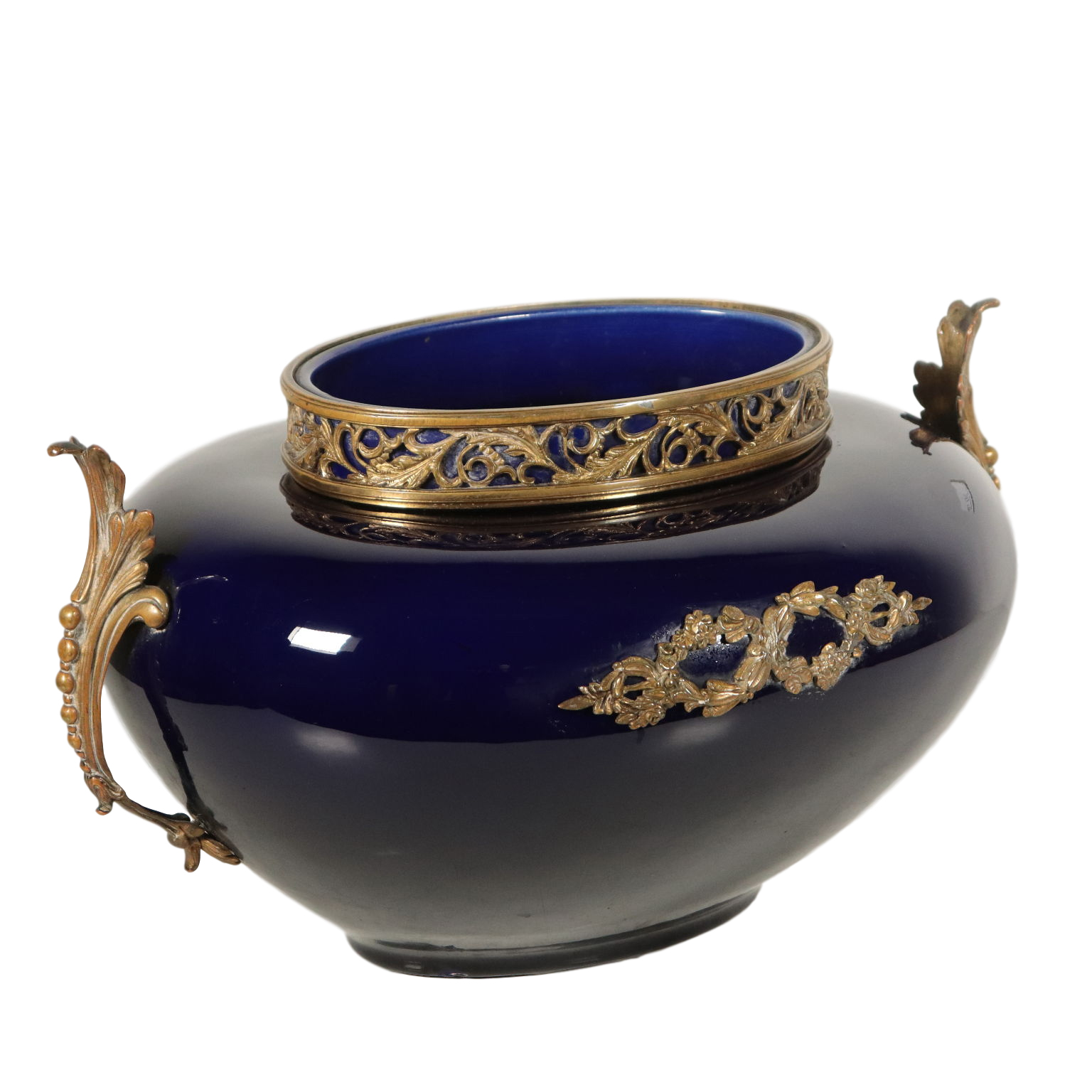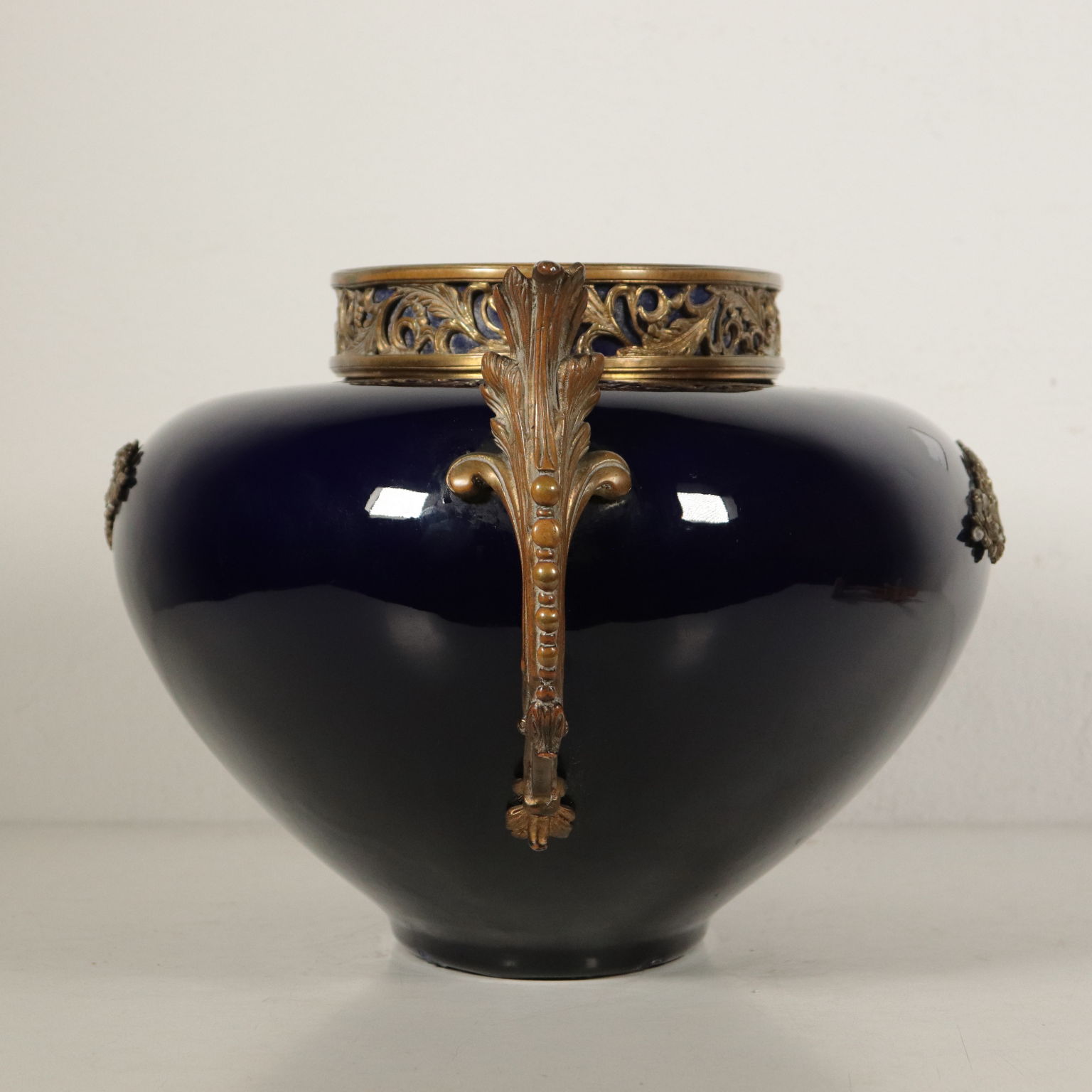 Vase en céramique bleue avec applications en bronze à motif végétal et guirlandes de fleurs. Anse en bronze avec des rouleaux de feuilles.
