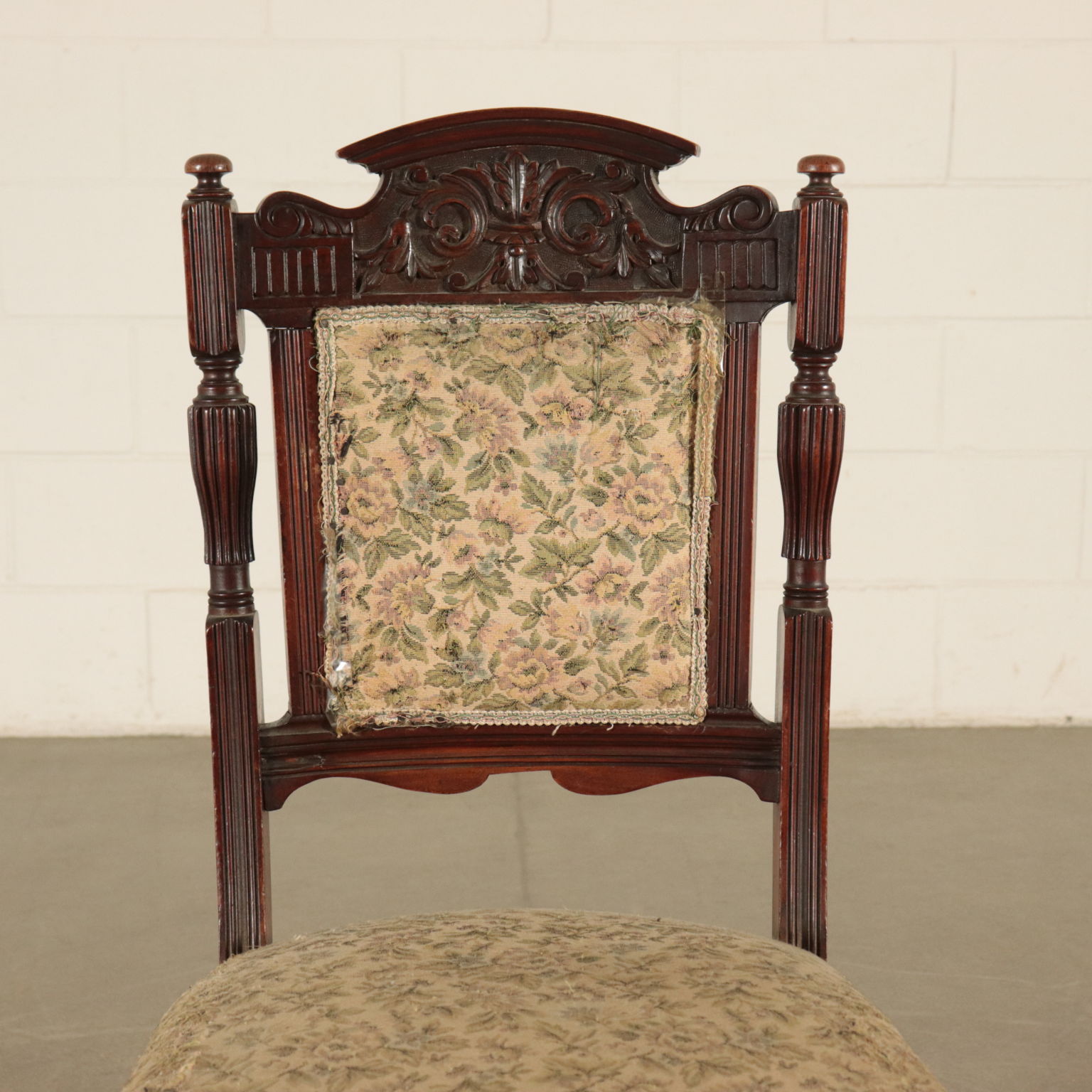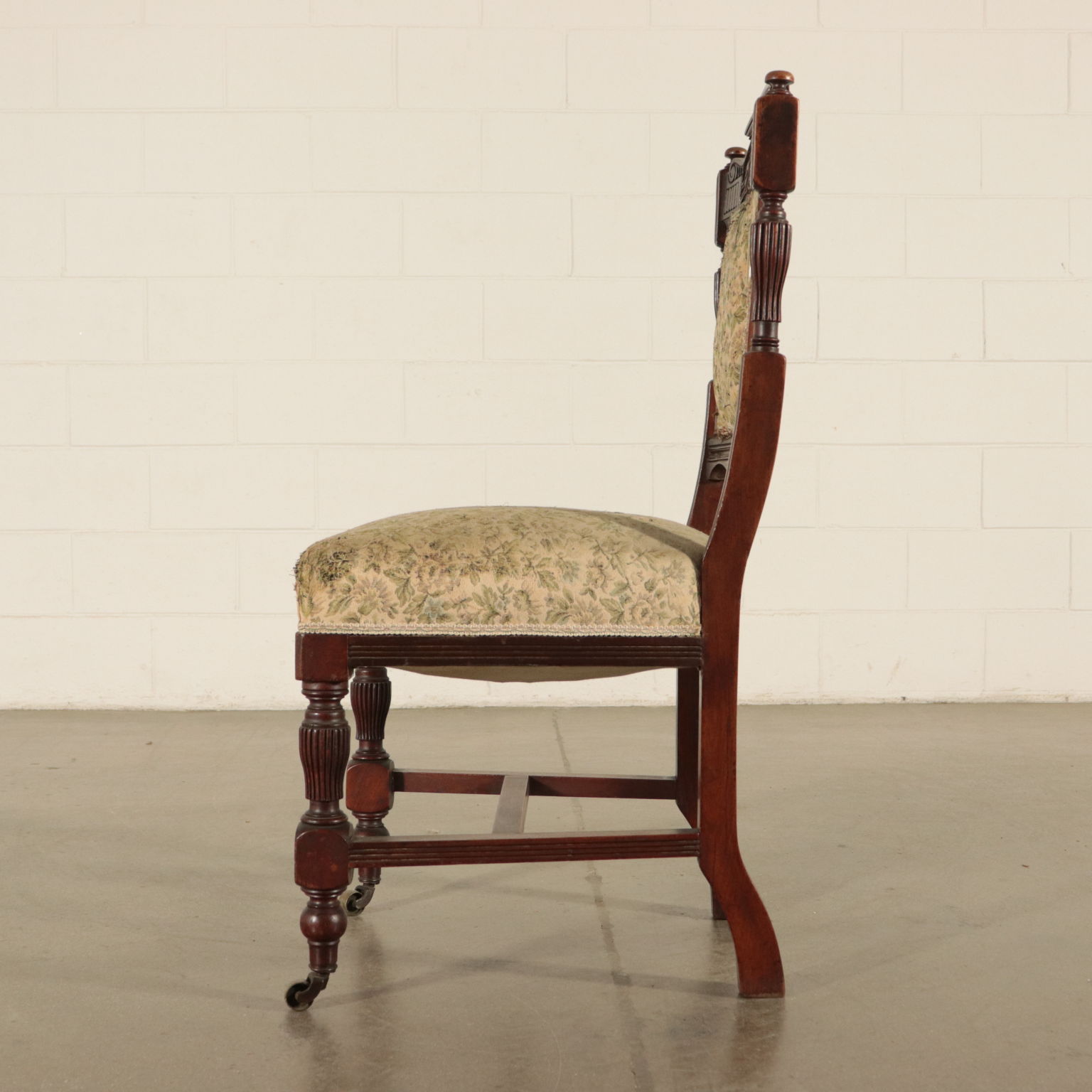 Suite de quatre chaises avec montants galbés, dossier et assise rembourrés. Cimaise sculpté. Pieds antérieur avec roues. Italie. Fin '800.