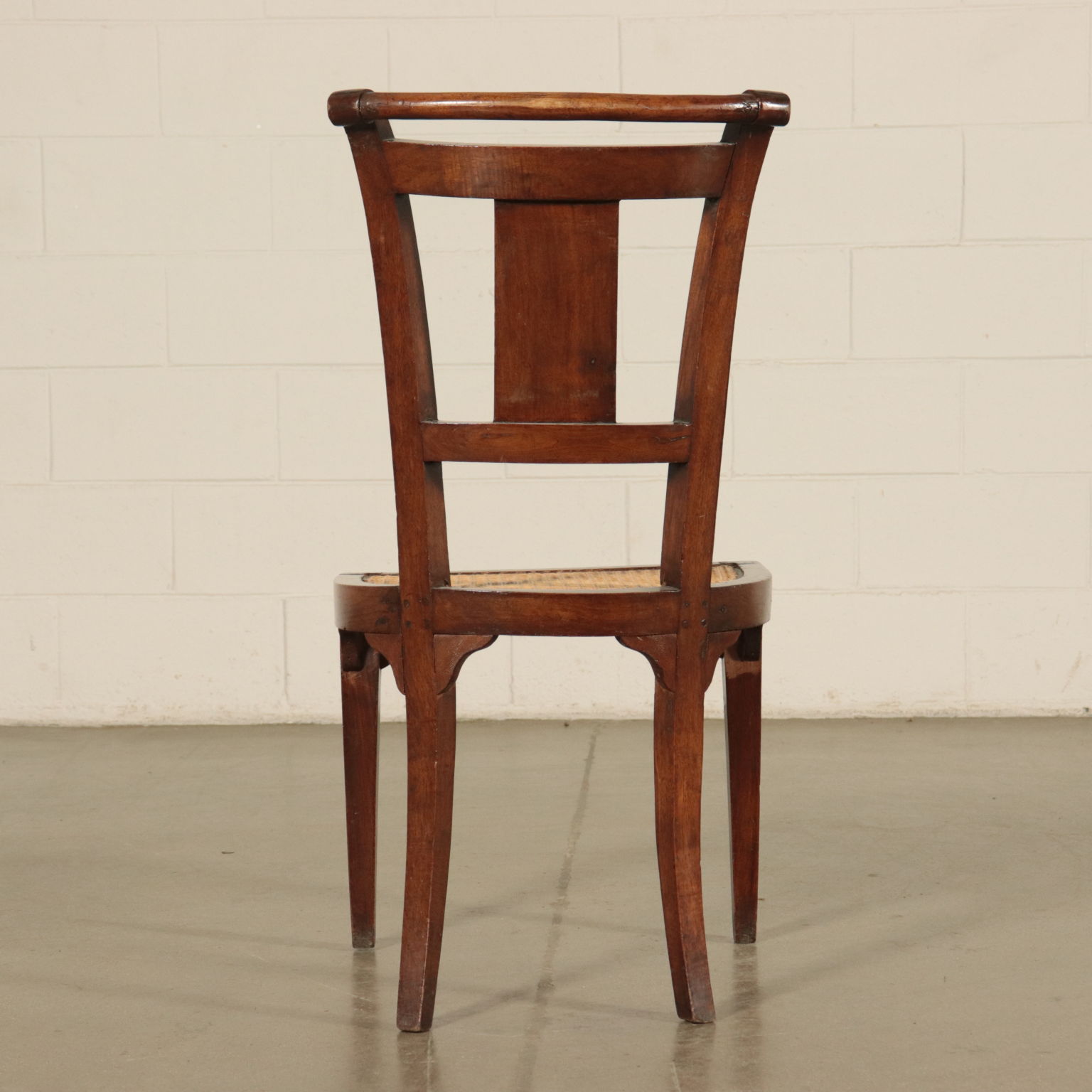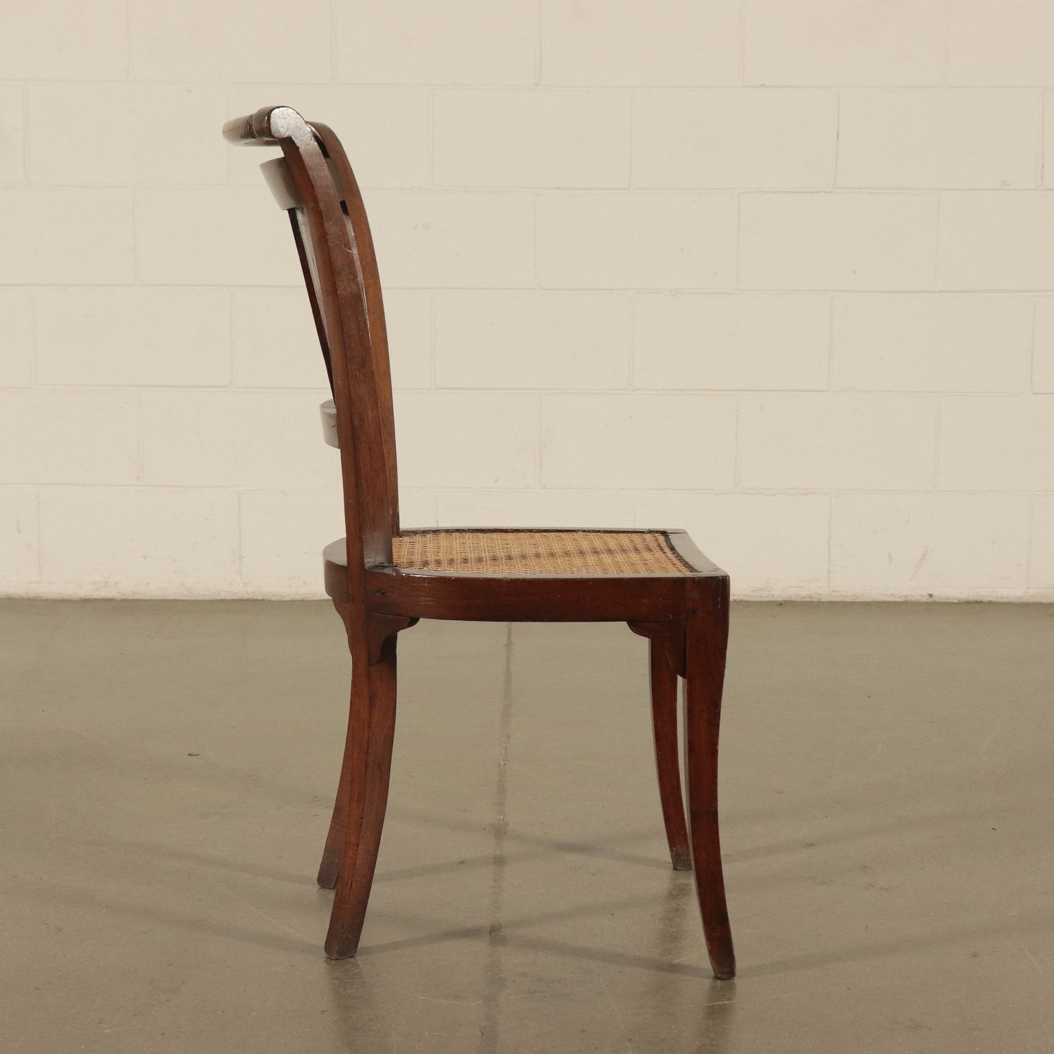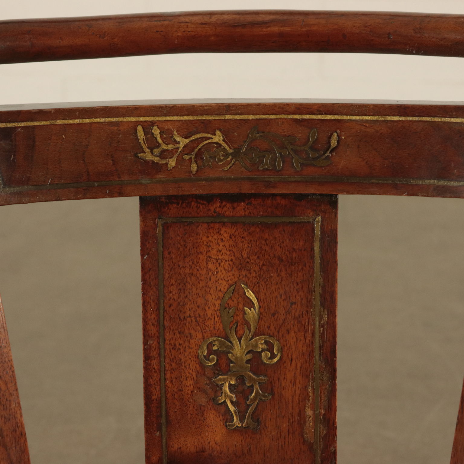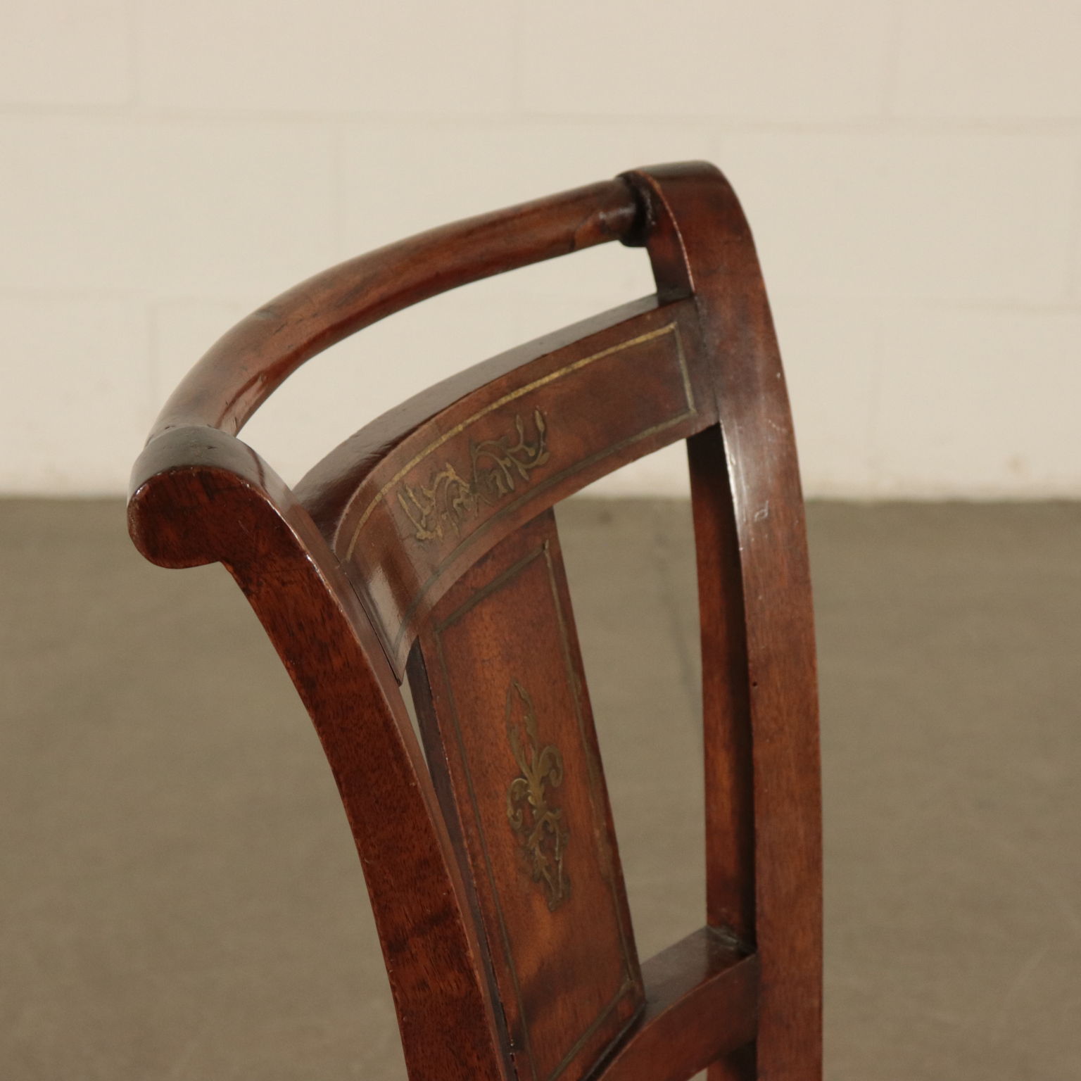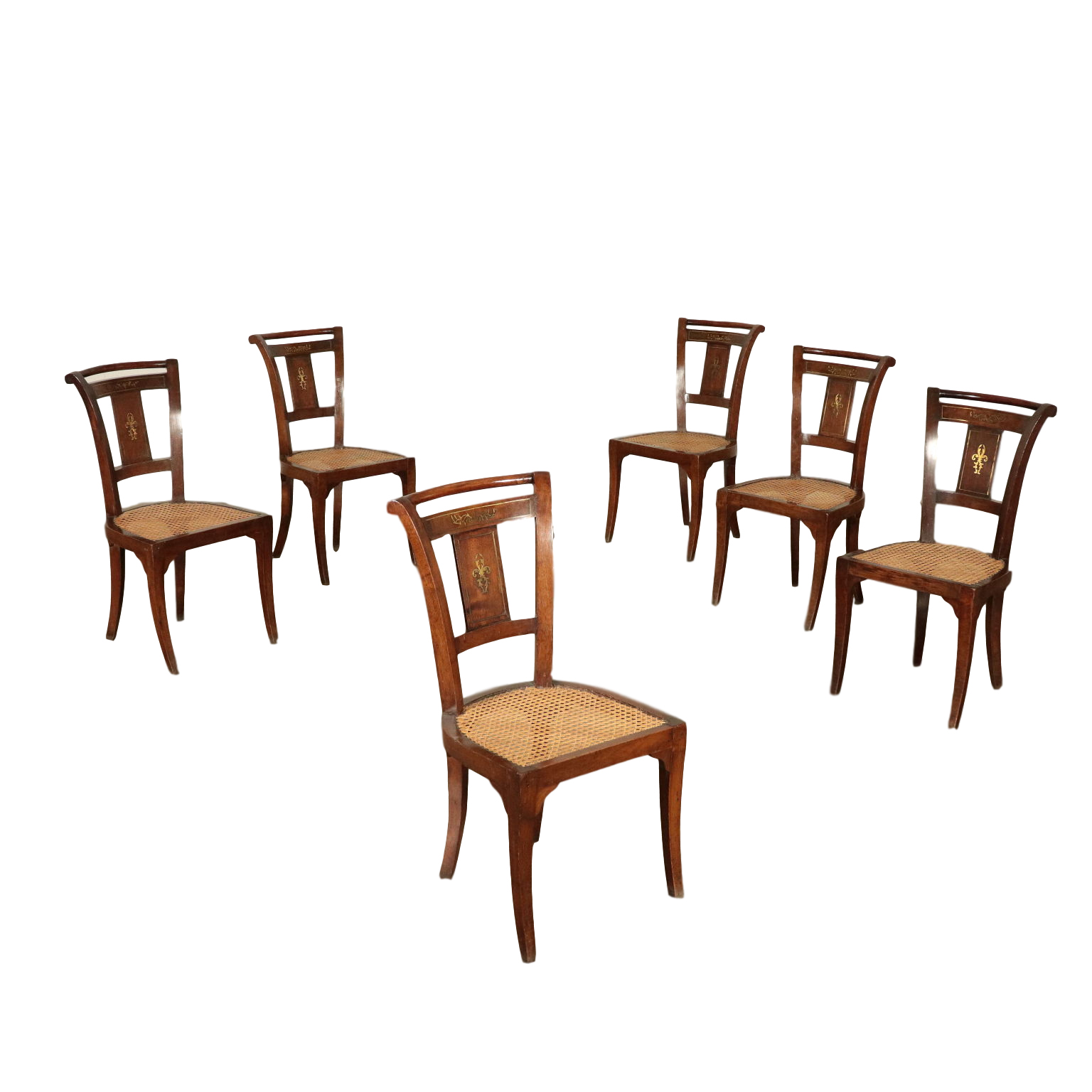 Groupe de six chaises sont pris en charge par saber jambes. Retour dans la journée avec des dossiers avec incrustations de laiton. Le siège rembourré.