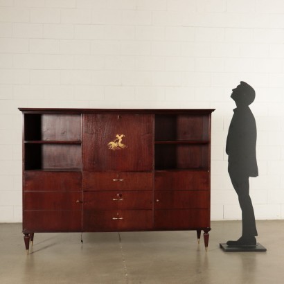 Meuble avec compartiment bar central avec ouverture à abattant, doubles portes battantes latérales, bois plaqué acajou teint, important dessin décoratif marqueté en laiton.