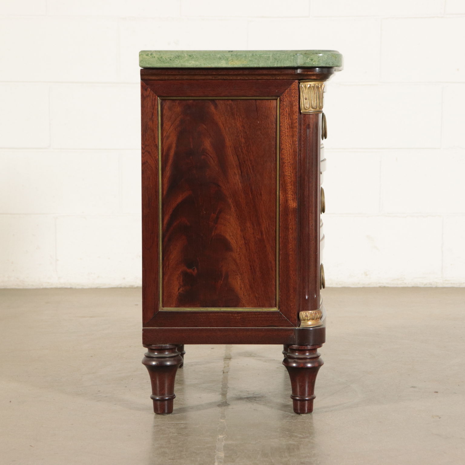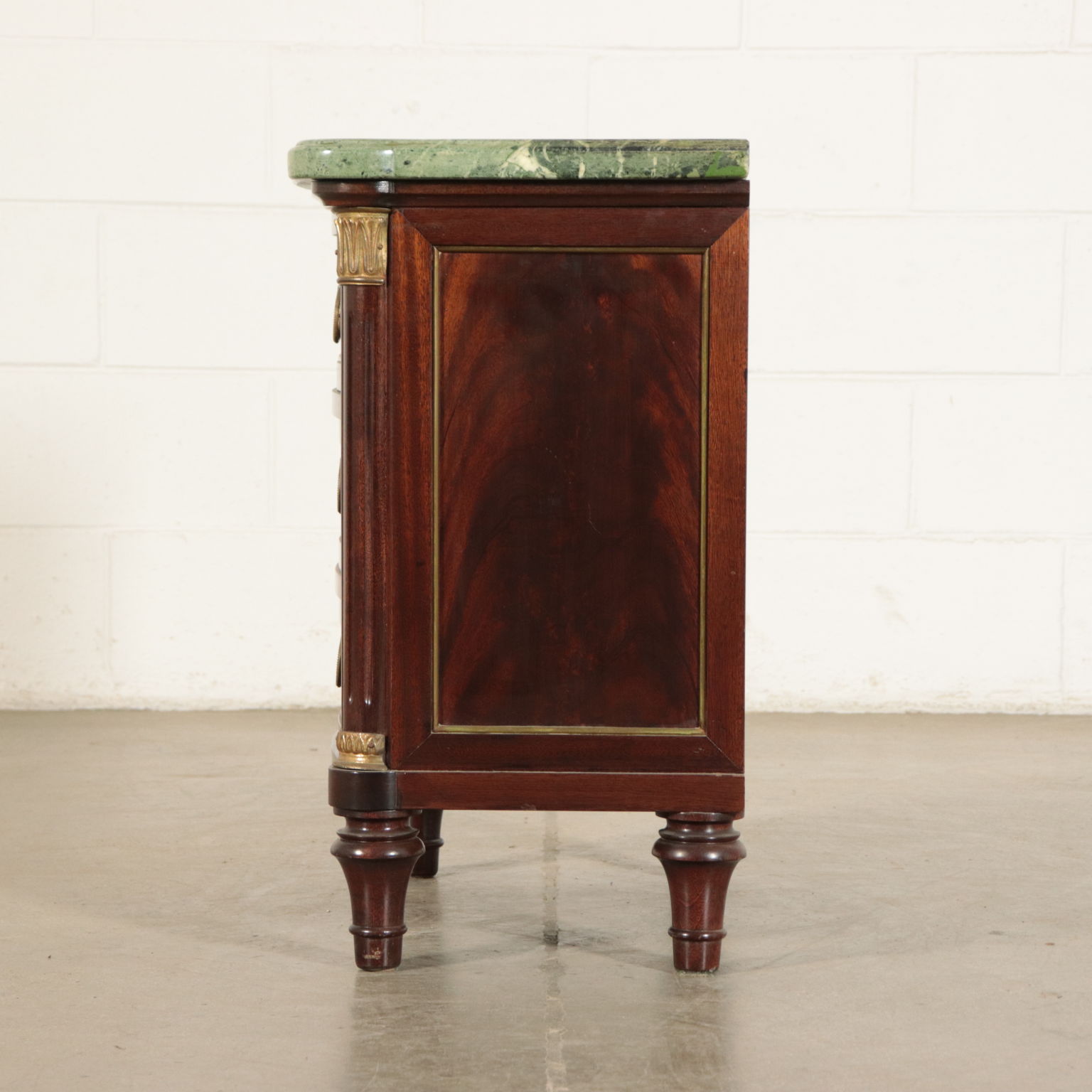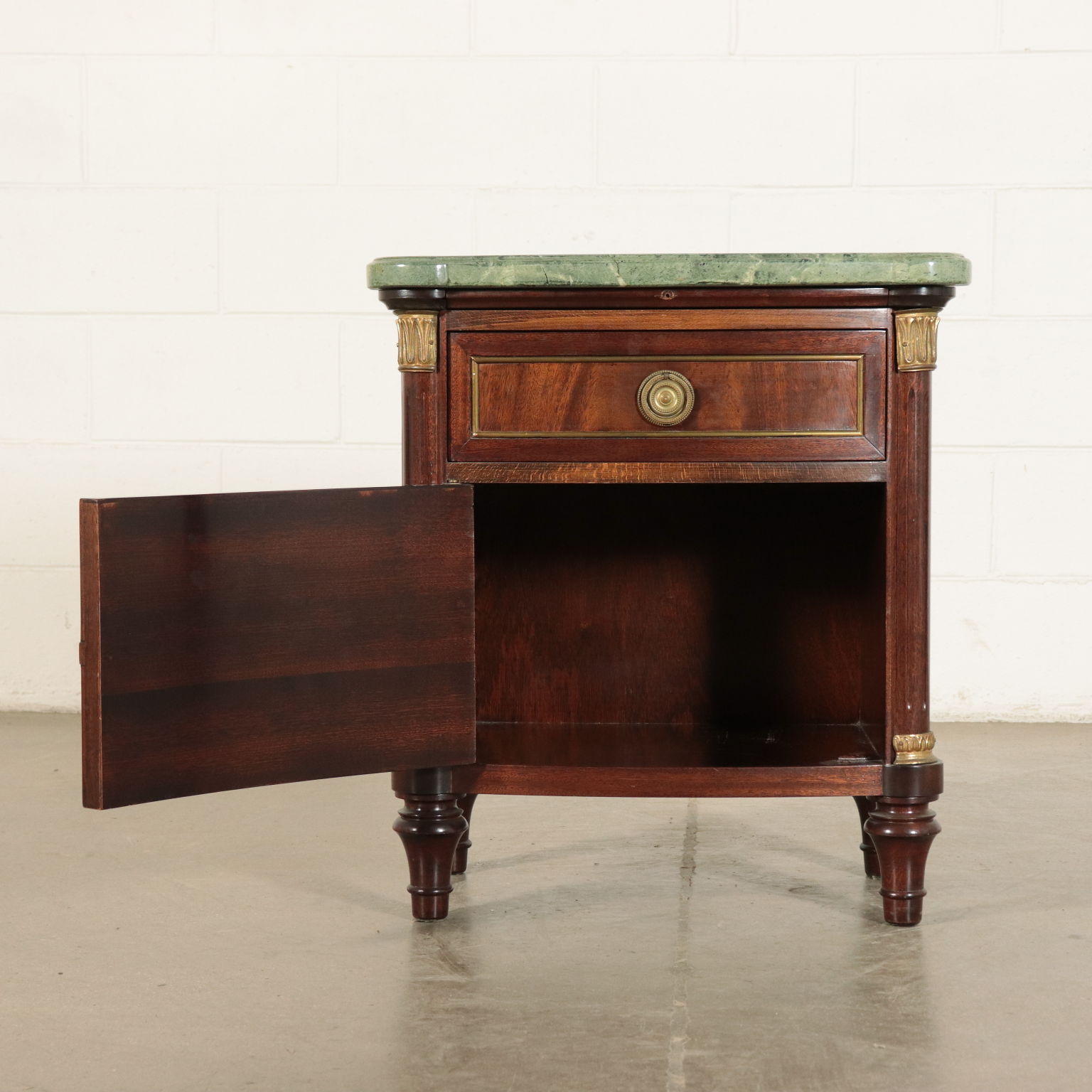 Description Chevet de style Napoléon III, montants à demi-colonnes et chapiteaux en laiton. Il a une porte et un tiroir. Dessus en marbre. Cadres en laiton. Italie. '900