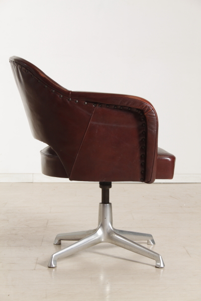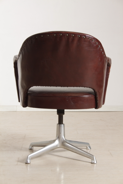 Fauteuil pivotant sur quatre courses en aluminium. Assise, dossier et accoudoirs en bois rembourrés sur le ciel.