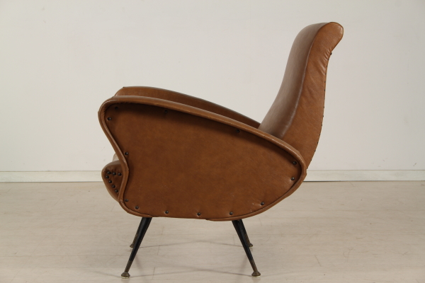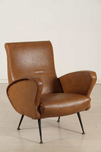 Fauteuil matelassé de mousse sur une bande élastique et ciel couvert à ; toujours originales. Les pieds sont en métal avec pied en laiton et orteil.