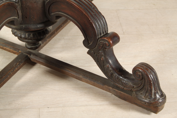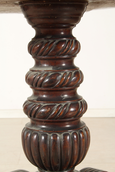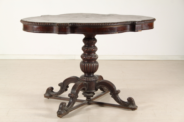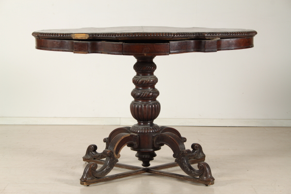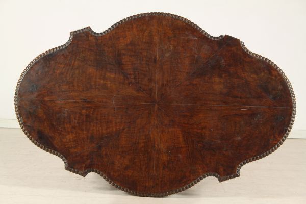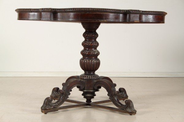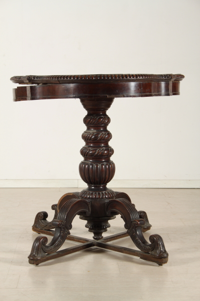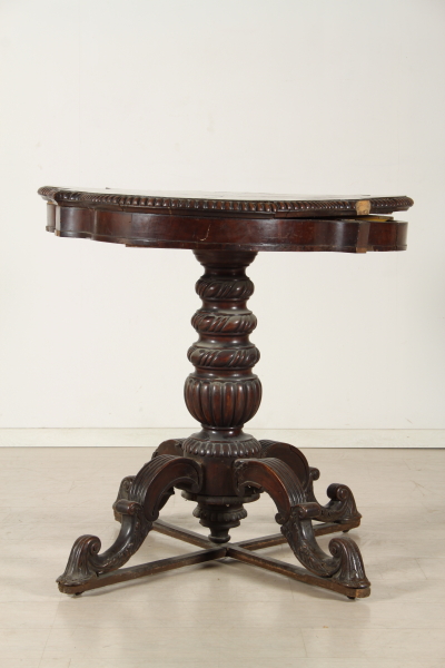Dessus façonné avec la bordure au sol structure du haricot. deux tiroirs dans le bandeau, une centrale tourné et sculpté de colonnettes. A quatre pattes et se déplace sculpté ; le plan est noyer avec Ă dans un modèle radial. Le dos d'un tiroir rapports écrits au stylo à encre : Maria Zappari, 18 février Piacentini 1866, à la mémoire des survivants lorsque vous aurez perdu ² je parmi les disparus.