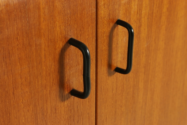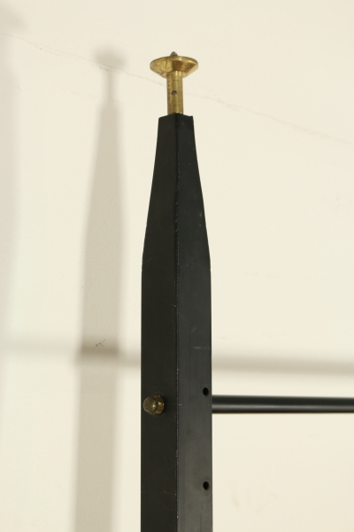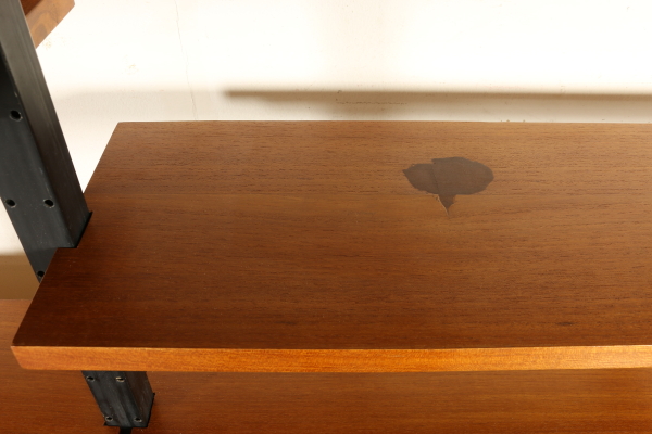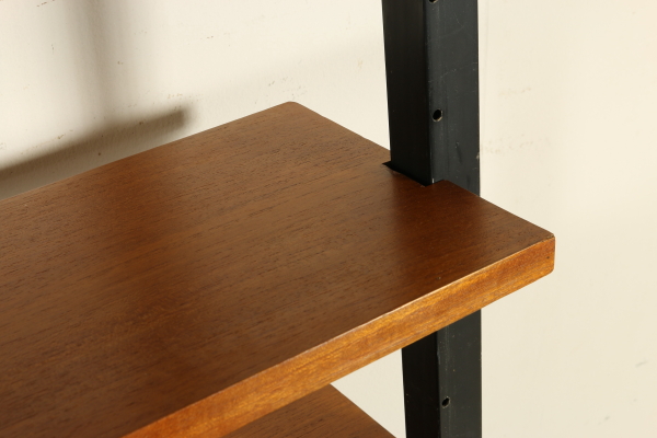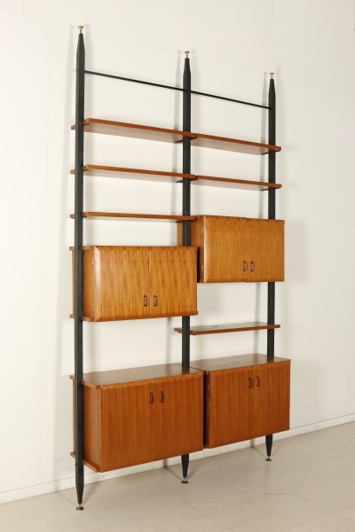 Libreria a soffitto, elementi regolabili in altezza, legno impiallacciato teak, metallo. Buone condizioni, è stata restaurata.