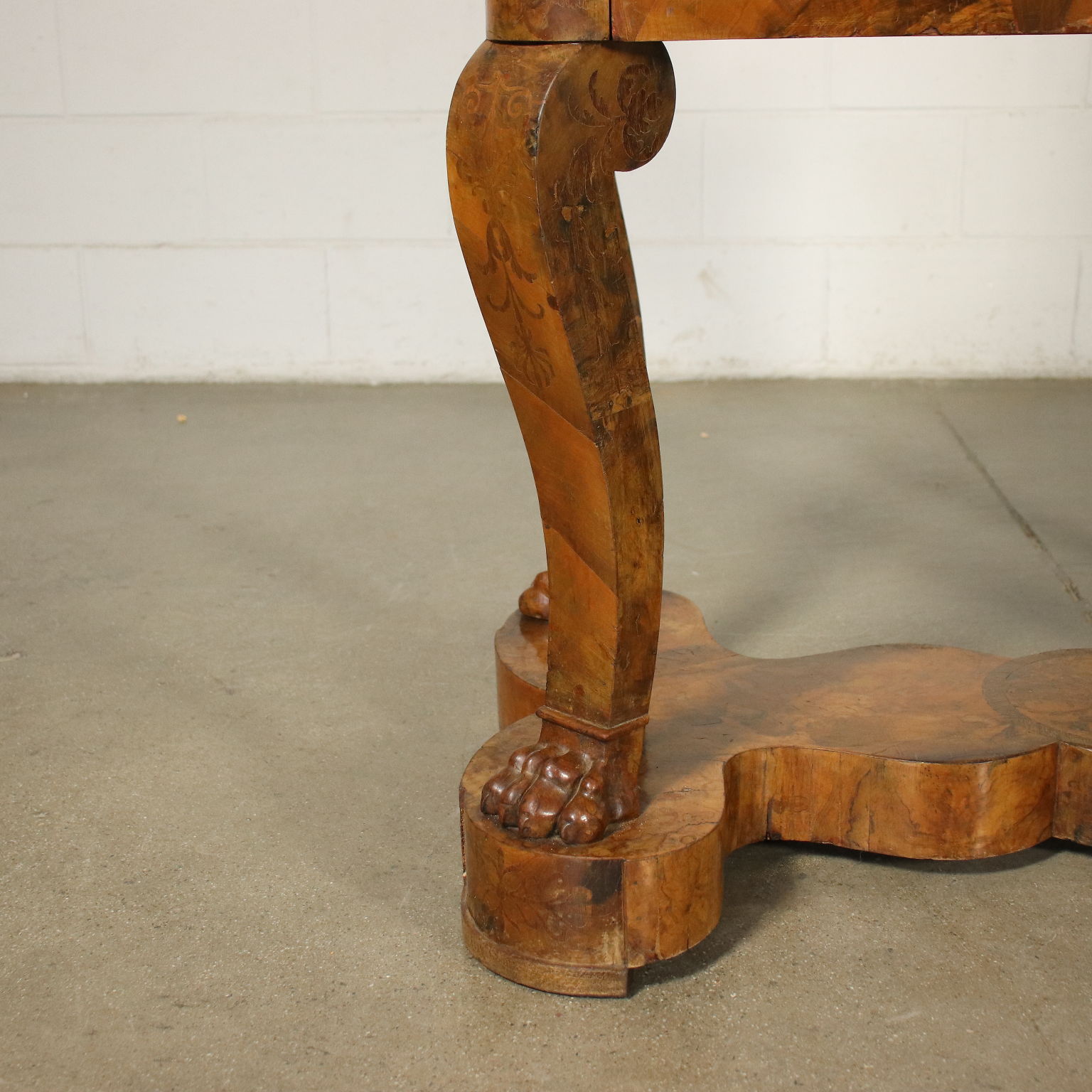 Console Charles X qui repose sur un plateau profilé, elle est soutenue par des montants ondulés et équipés de pieds de lion, dans la bande sous le plateau il y a un tiroir avec des compartiments. Sur le dessus en marbre reposent les montants qui terminent avec des boucles et soutiennent le miroir psyché. Placage de bruyère avec incrustations de goût Charles X, les intérieurs sont en peuplier.