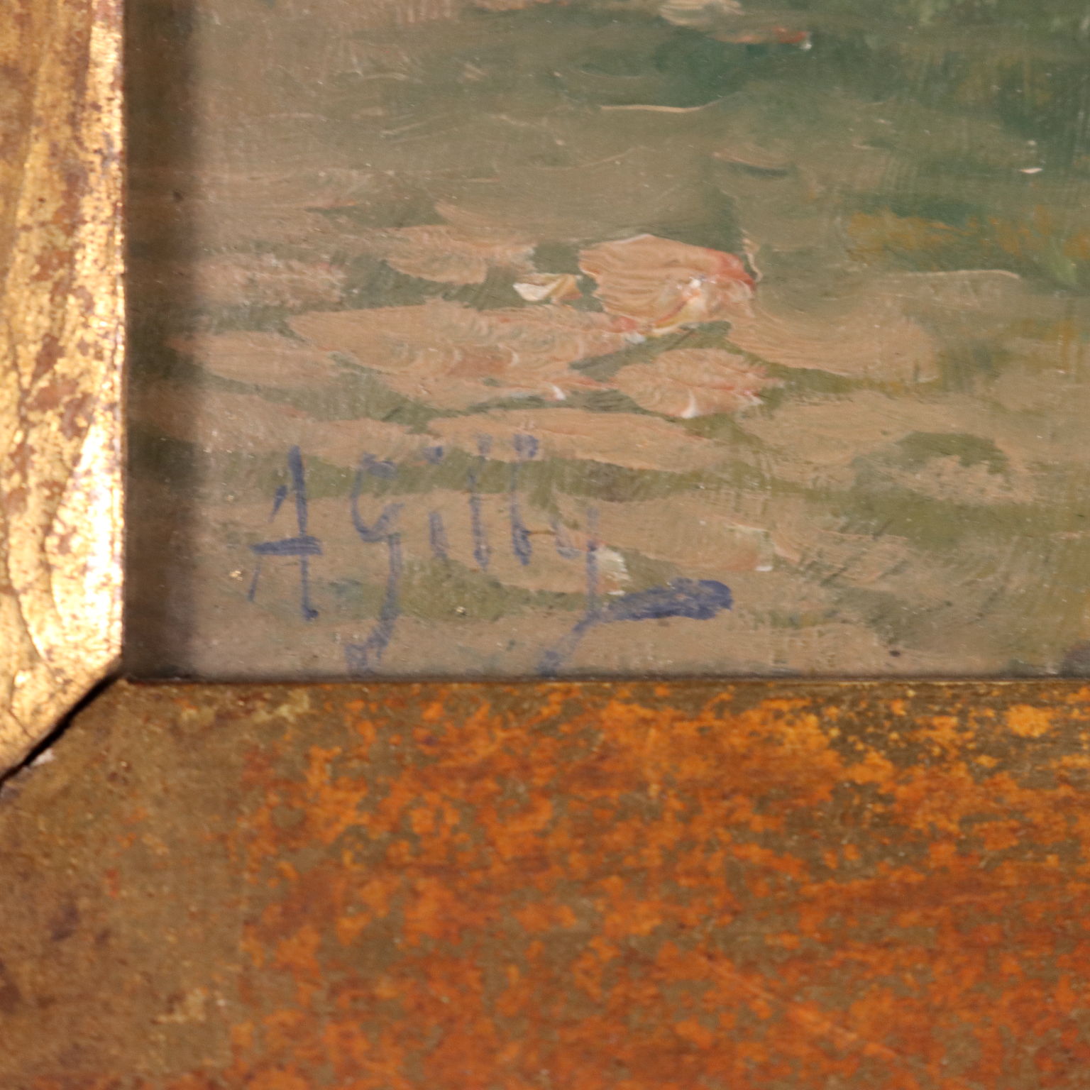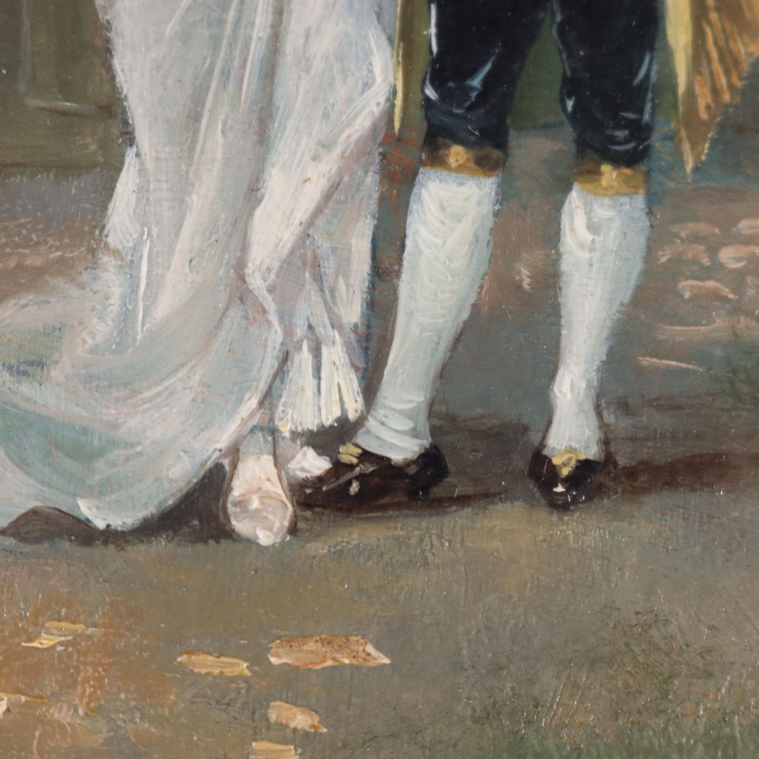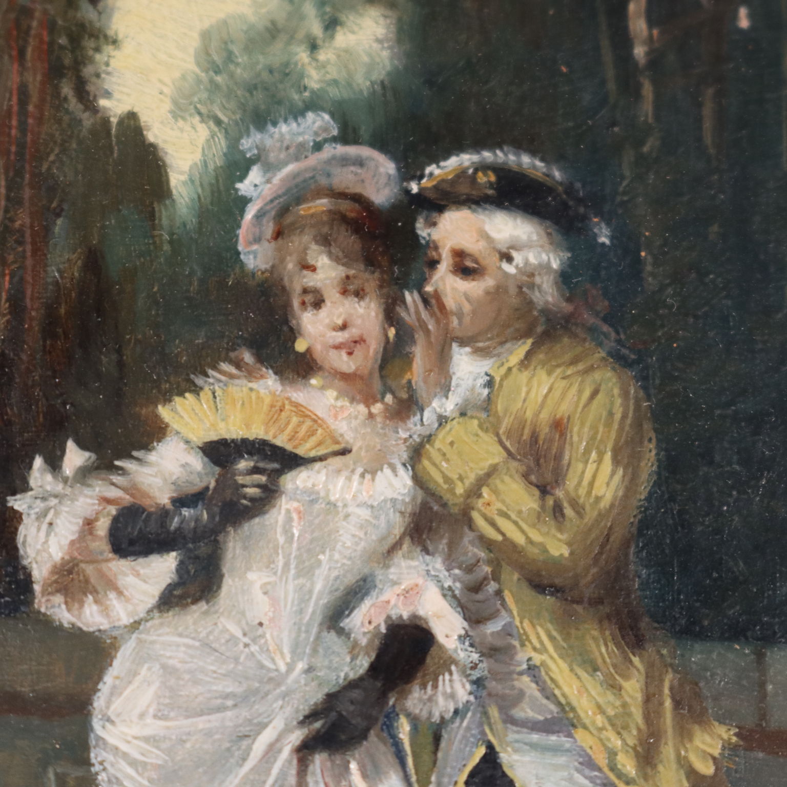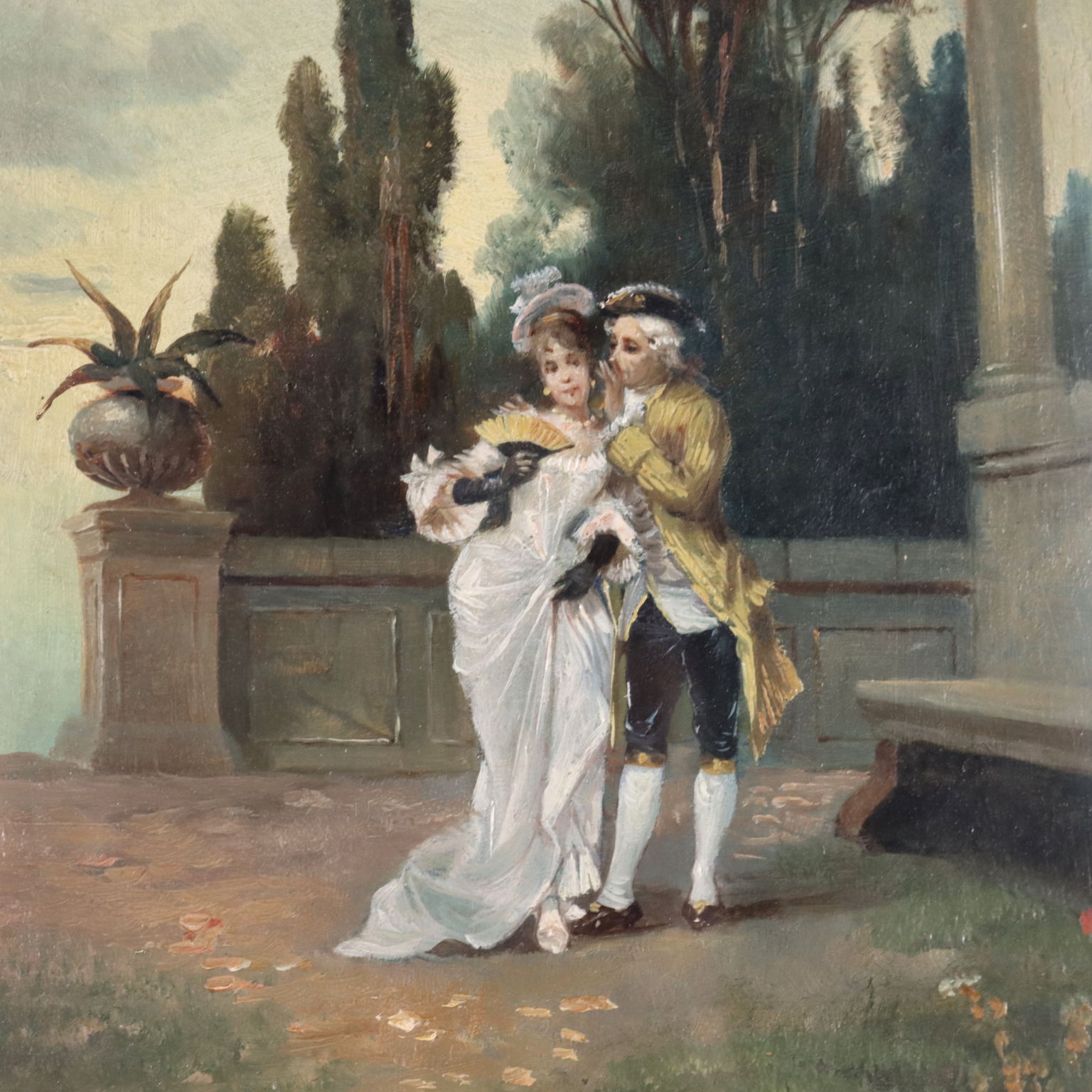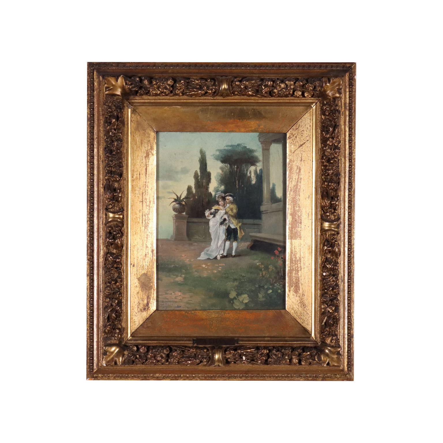 Huile sur la table. Signé A. Gilly en bas à gauche. Au dos cette étiquette en papier avec numéro d'inventaire et titre en allemand. La jolie scène représente, à l'intérieur d'un jardin avec balustrade et colonnes, un chevalier déterminé à parler à l'oreille d'une dame, comme s'il lui confiait un grand secret ! Le tableau est présenté dans un cadre travaillé contemporain.