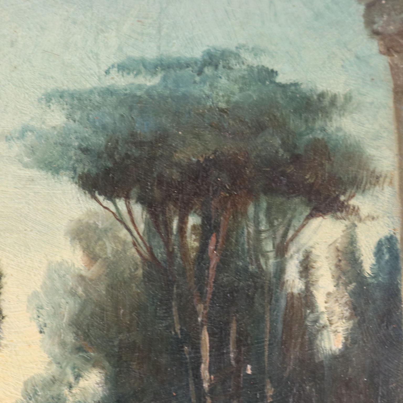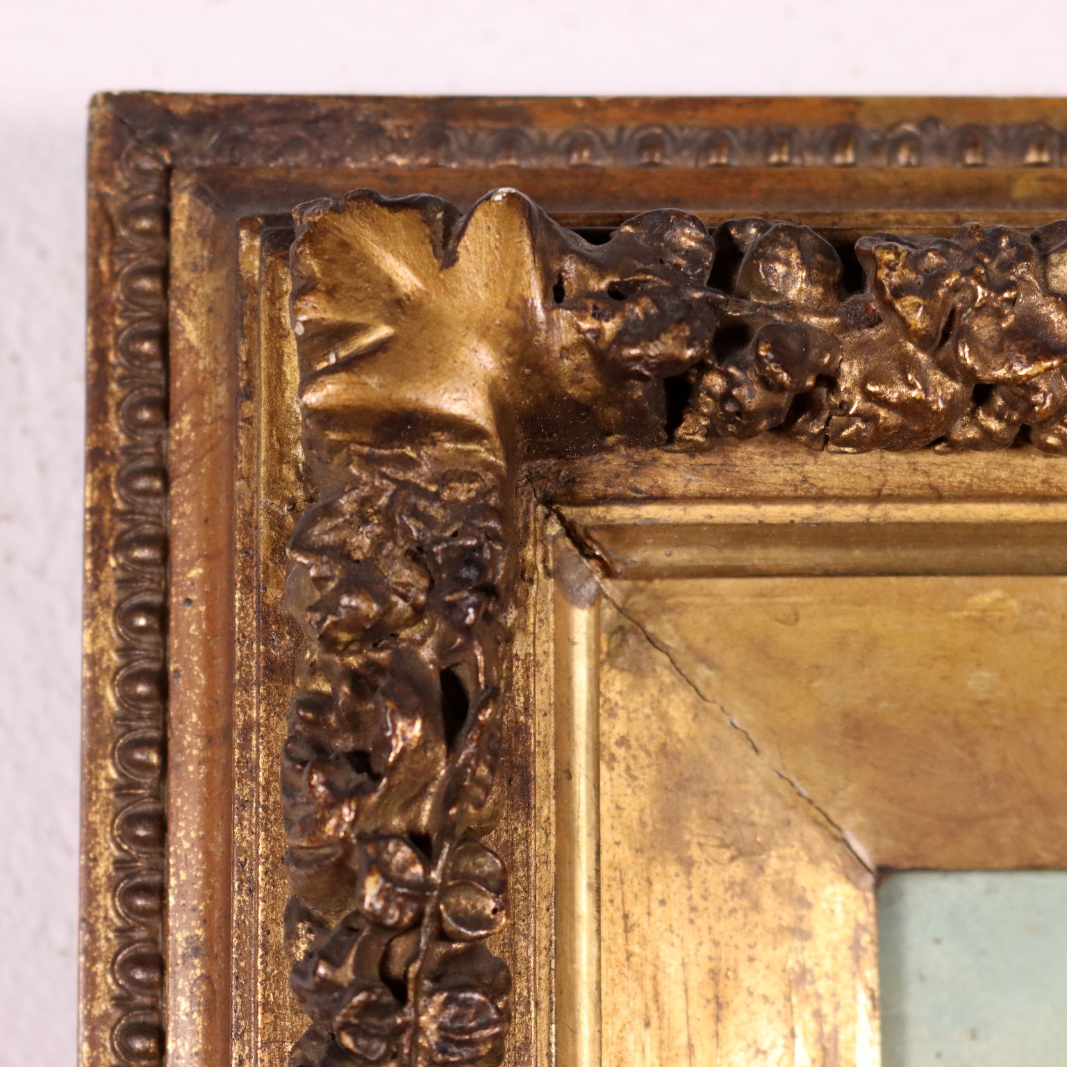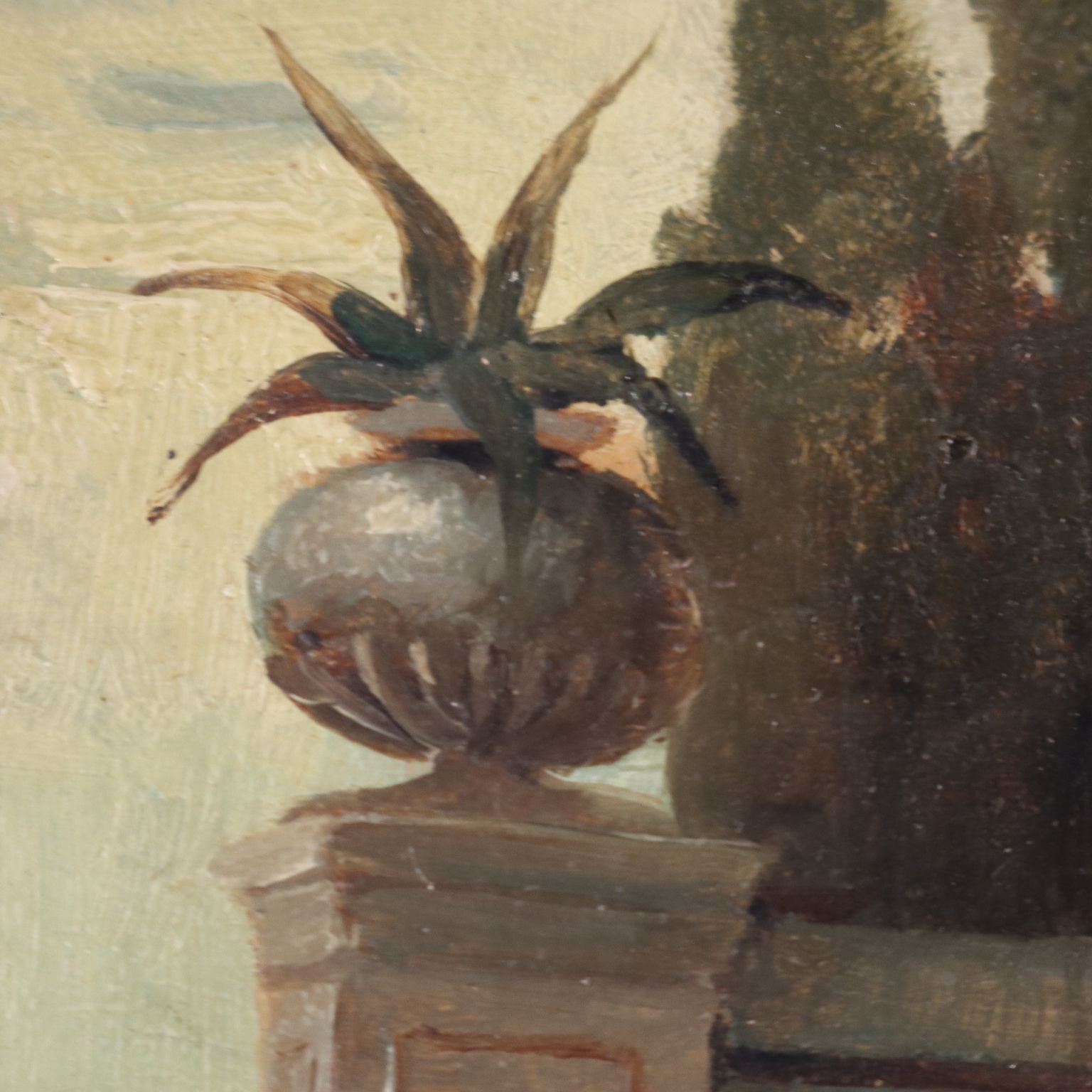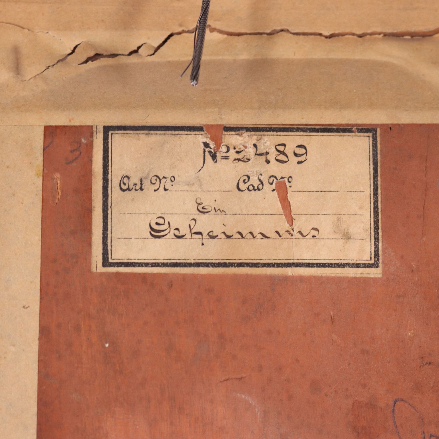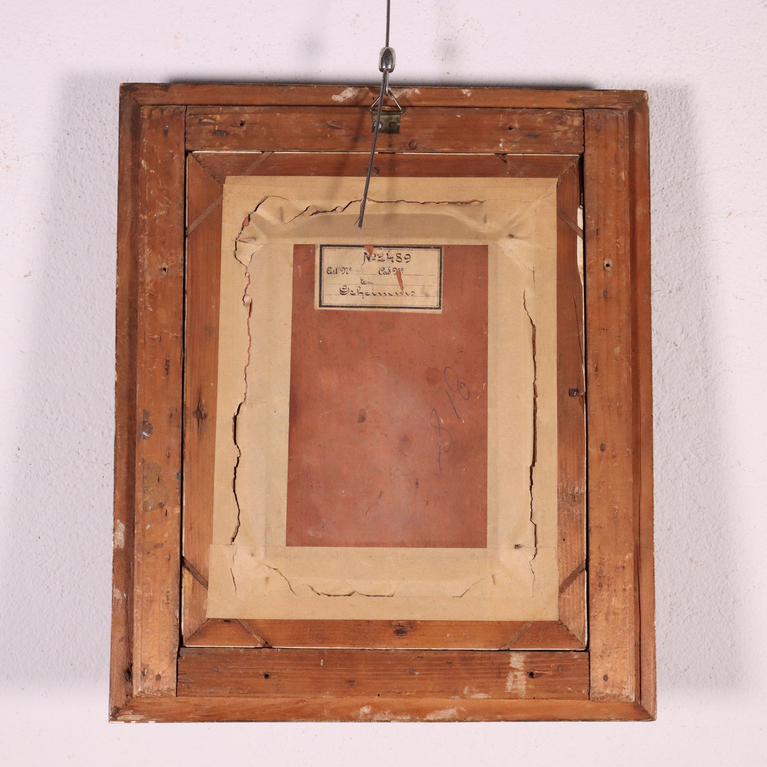 Huile sur la table. Signé A. Gilly en bas à gauche. Au dos cette étiquette en papier avec numéro d'inventaire et titre en allemand. La jolie scène représente, à l'intérieur d'un jardin avec balustrade et colonnes, un chevalier déterminé à parler à l'oreille d'une dame, comme s'il lui confiait un grand secret ! Le tableau est présenté dans un cadre travaillé contemporain.