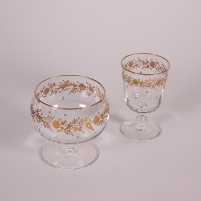 Série de verres en cristal taillé et rehaussé d'or. Le raffinement de la décoration met en valeur l'excellente qualité de la fabrication. Service consistant en: deux bouteilles (un sans bouchon), un pot, un bol et deux verres de tasse, douze coupes en demi-lune pour apéritifs, douze verres à eau, verres à vin dix, onze flûtes, douze verres pour-alcool de cognac, douze verres à liqueur, onze verres à caviar.