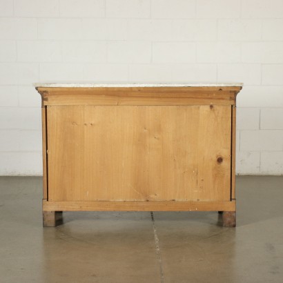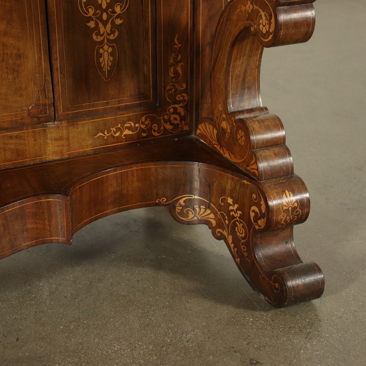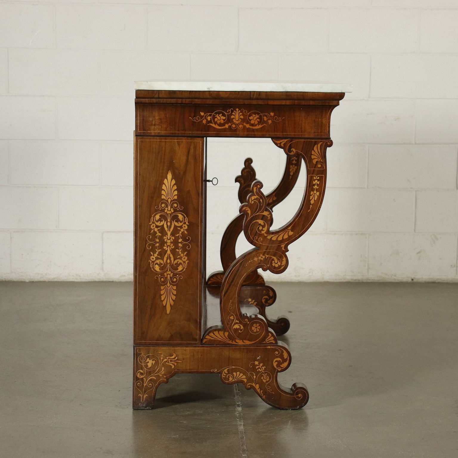 Console d'époque Charles X, en noyer avec incrustations d'érable, les montants à volutes opposées reposent sur un socle soutenu par des pieds galbés, en bas une porte ouvrante donne accès à certains compartiments. Toute la surface est incrustée de motifs phytomorphes ; plateau en marbre blanc.