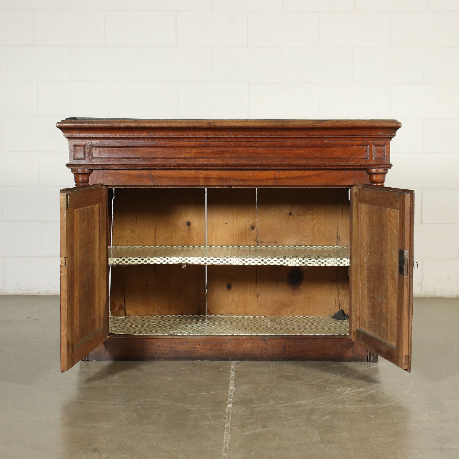 Description Buffet néoclassique lombard, à l'avant il a deux portes à panneaux; les montants, tant à l'avant qu'à l'arrière, sont des éléments tronconiques effilés, serrés en haut par un collier tourné. En noyer, le plateau est en comparaison en marbre noir et présente des fissures.