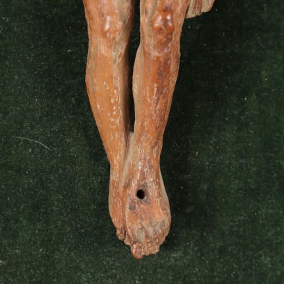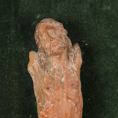 Cadre en bois sculpté et tablette avec dorure contemporaine. Décorations en pastille avec angelots, motifs végétaux et éléments remontant à la Passion du Christ. Au centre, Christ en bois de tilleul laqué avec manques évidents et laque largement usée. La sculpture représentant le Christ en croix est contemporaine du cadre.