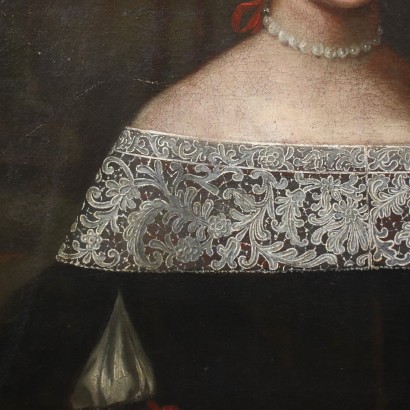 Huile sur toile. École lombarde du XVIIe siècle. Une jeune fille souriante est représentée dans une élégante robe noire, agrémentée de dentelle sur le décolleté et d'un jeu de dentelles et de rubans rouges et verts sur les manches, assortis au jupon brodé rouge ; elle porte ses bijoux autour du cou, des poignets, des oreilles, dans la coiffure de ses cheveux, où l\'austérité des perles est allégée par des rubans colorés ; elle tient un bouquet de fleurs dans sa main, ce qui souligne sa grâce et sa grâce. Restauré et rentoisé, sur la deuxième toile il est écrit, probablement une copie de l'original sur la première toile, qui indique qui est la jeune femme : " Margh.a D. Gridonia Gonz. Agnella - Soada Maffei - D'etta Anni XVIII », suivi d'un blason avec les initiales C FAS Cette écriture, en plus de définir le nom et l'âge, met en évidence l'appartenance de la jeune femme au Collège des Vierges de Jésus de Castiglione delle Stiviere, fondé en 1608 par la marquise Guidonia Gonzaga avec les deux sœurs Cinzia et Olimpia, toutes neveux de San Luigi Gonzaga. Ce collège avait pour but de donner une éducation aux jeunes nobles ou aux jeunes gens de bonnes familles, qui, avec la dot donnée au collège, contribuaient à la subsistance de celui-ci. Le portrait a des défauts mineurs. Il est présenté dans un cadre ancien, non contemporain, avec de petits défauts.