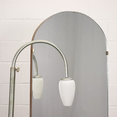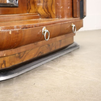 Coiffeuse Art Decò, en façade elle a un tiroir et une porte; sur le dessus reposent un miroir et une lampe à arc. Plaqué noyer et ronce de noyer.