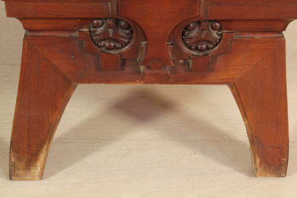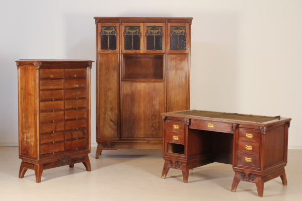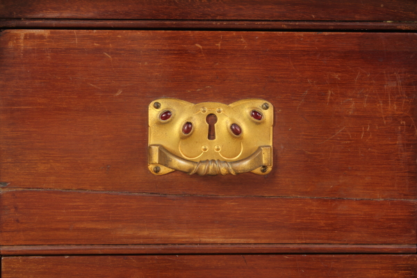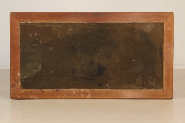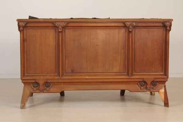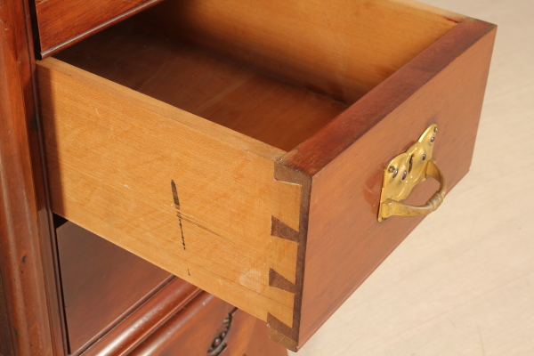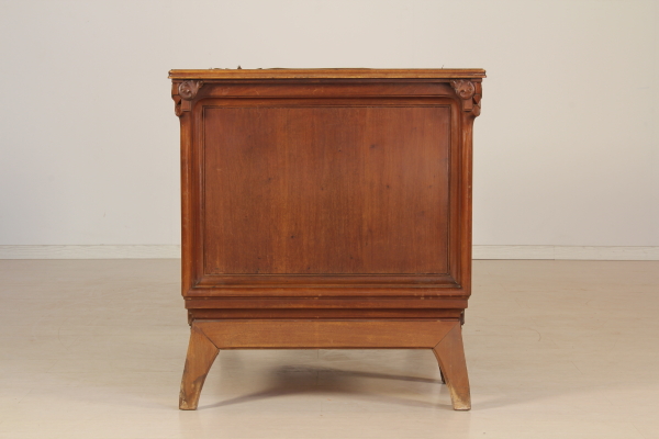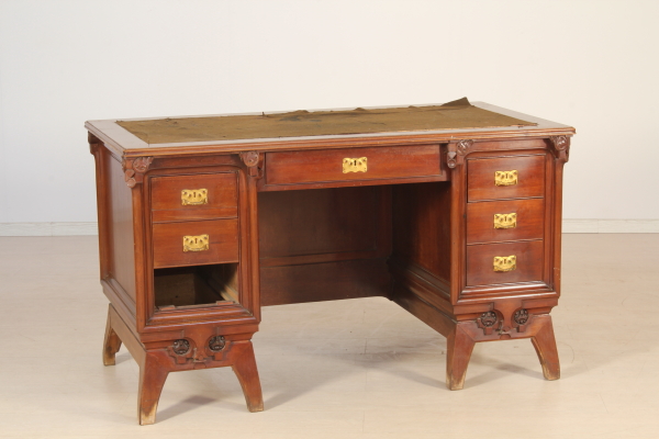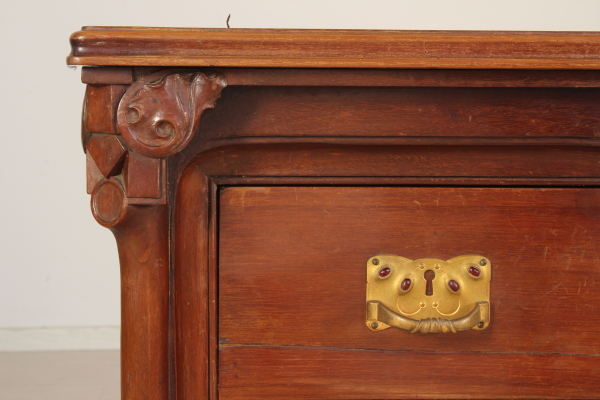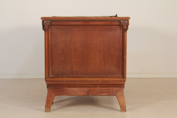 Centralisé, tout droit hors de mistilinei se tient avec les encoches. A deux rangées de trois tiroirs et tiroirs. Plancher en cuir avec une planche de bois. Un tiroir manquant.