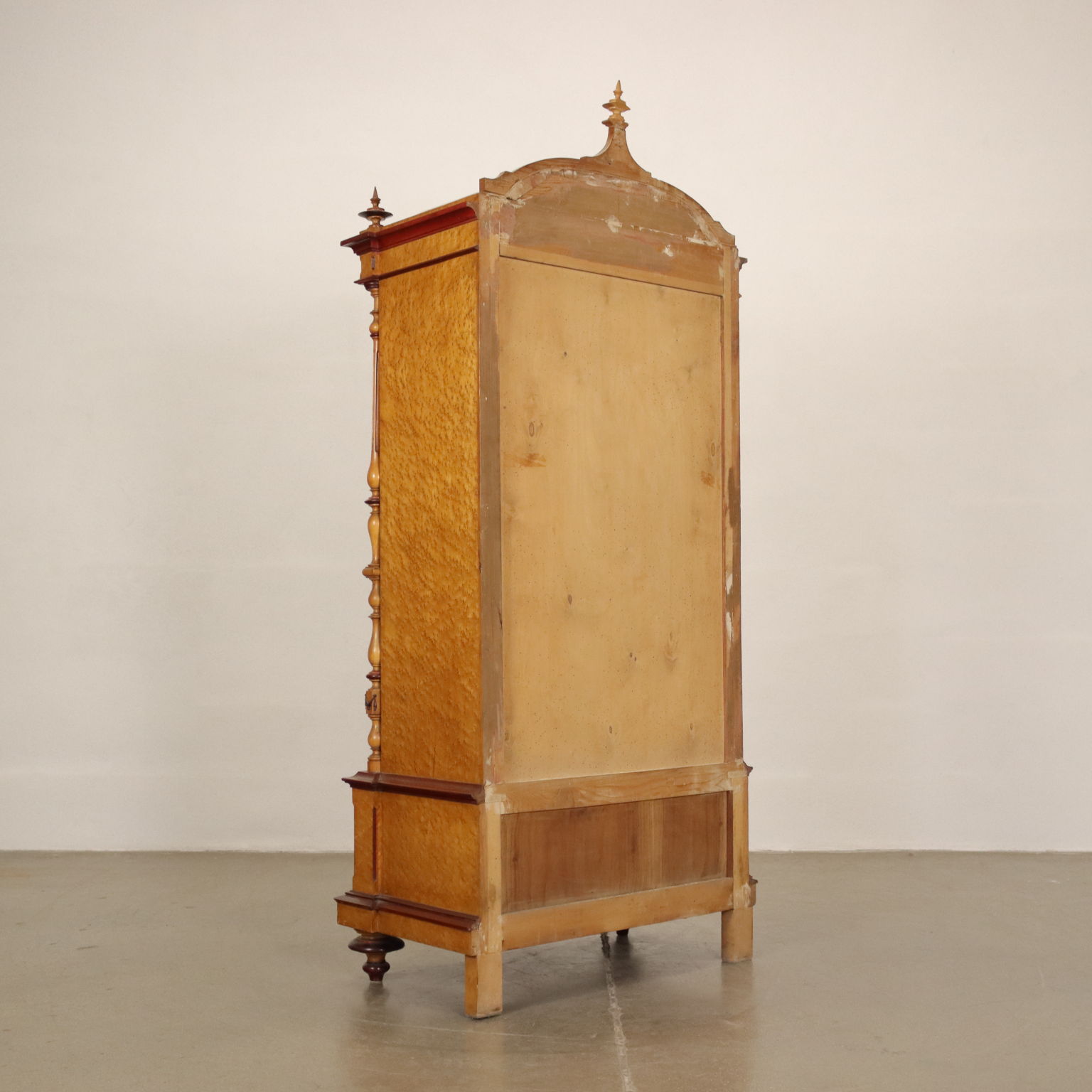 Vitrine Umbertine en érable et loupe d'érable, Italie, fin XIXe siècle. Façade à deux portes vitrées et tiroir encadrés par des cadres, montants tournés et pieds de toupie en façade. Intérieur en merisier avec étagères en sapin.